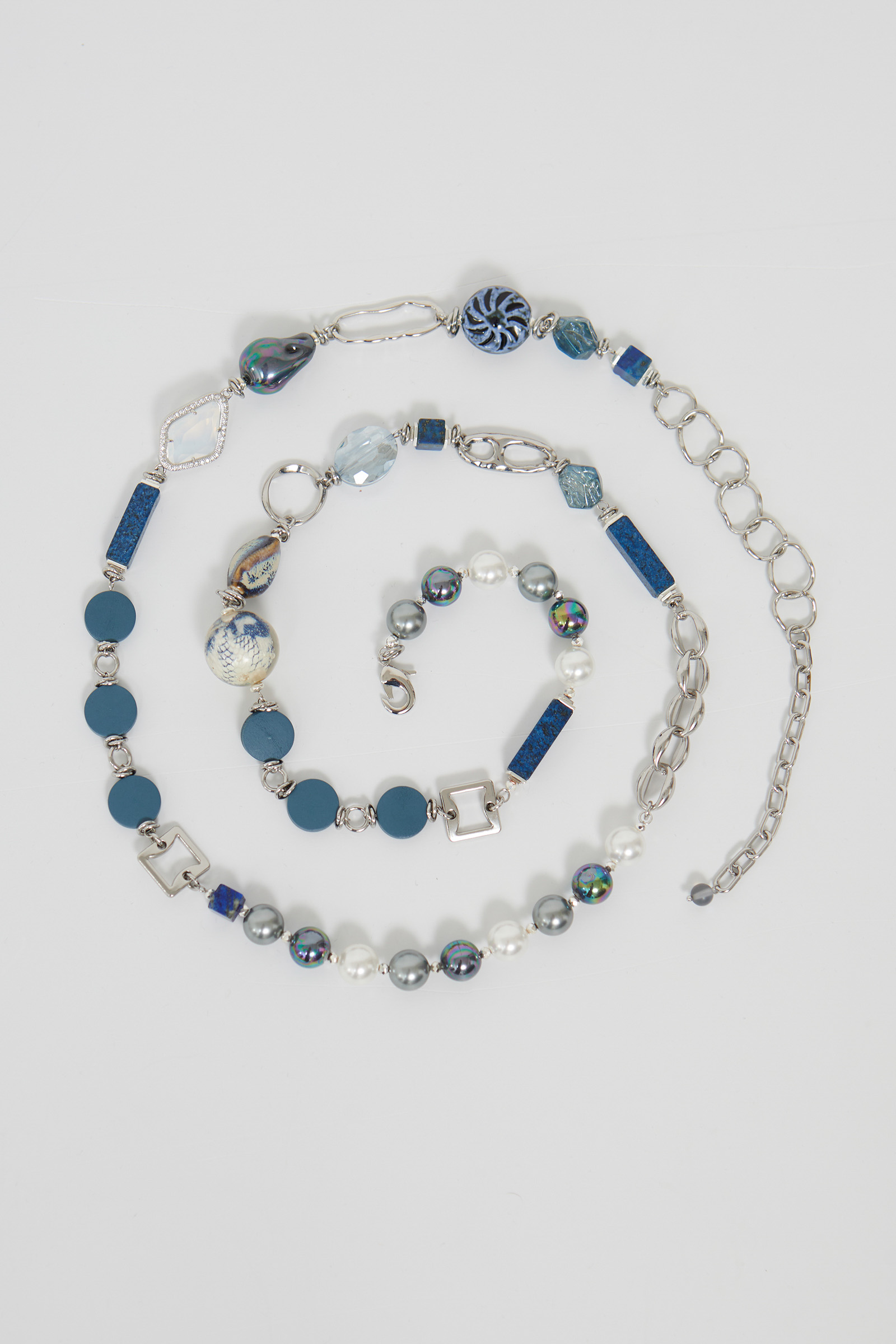 Длинное комбинированное колье с натуральными камнями и культивированным жемчугом.