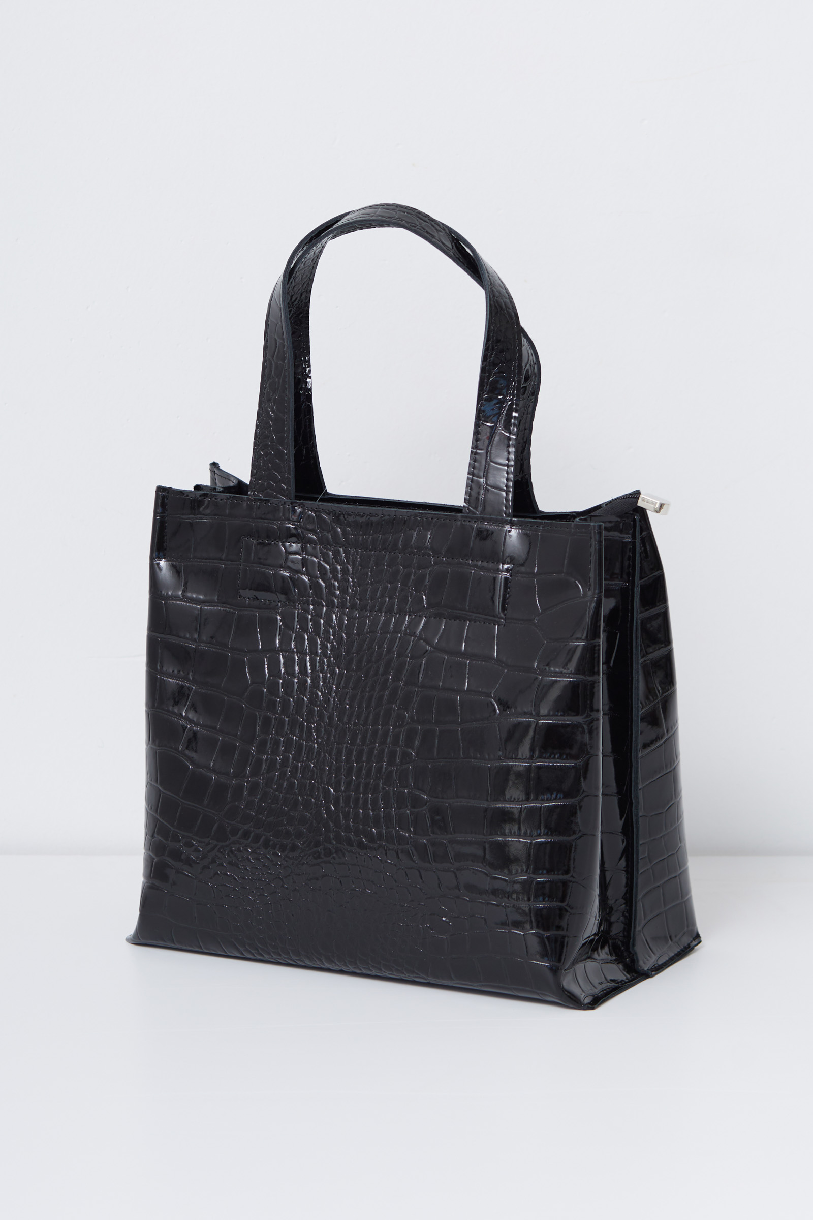 Сумка-тоут из натуральной лакированной кожи с тиснением под рептилию. Один боковой карман на молнии. Основное отделение со внутренним карманом на молнии.