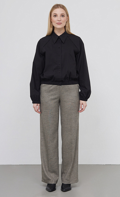 Блуза из вискозы с контрастным принтом в горошек и трикотажной отделкой.