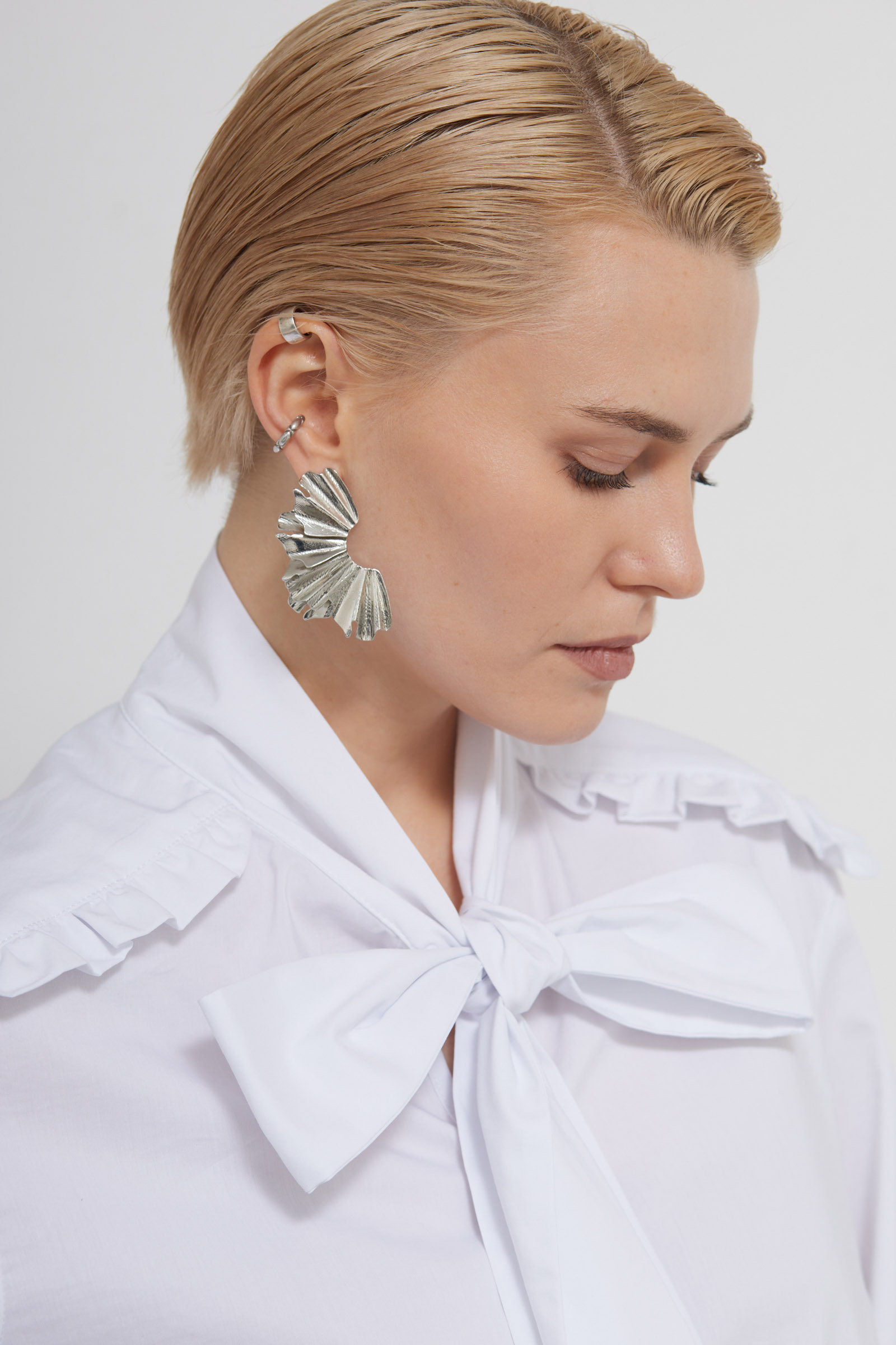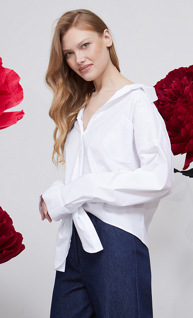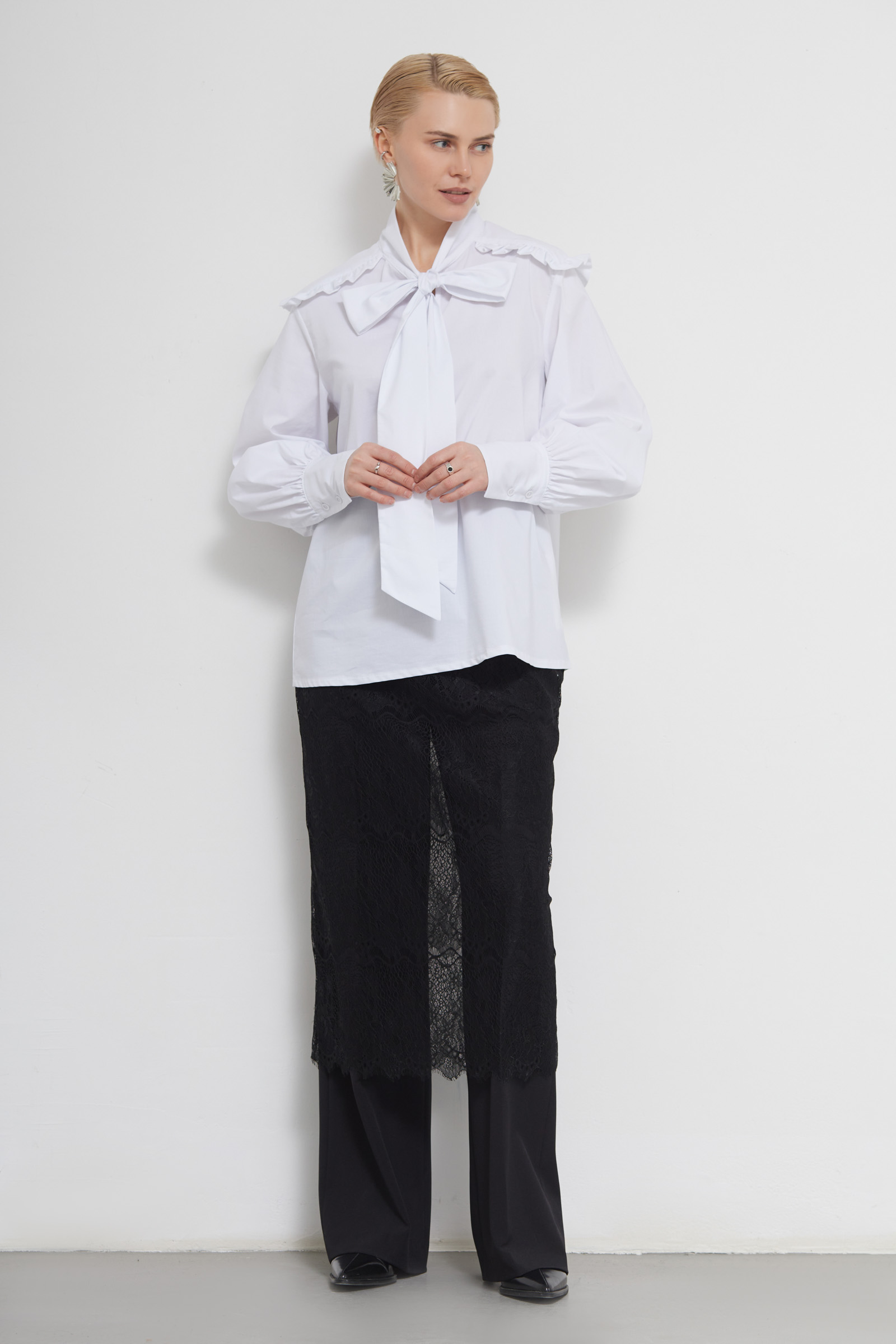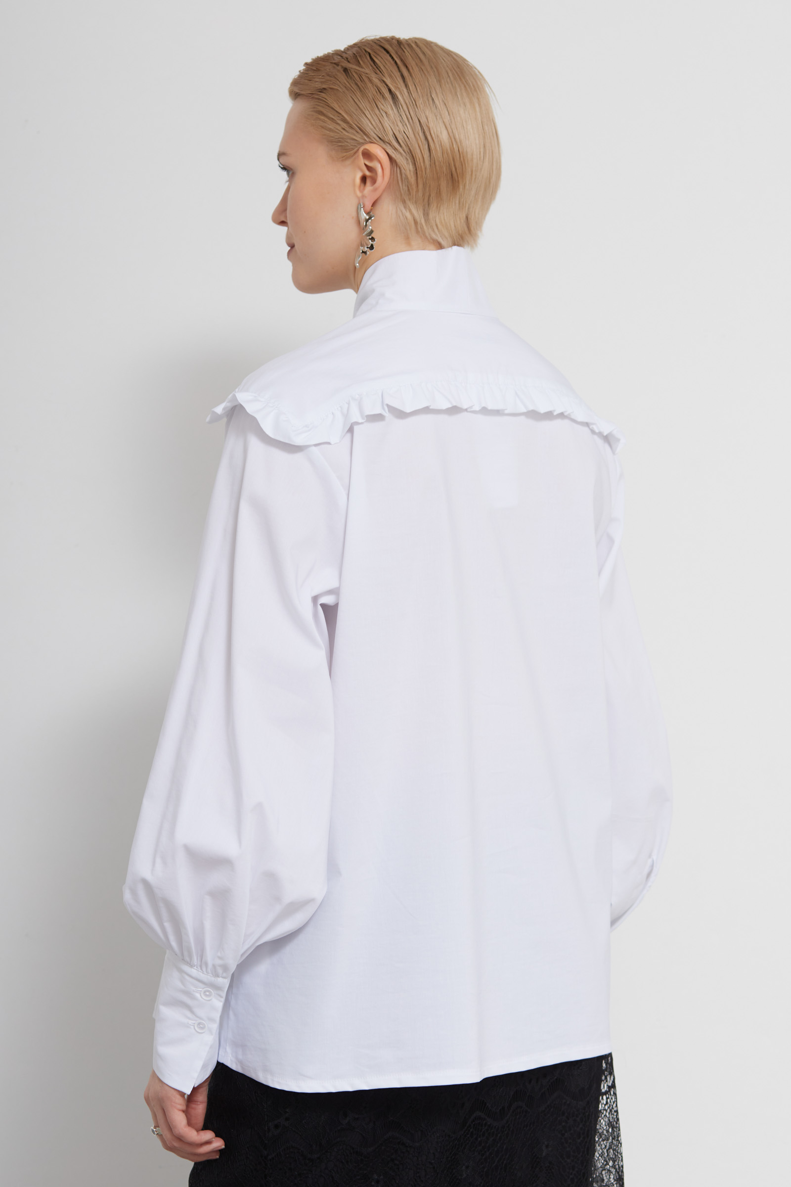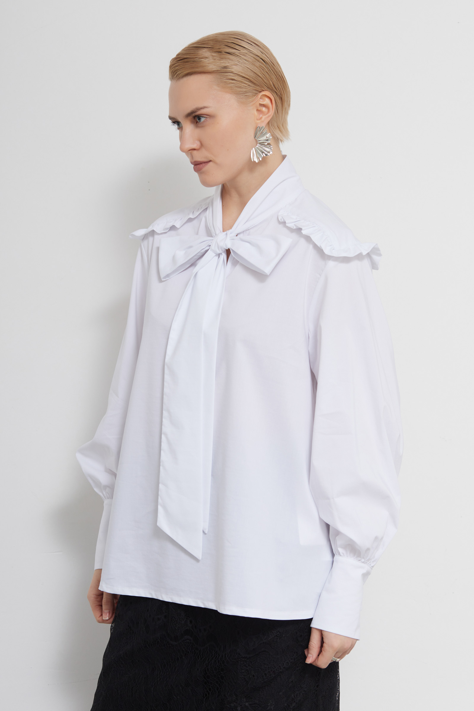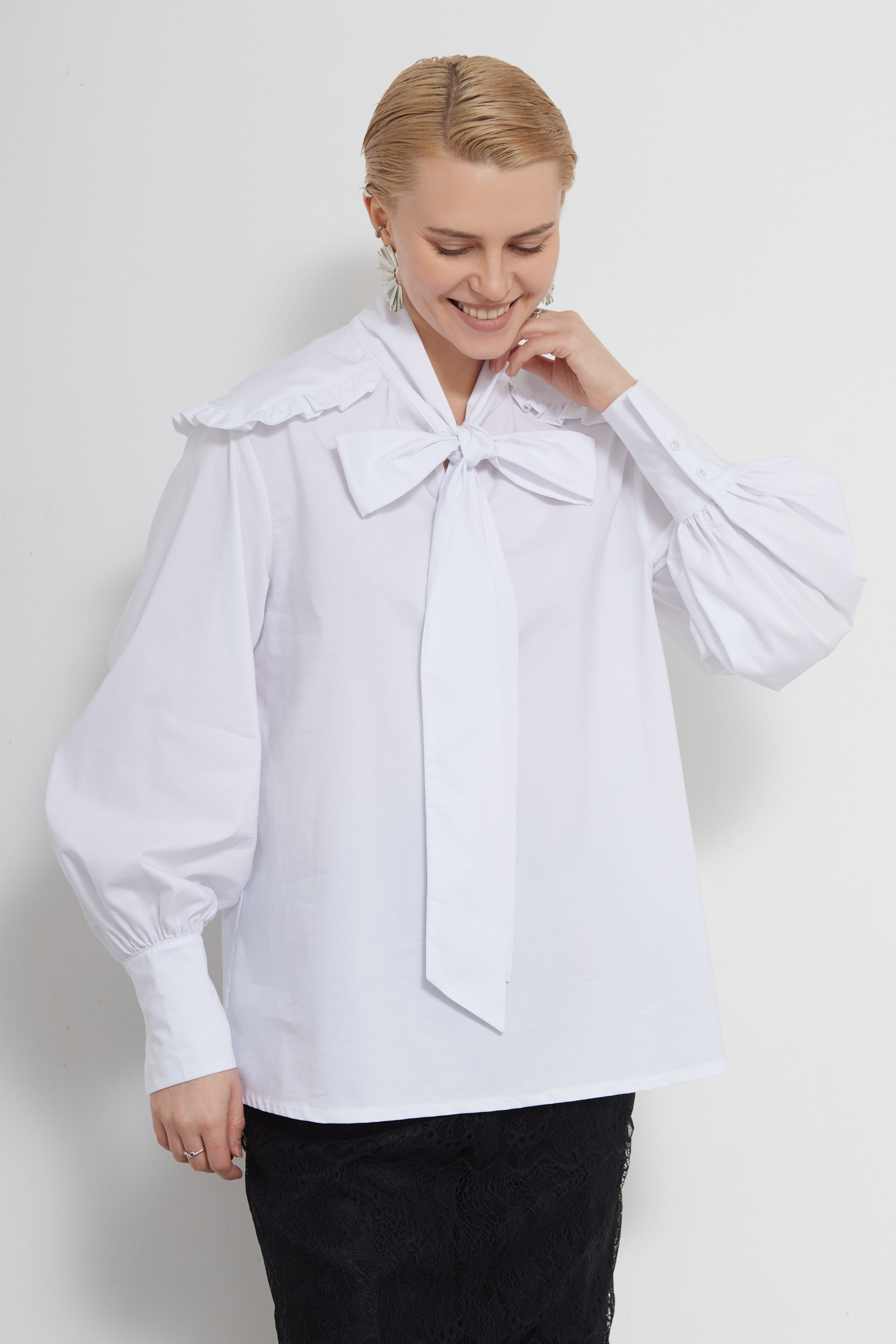 Блуза oversize из хлопка с воротником-аскот, рукавами-буфами и кокеткой с оборками.