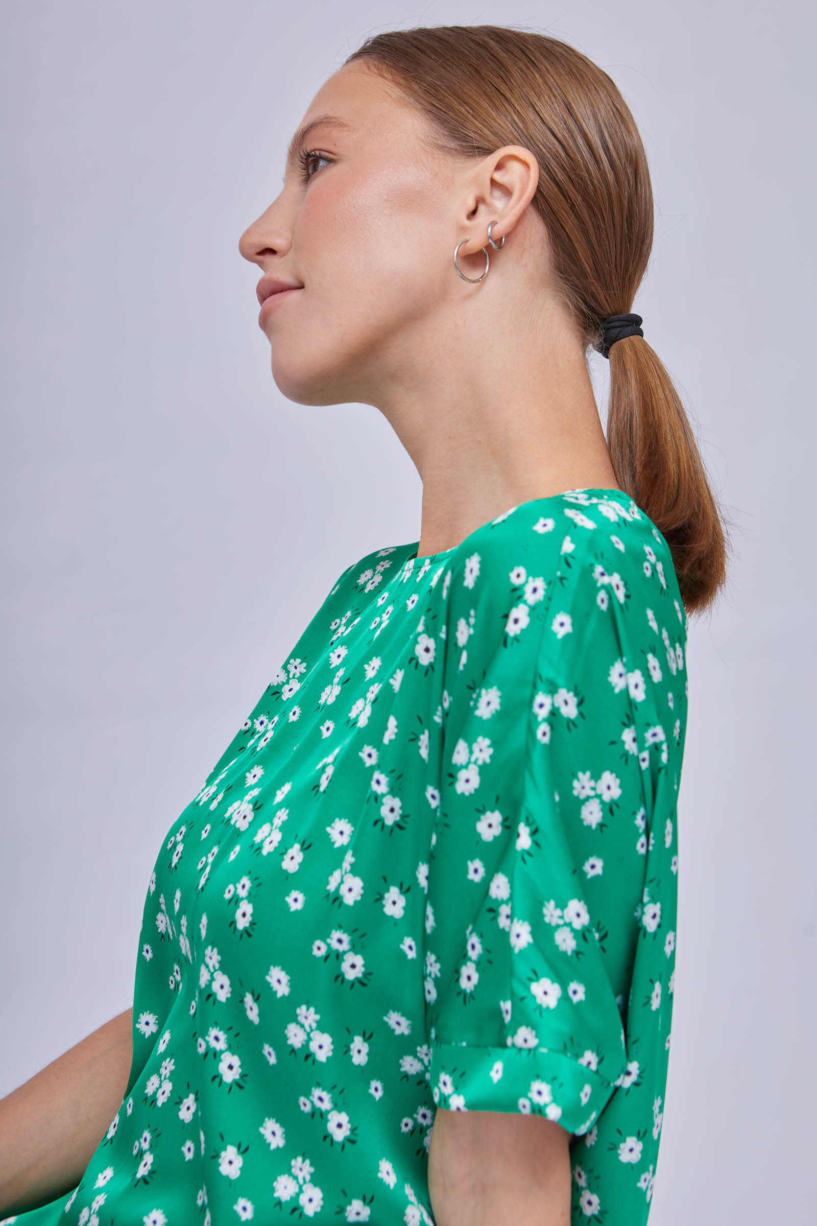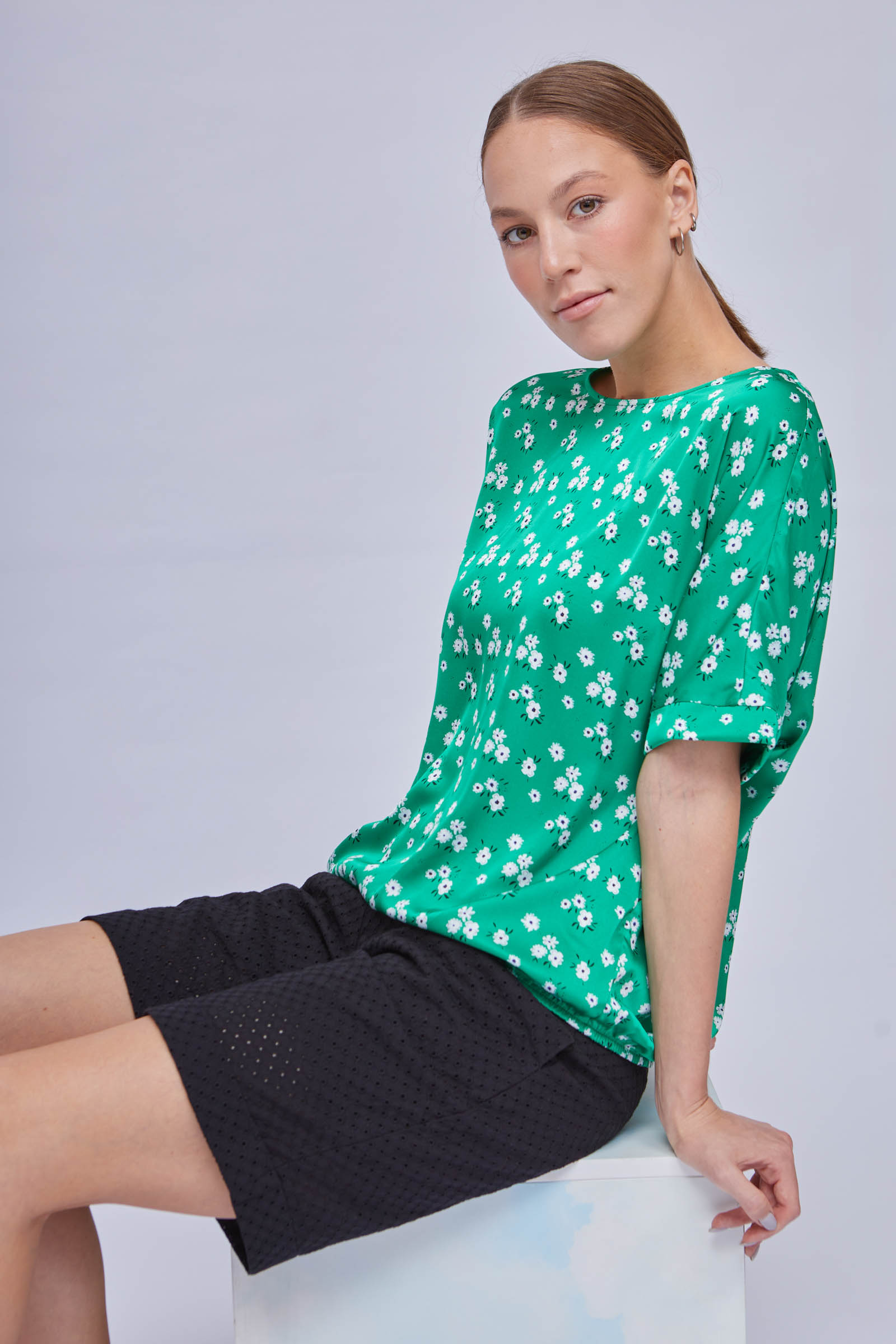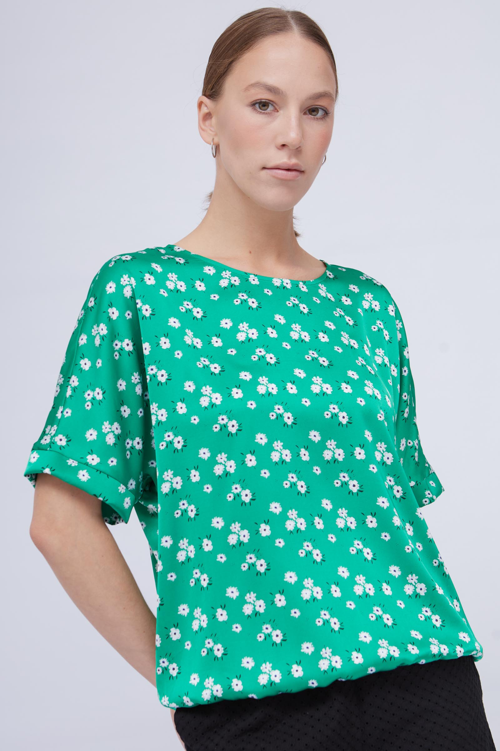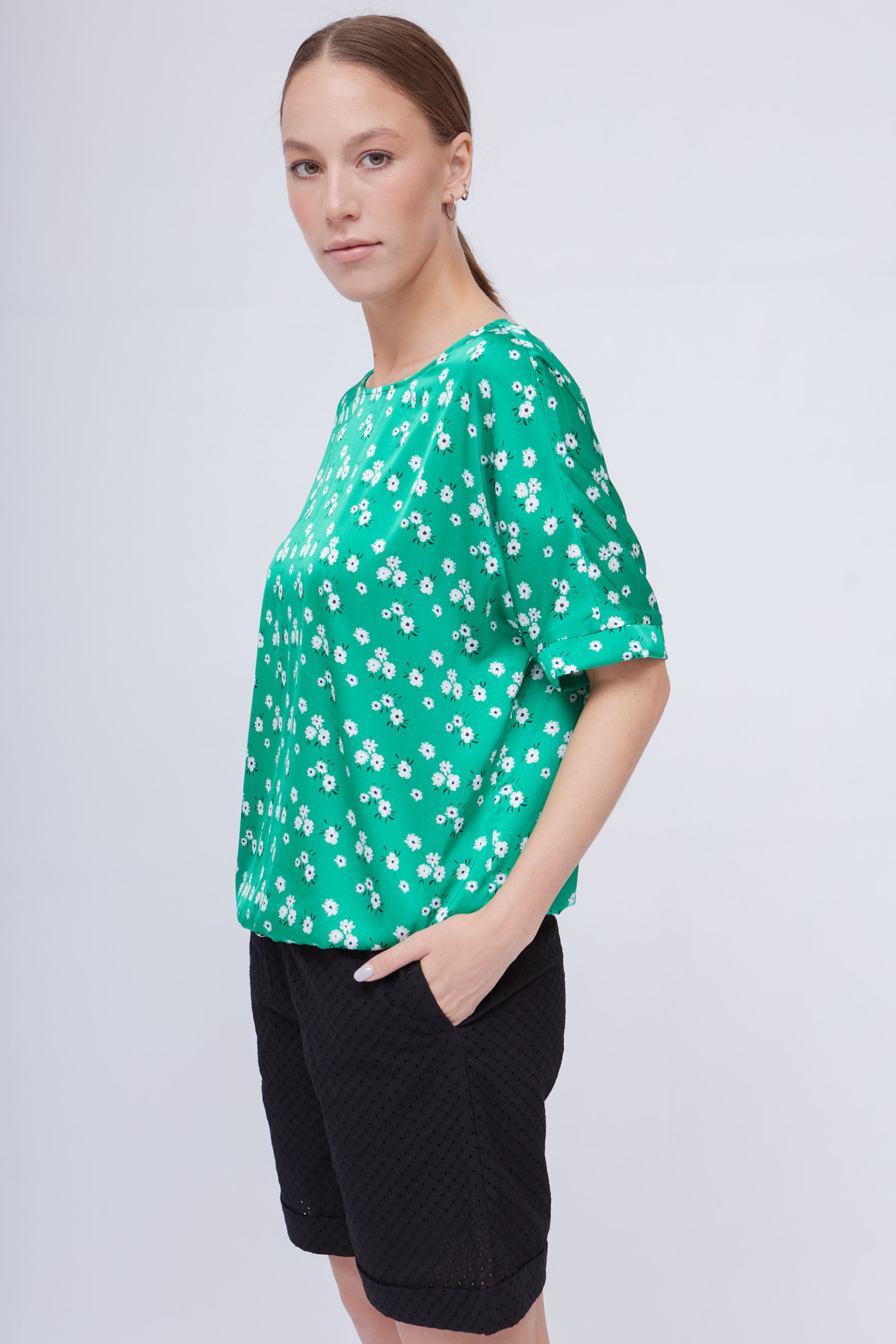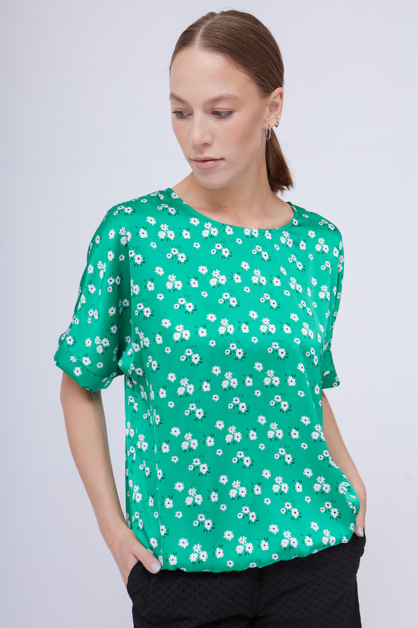 Блузка из атласа с цветочным принтом и резинкой по низу.