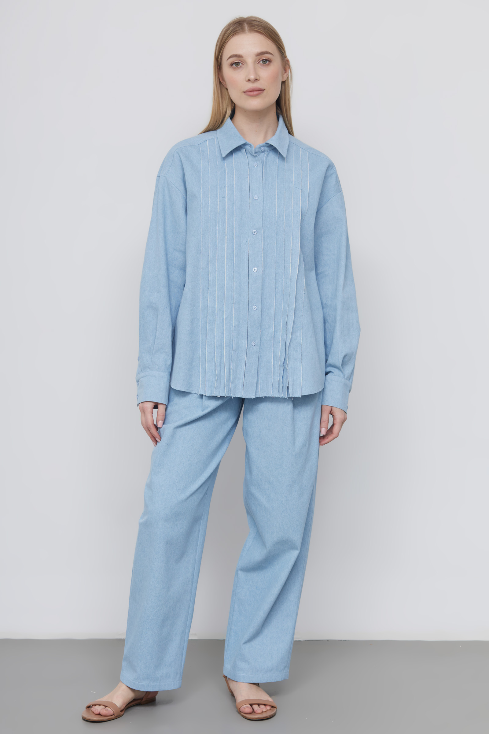 Рубашка oversize из тонкого денима с рюшами по переду.