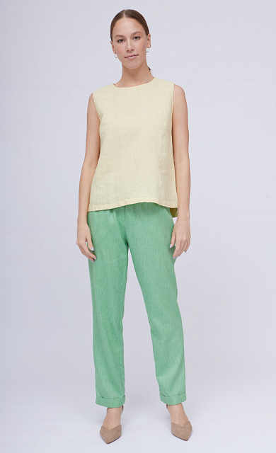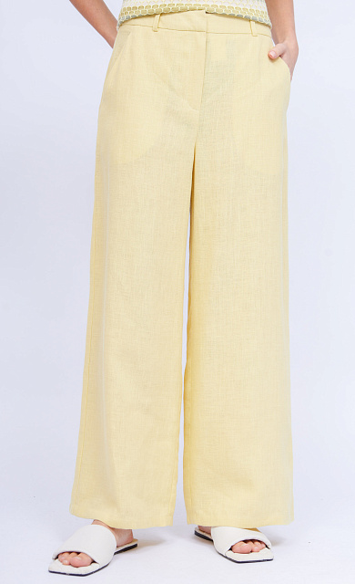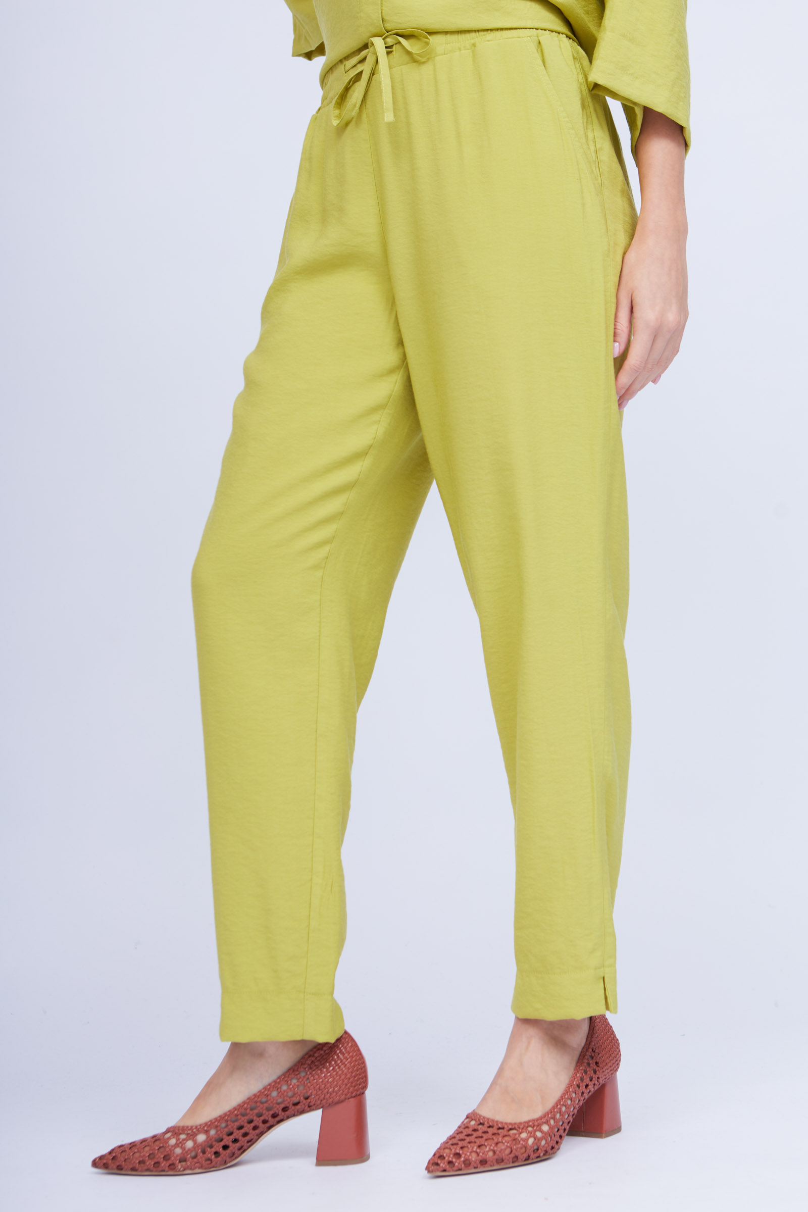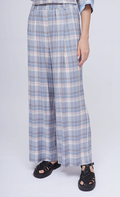 Брюки-бананы из фактурной вискозы на эластичном поясе с кулиской.