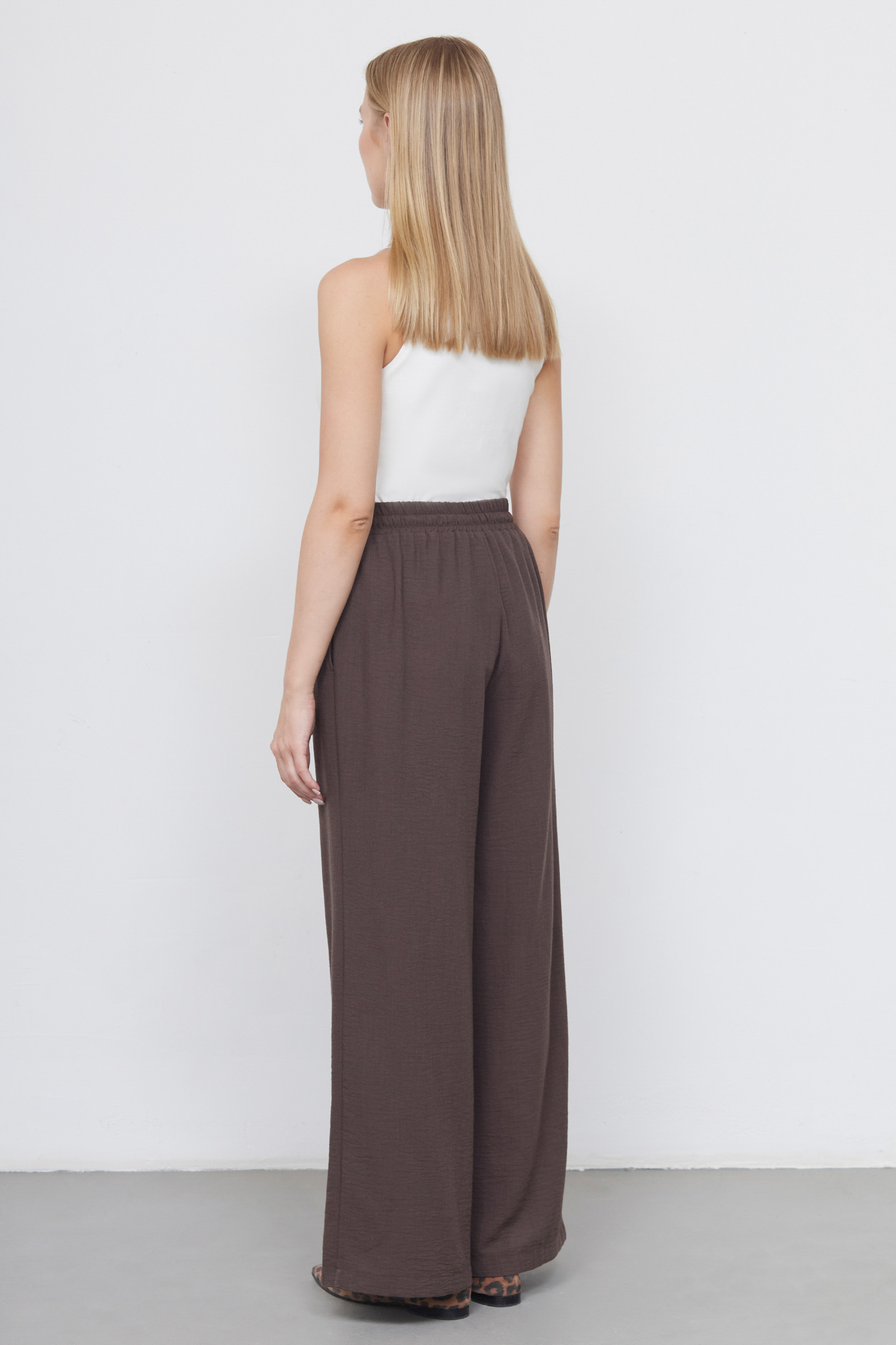 Широкие брюки из фактурной ткани на эластичном поясе с кулиской.