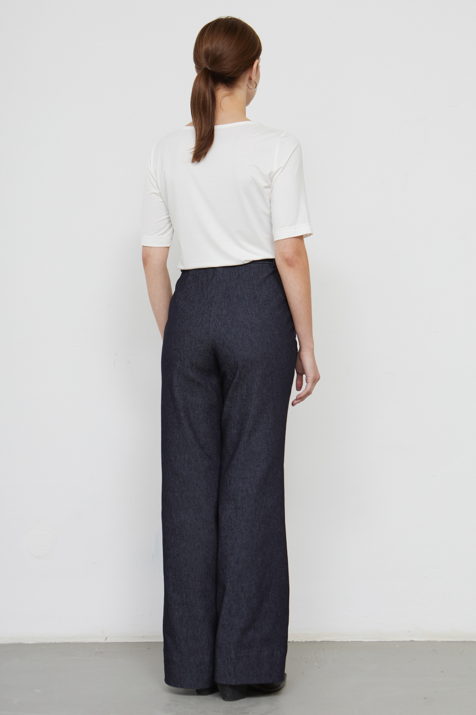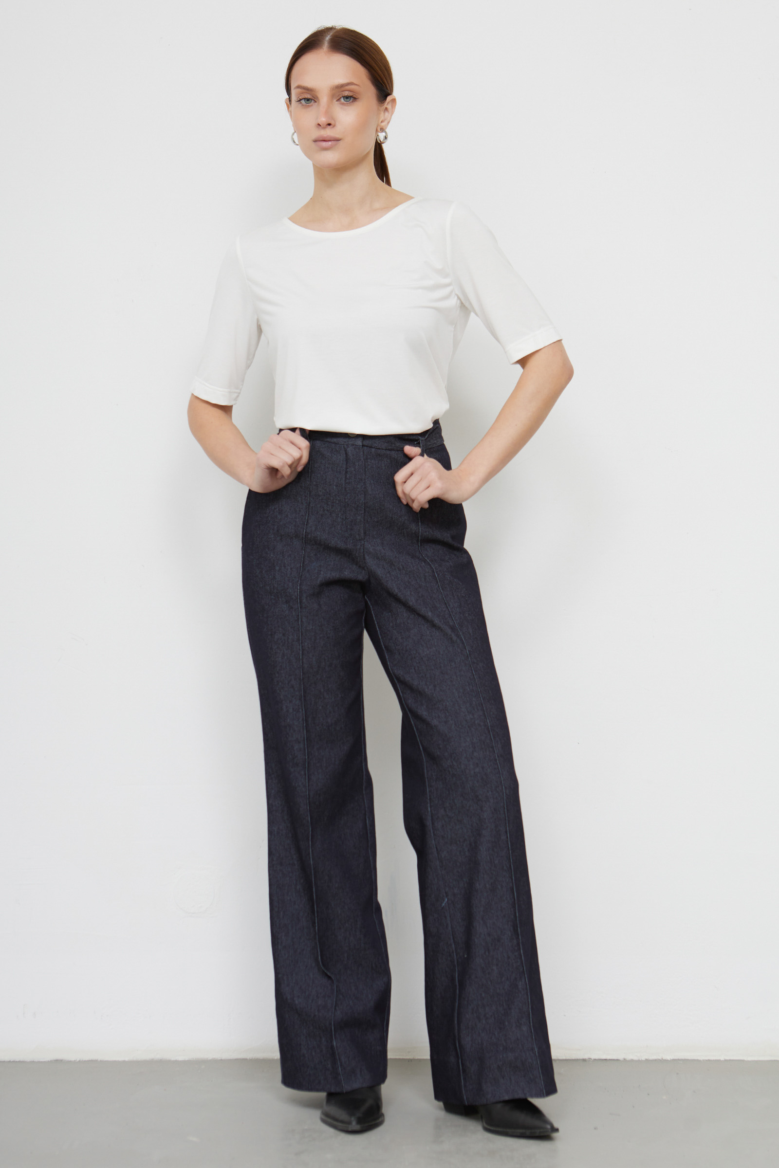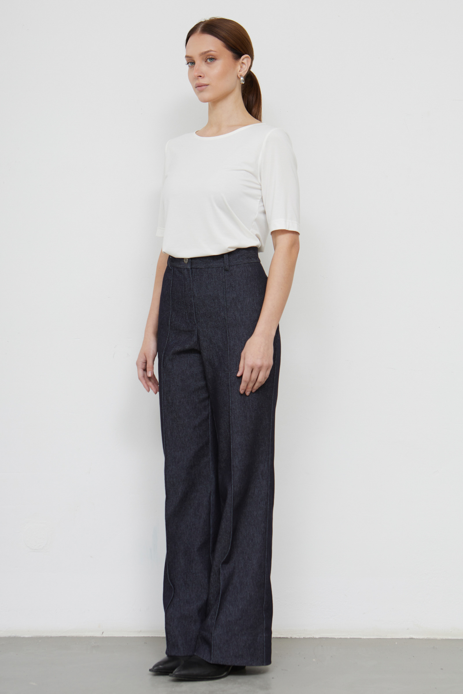 Широкие брюки из меланжевого денима со стрелками.