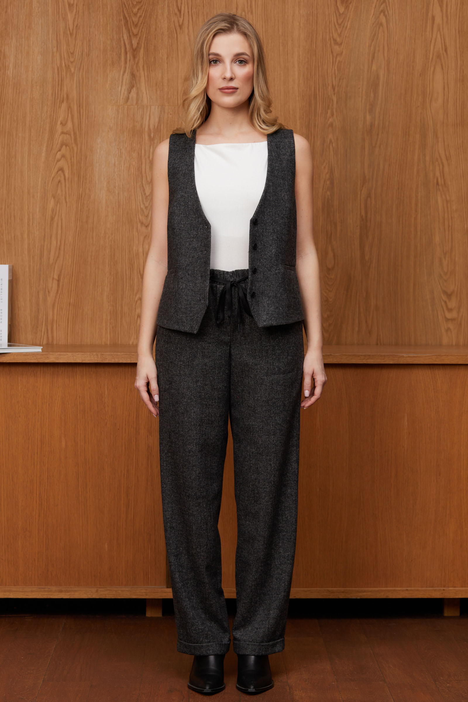 Прямые брюки из костюмной меланжевой ткани с шерстью на эластичном поясе.