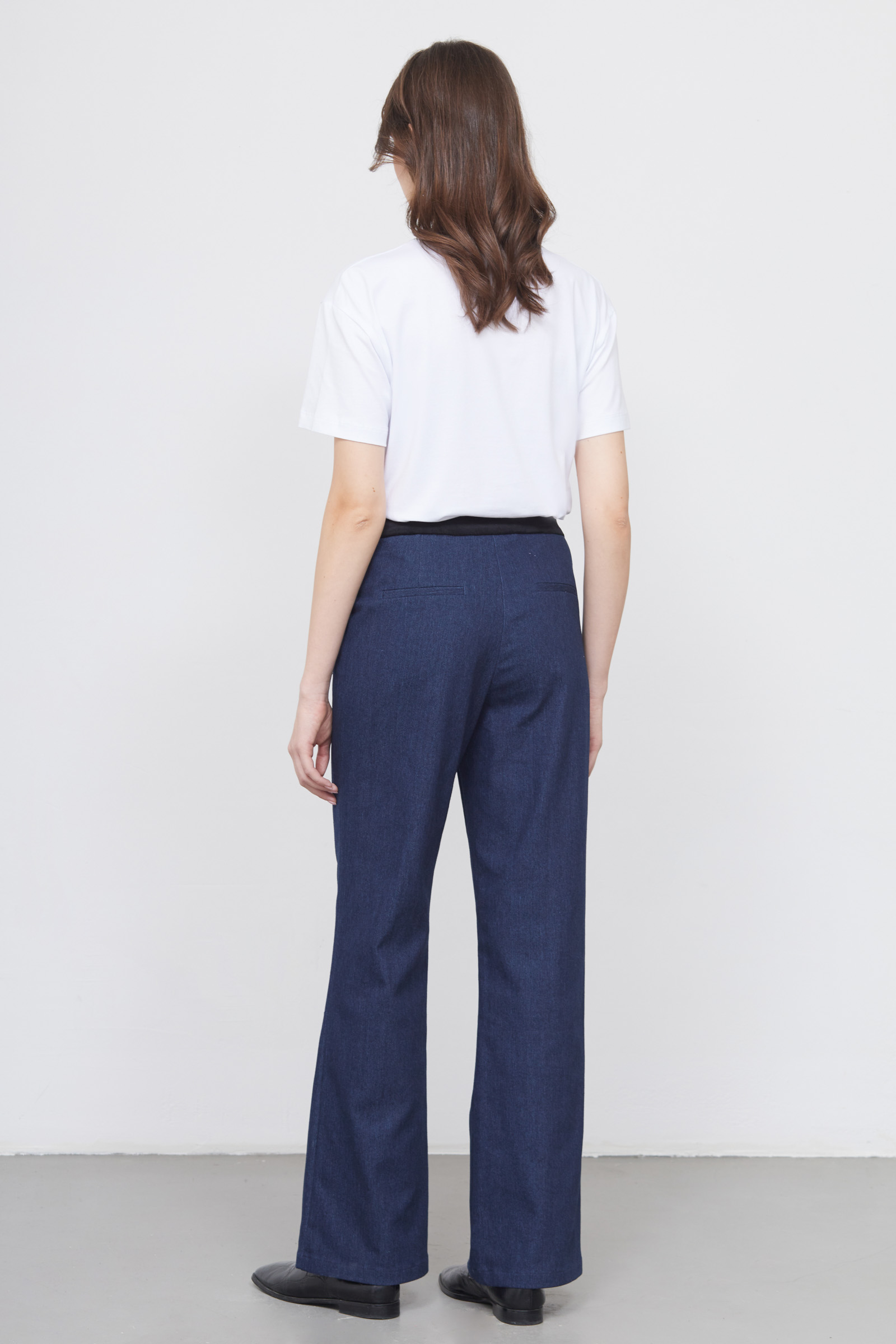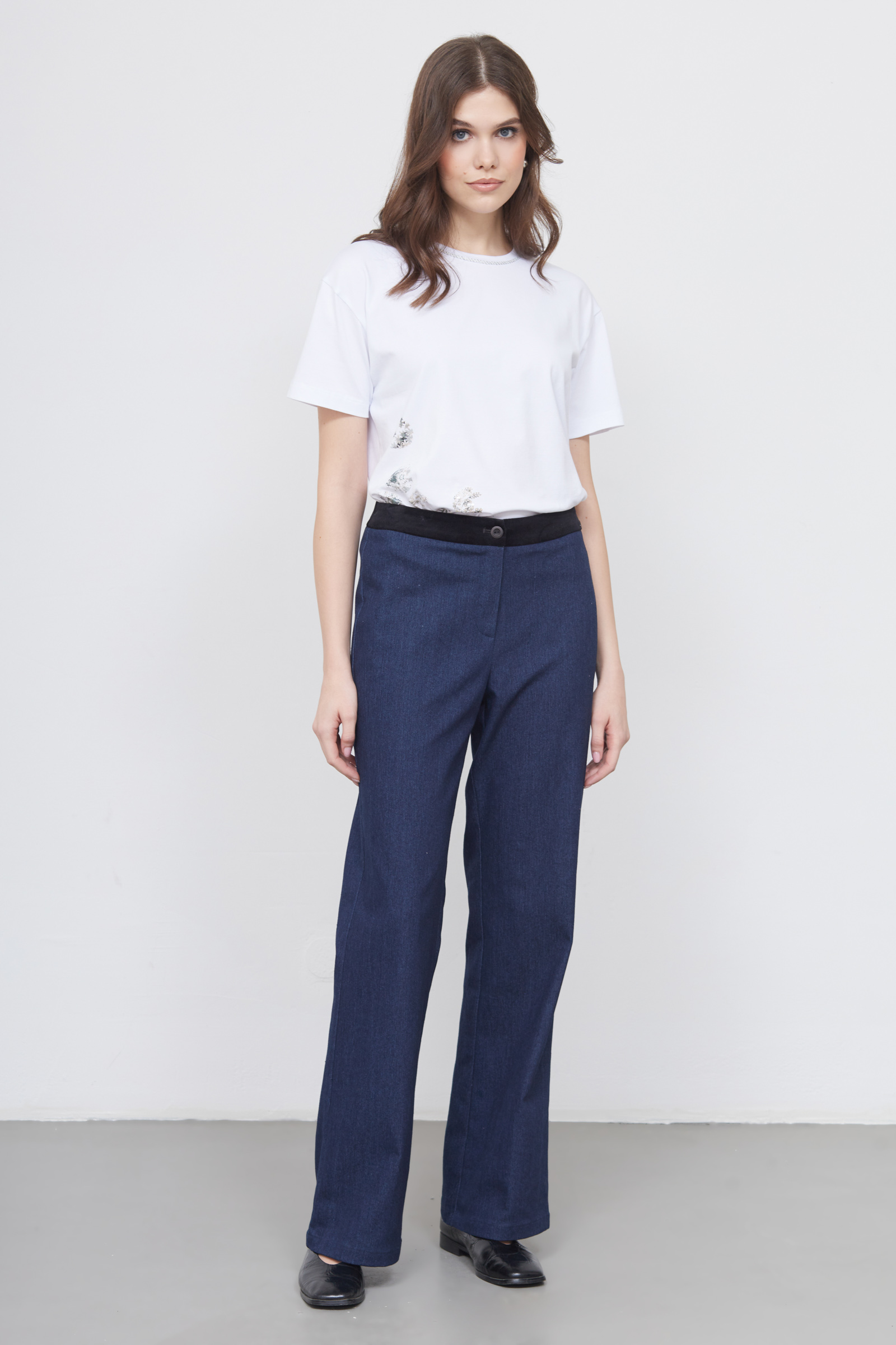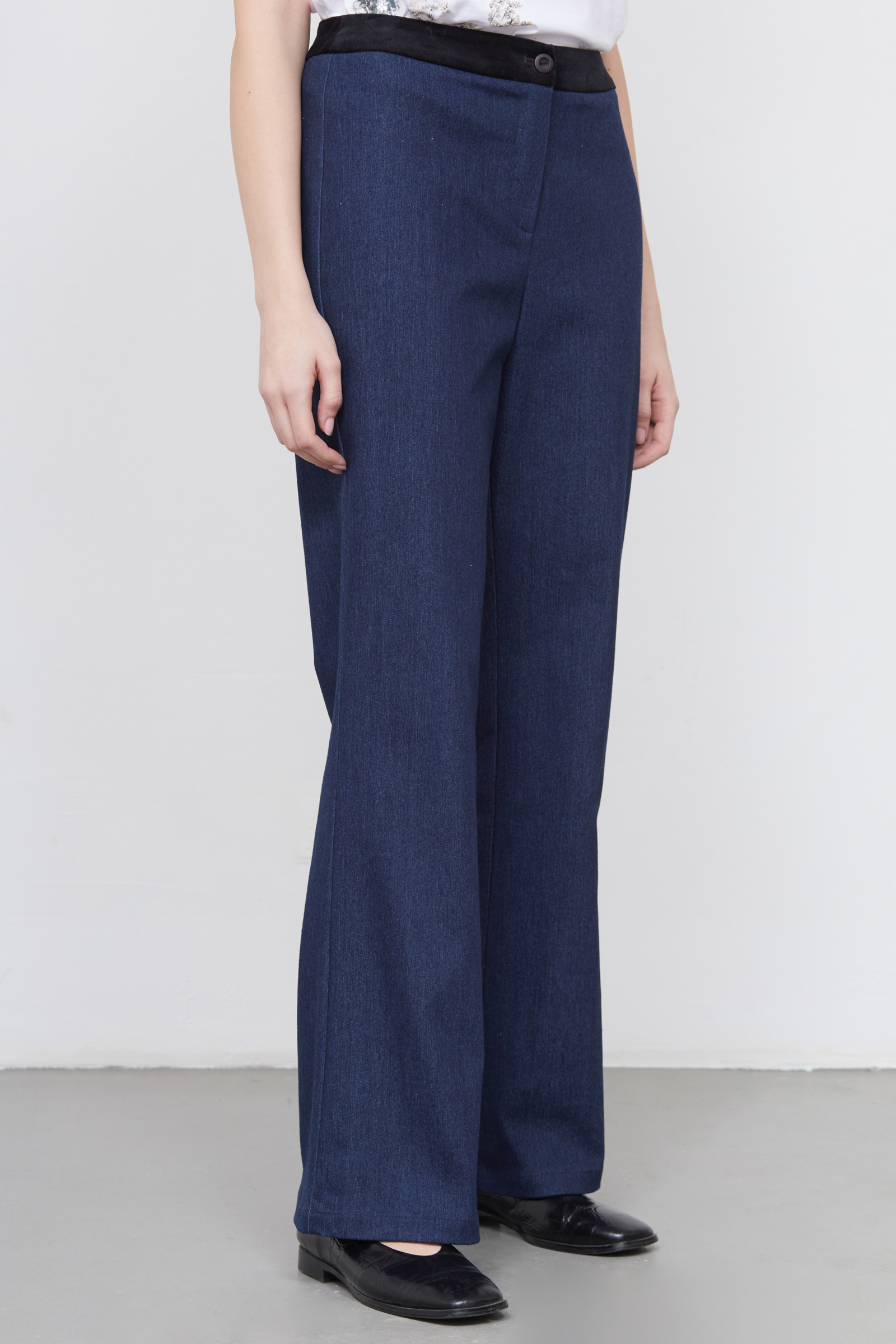 Слегка расклешенные брюки из денима с бархатным поясом.