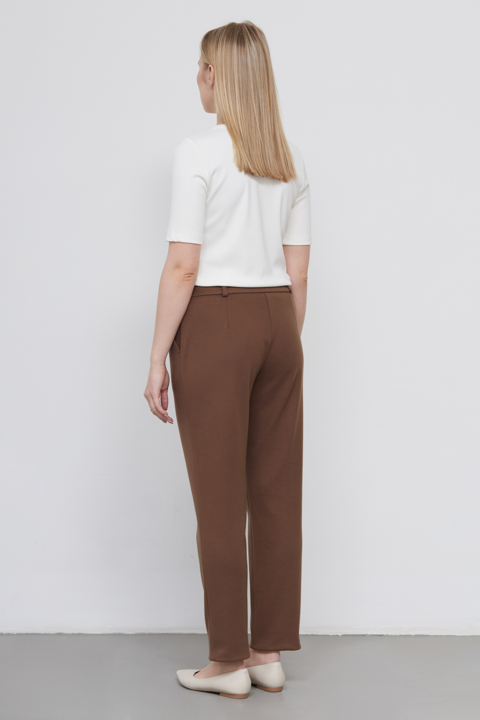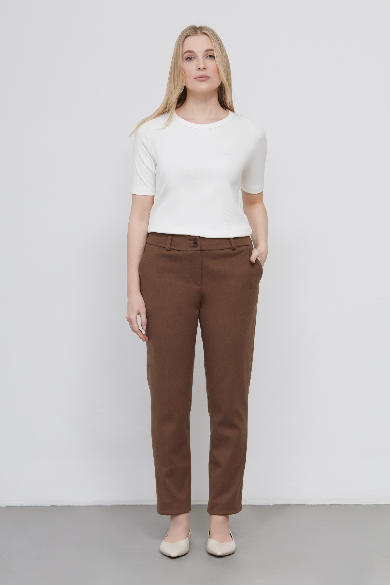 Классические зауженные брюки со стрелками из утепленного трикотажа.