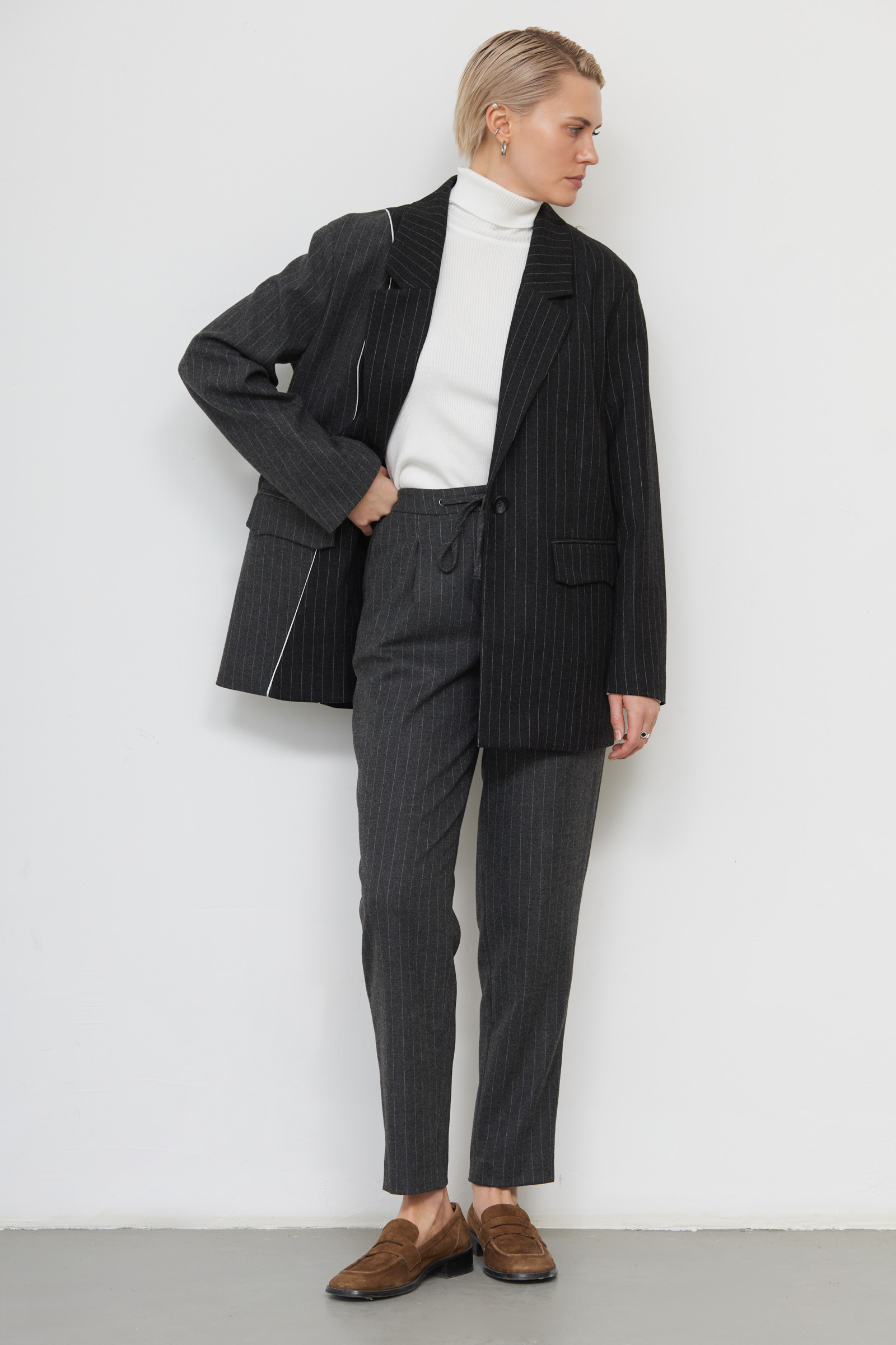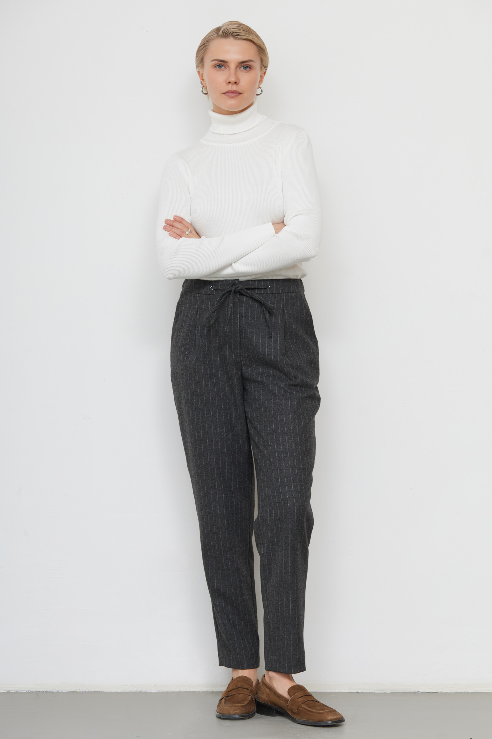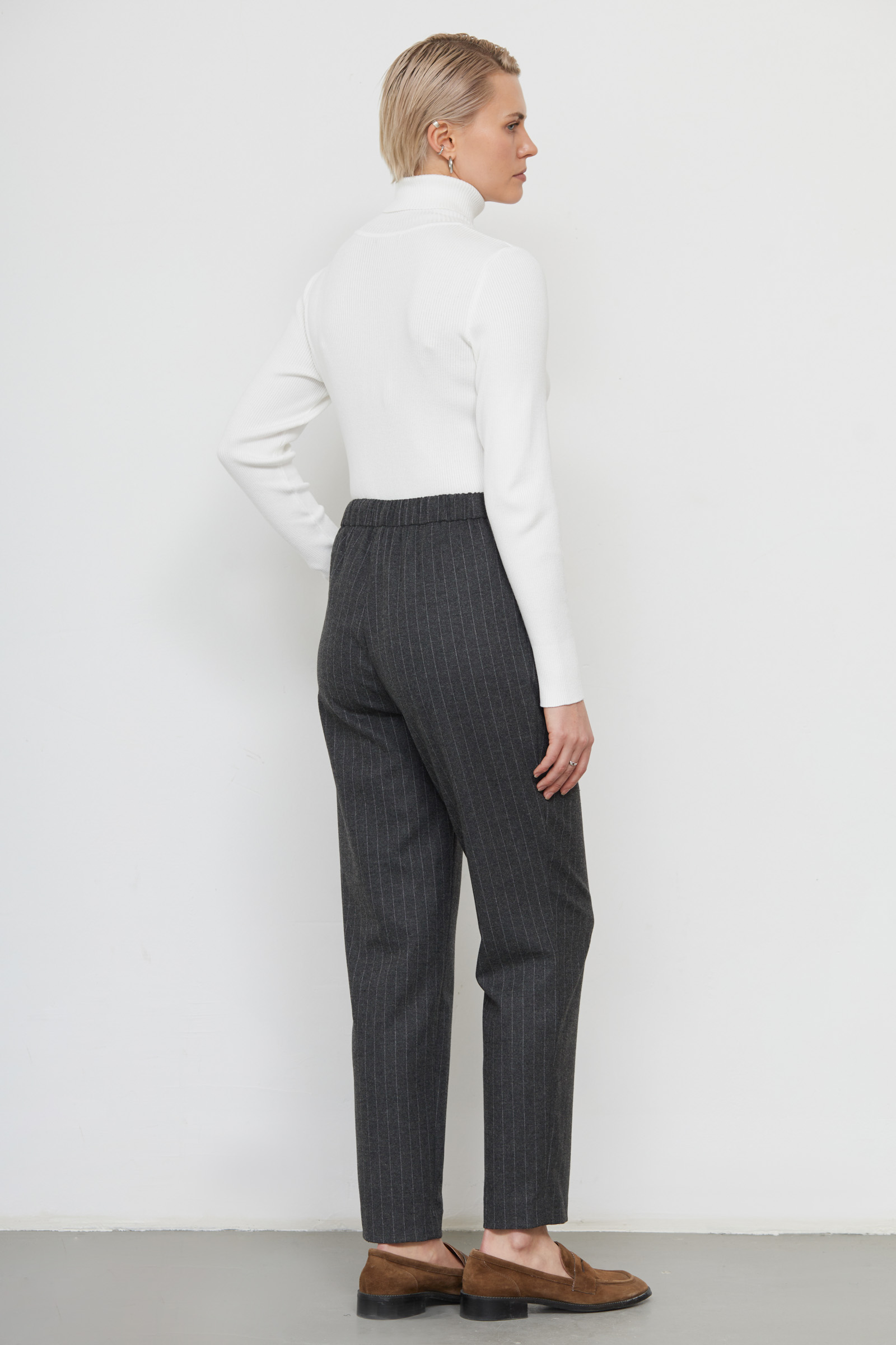 Слегка зауженные брюки в полоску из мягкой костюмной ткани с шерстью.