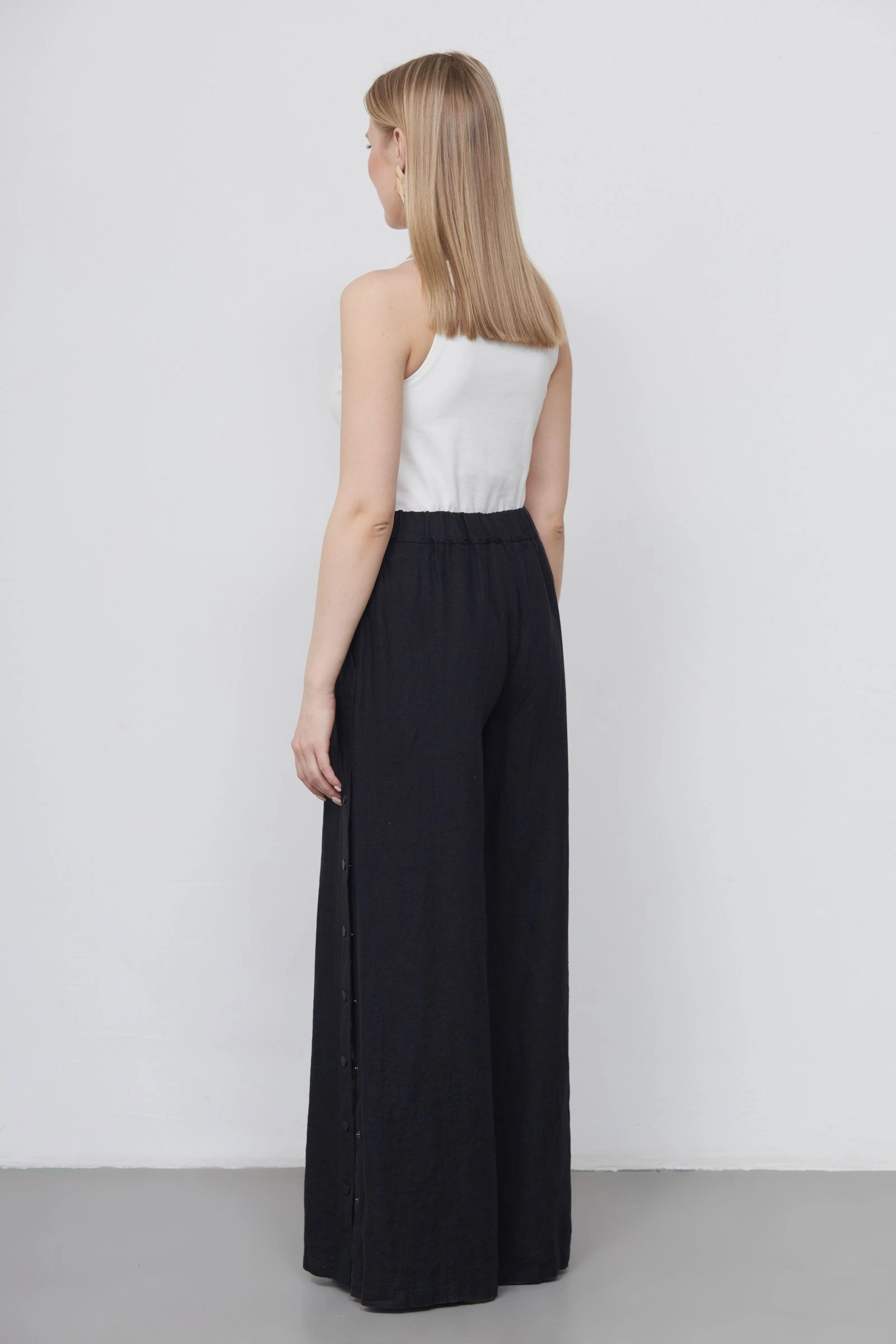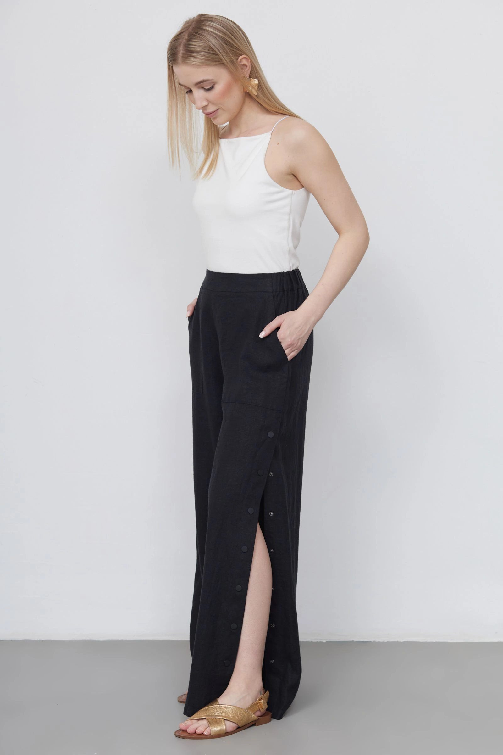 Широкие льняные брюки на эластичном поясе с разрезом на кнопках сбоку.