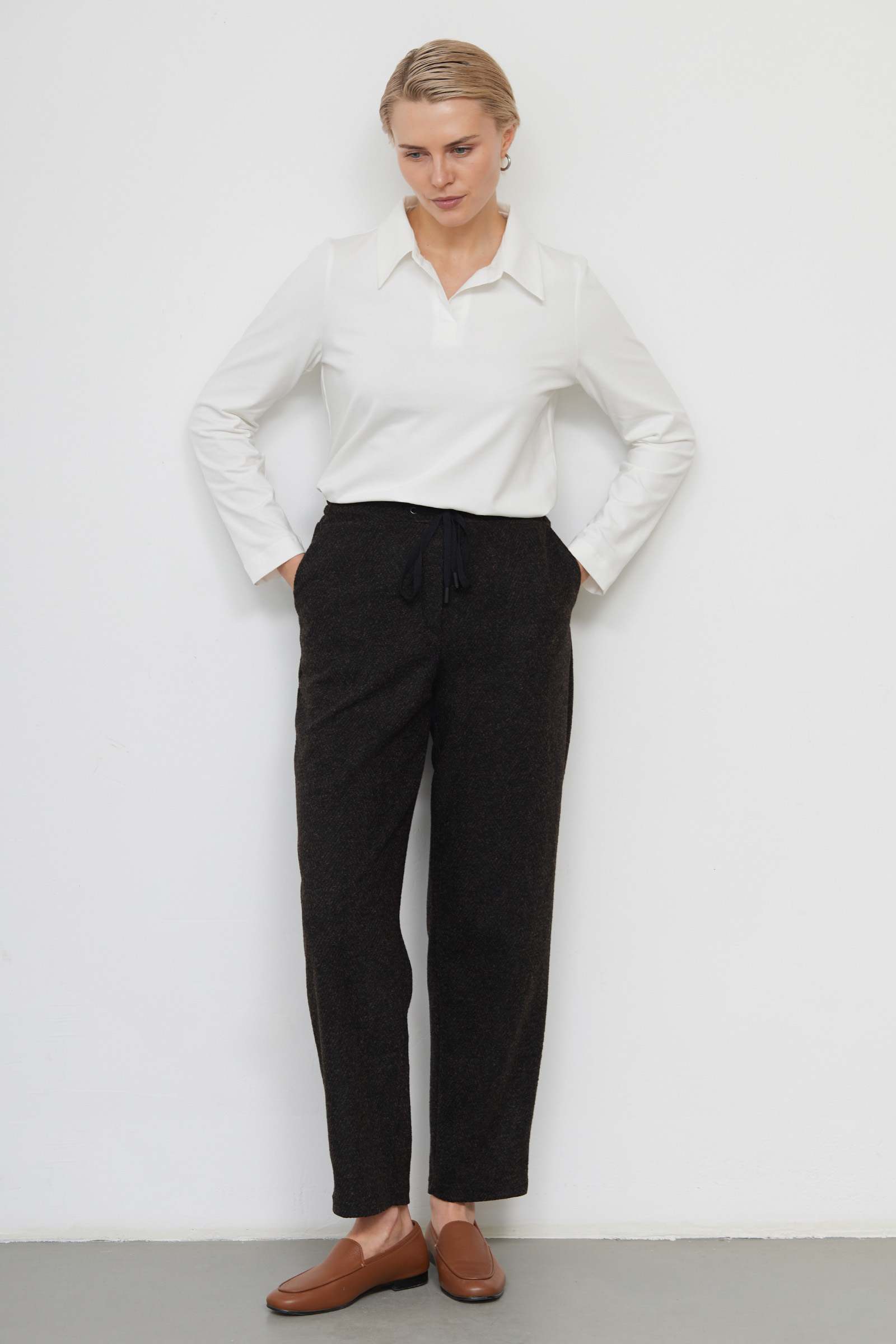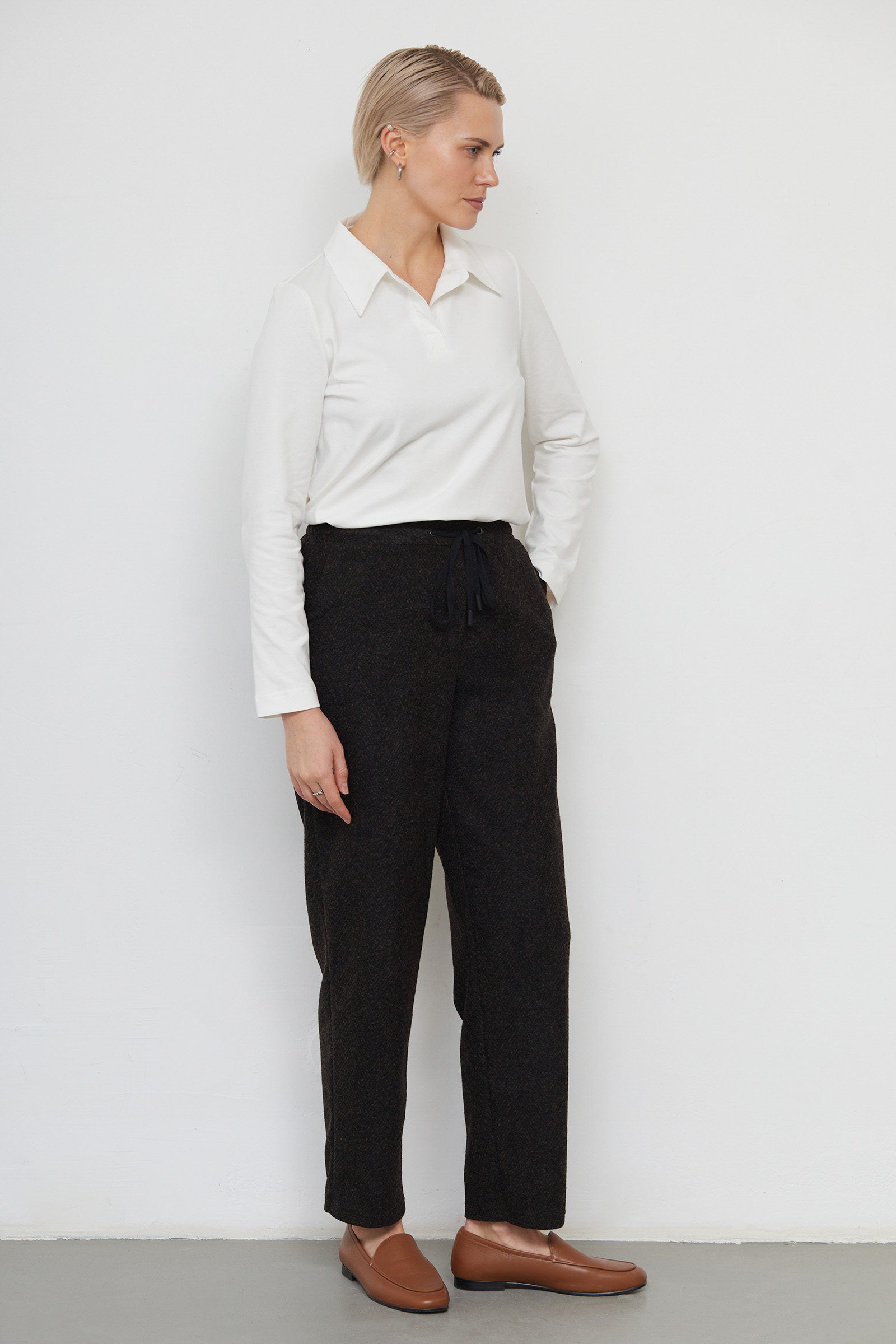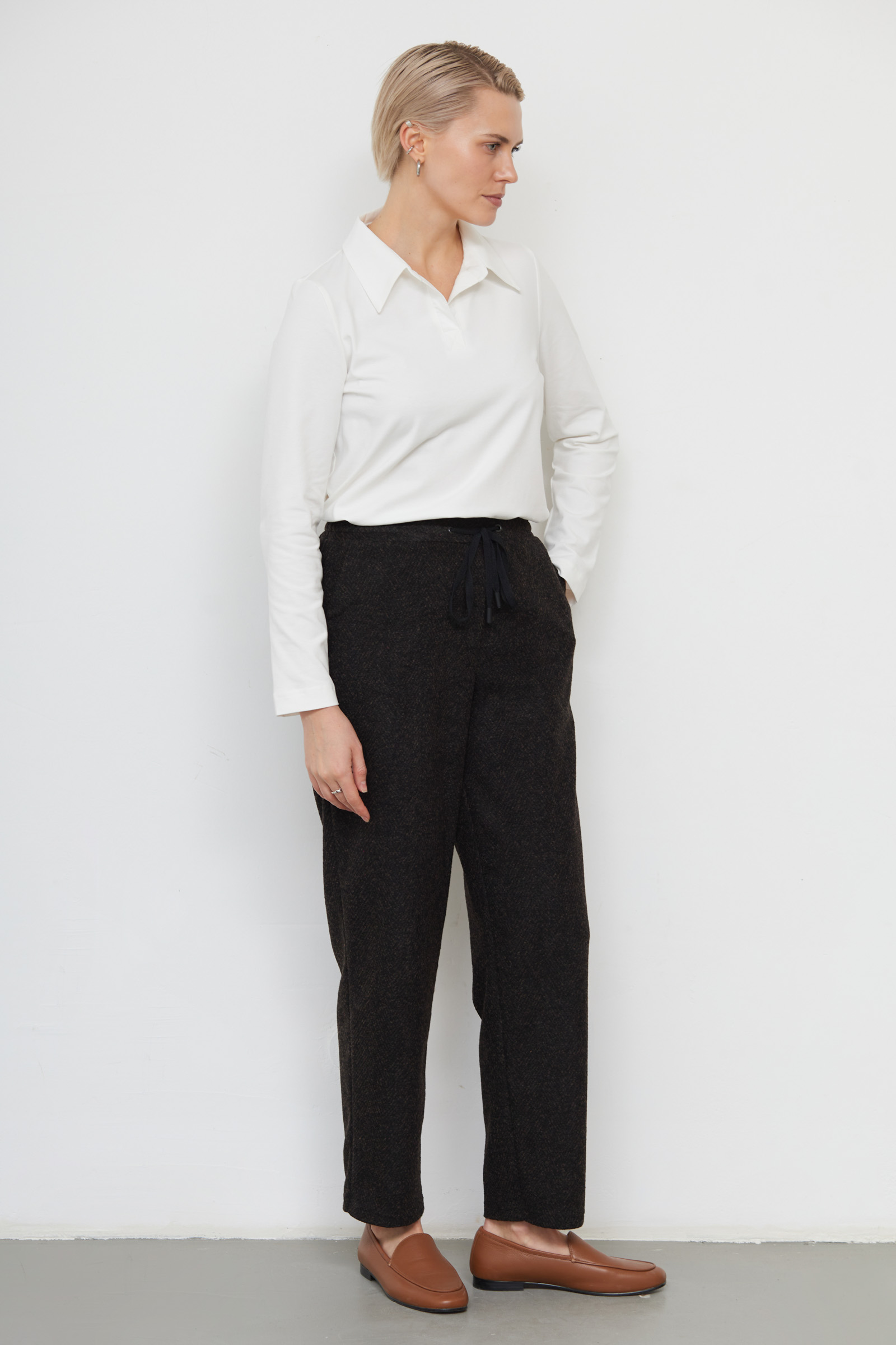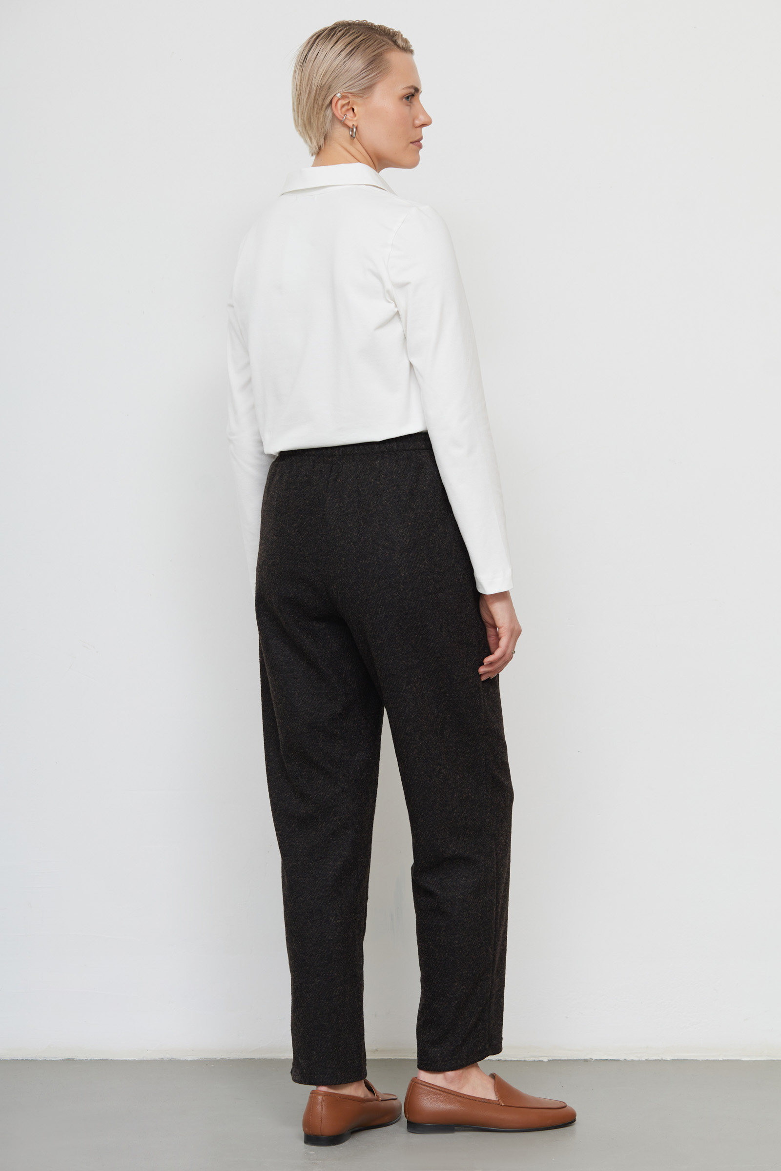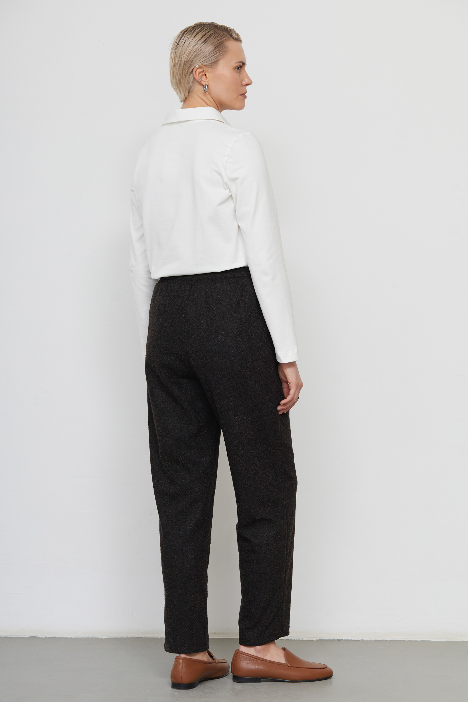 Слегка зауженные брюки из костюмной ткани в елочку на эластичном поясе с кулиской.