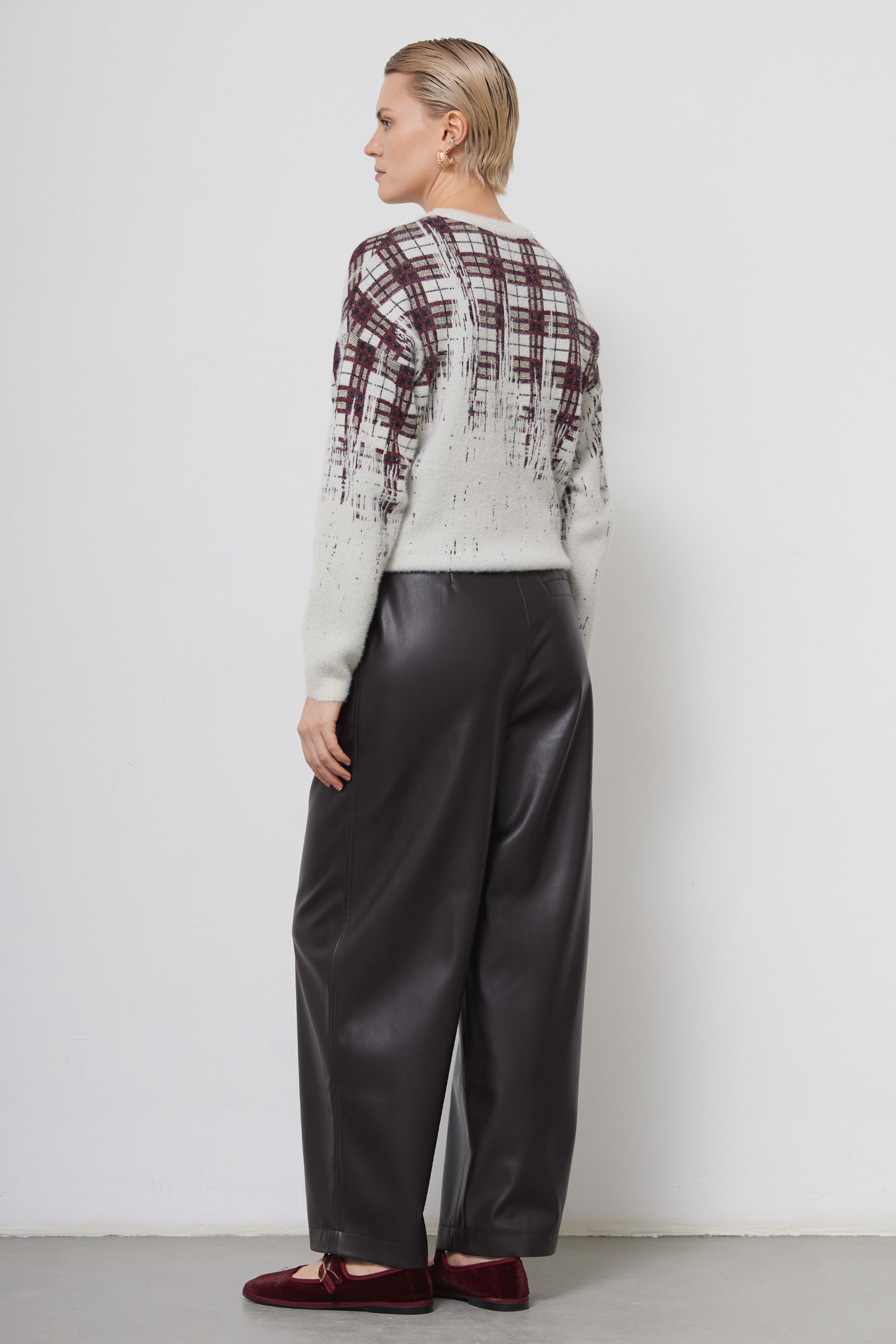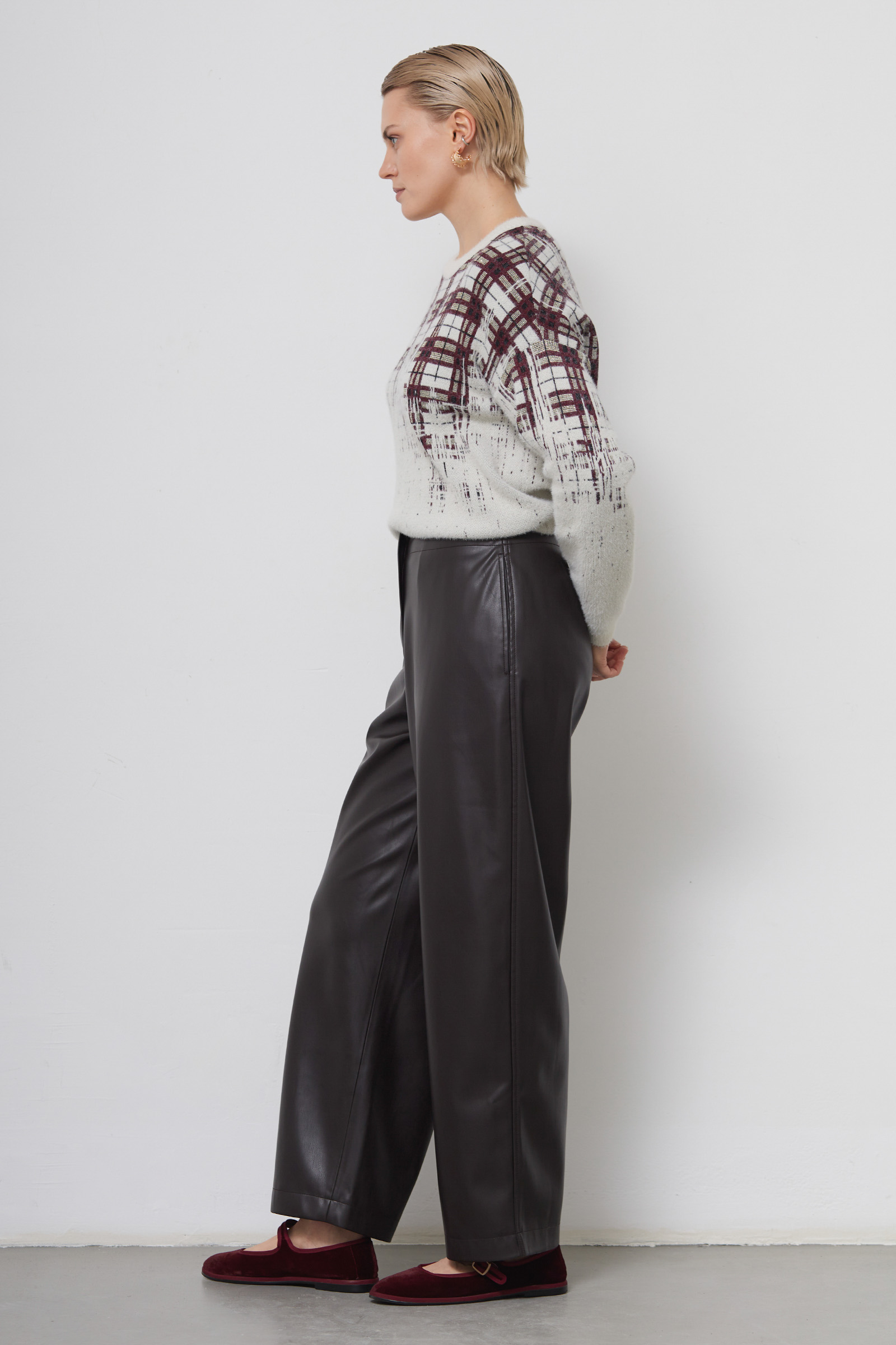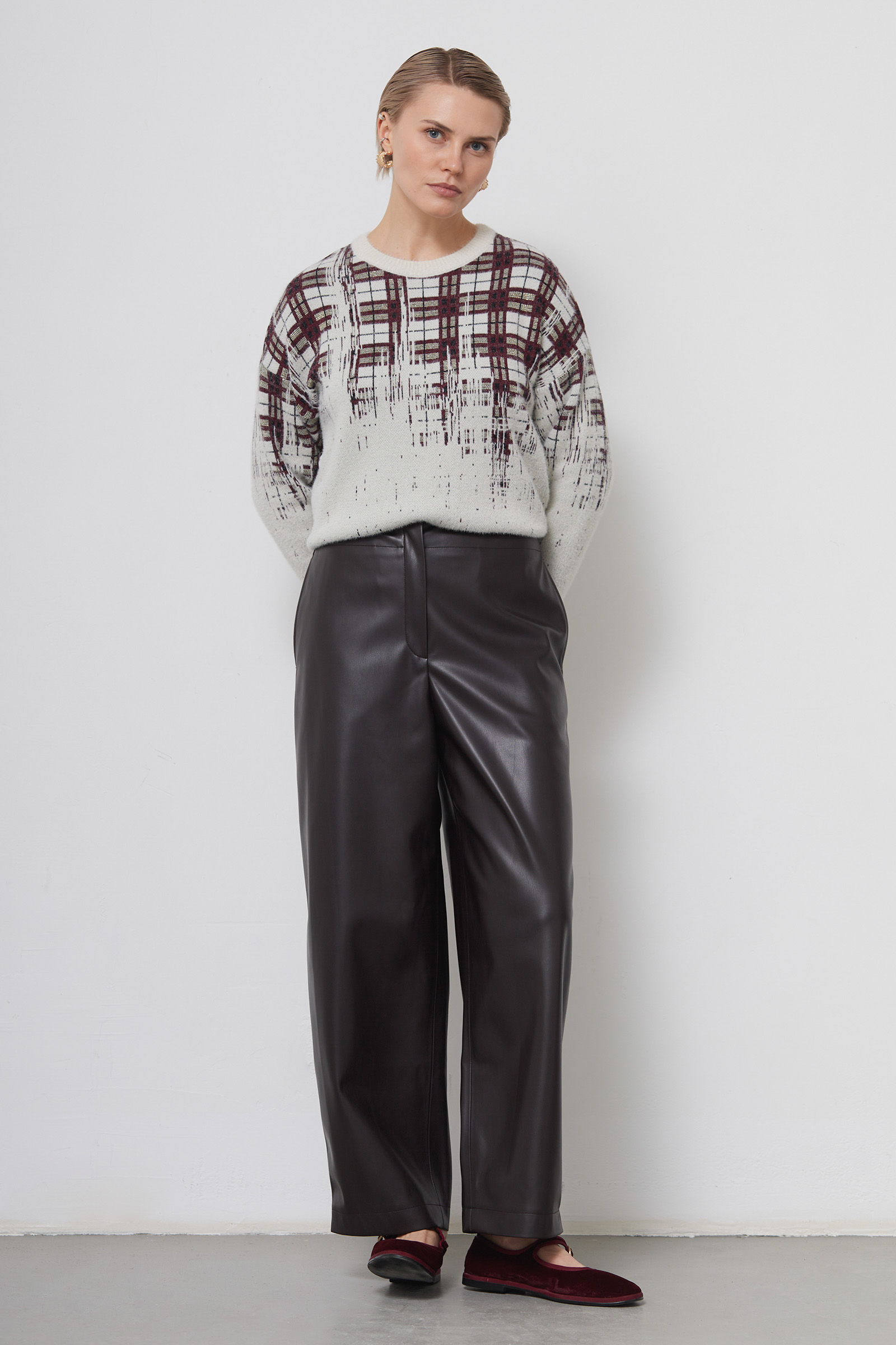 Слегка укороченные объемные брюки из экокожи.