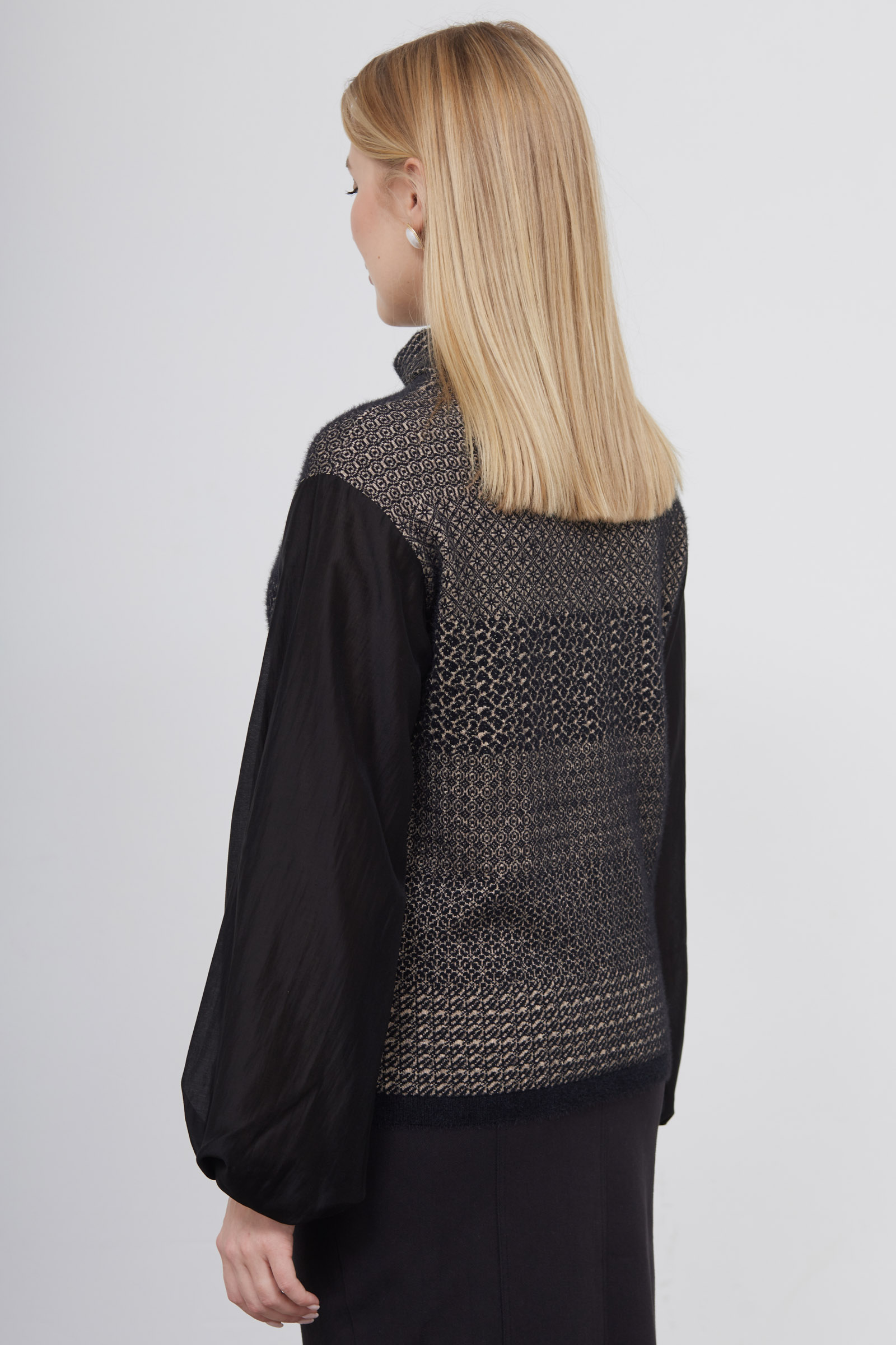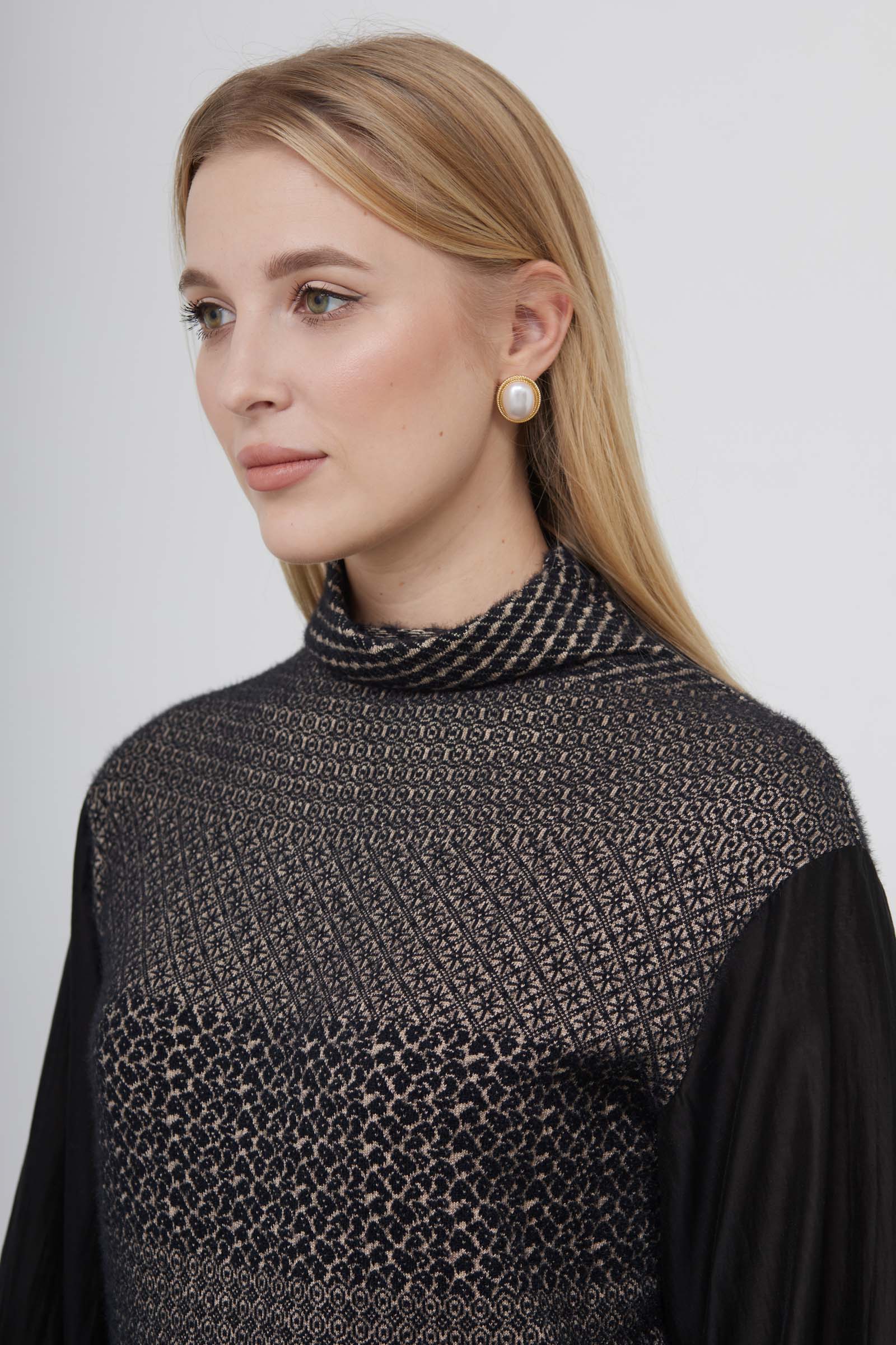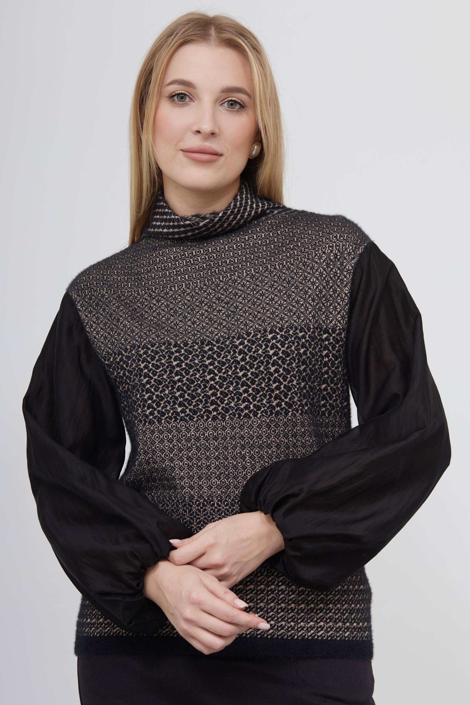 Комбинированный джемпер из мягкого пушистого трикотажа с пышными блузочными рукавами.