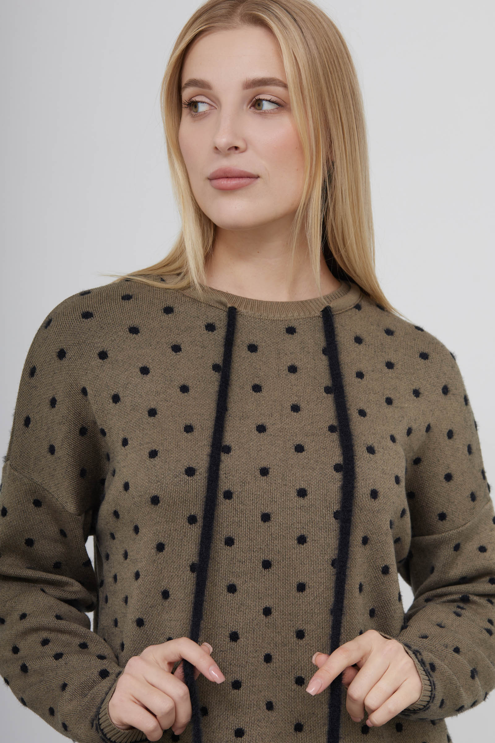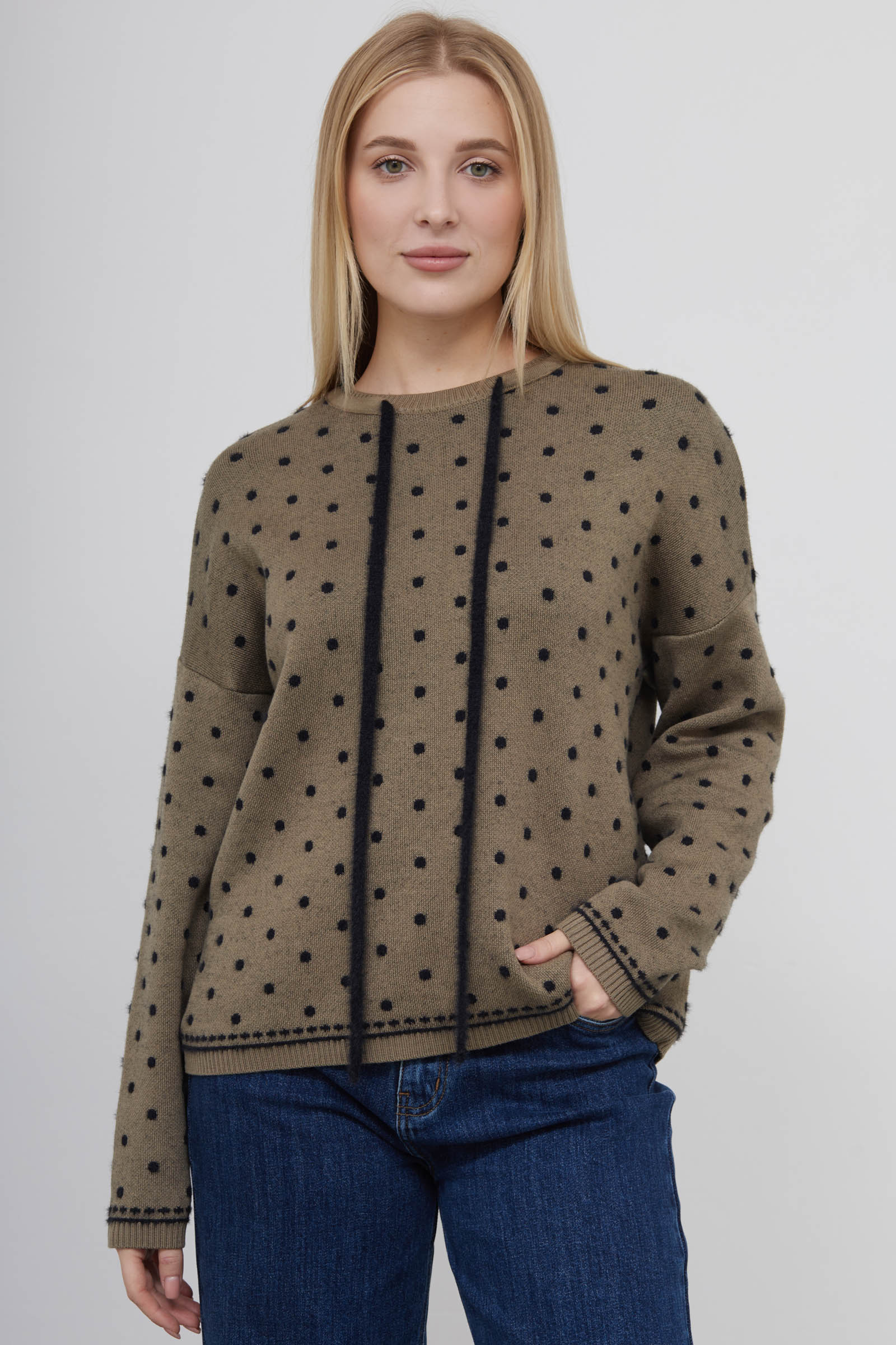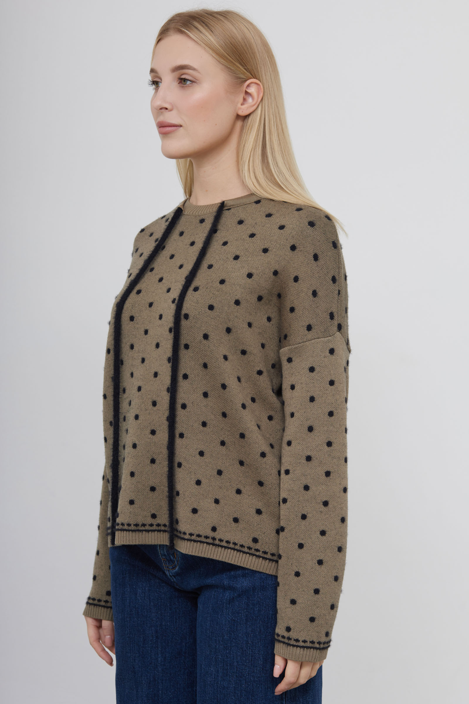 Джемпер жаккардовой вязки в горошек с кулиской на горловине.