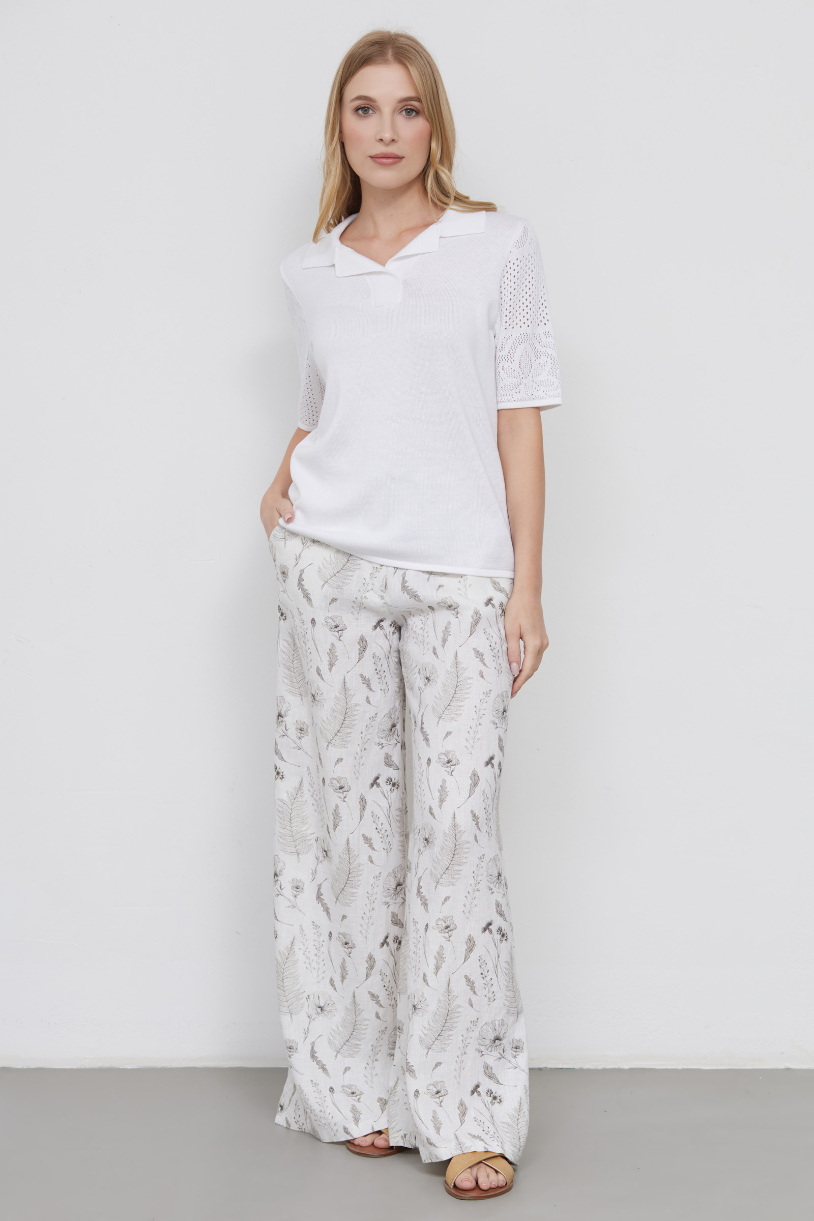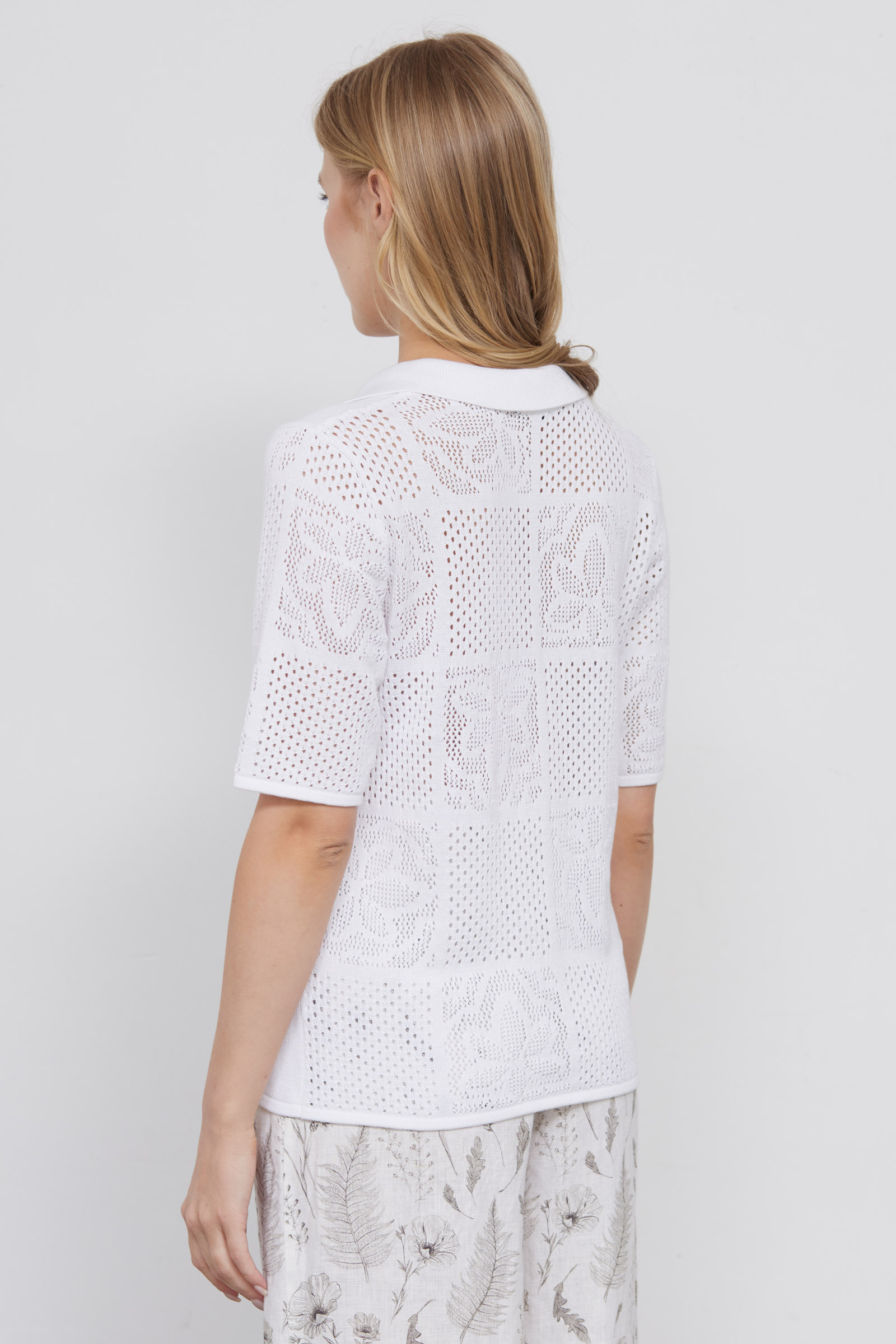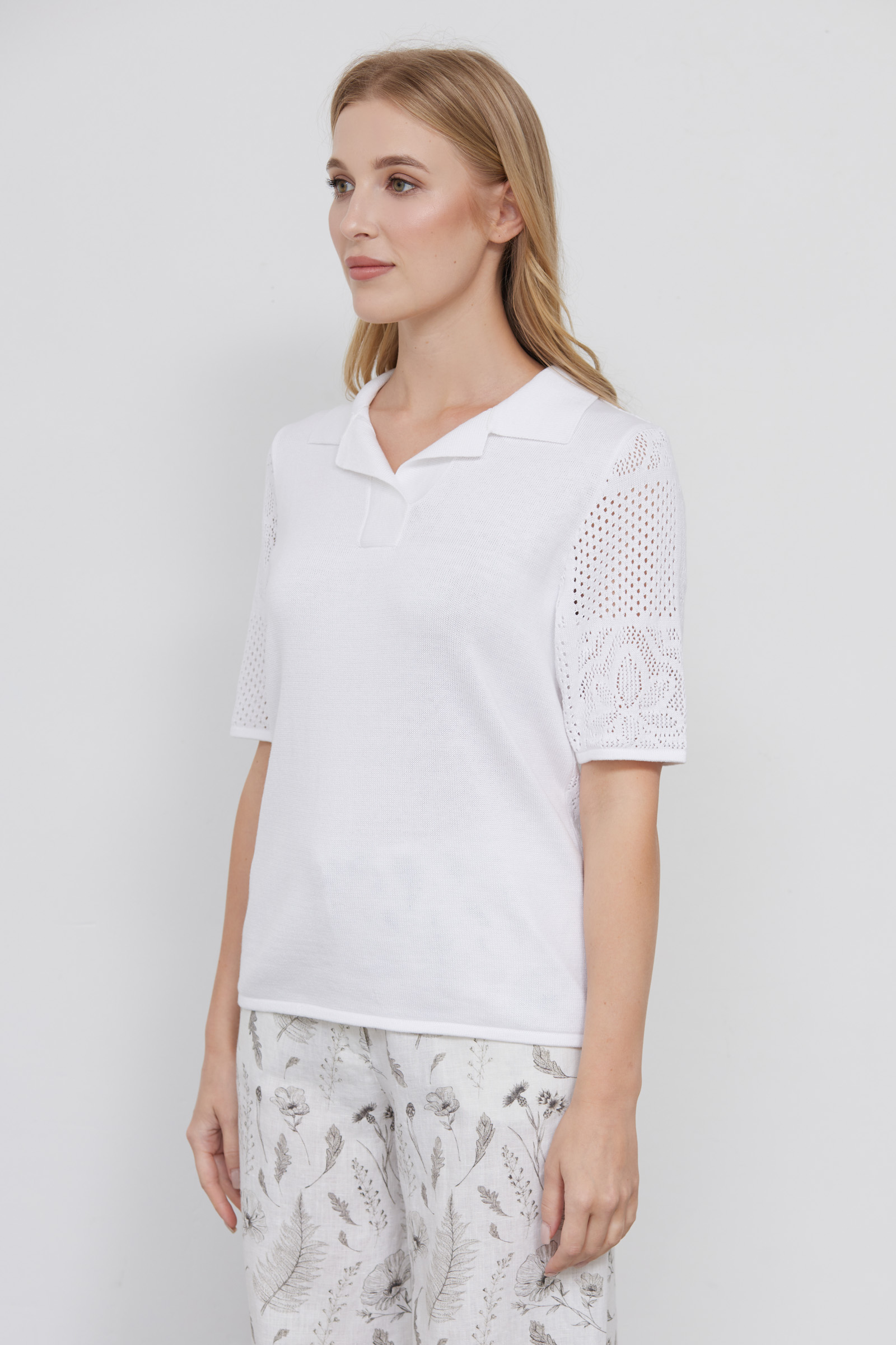 Джемпер-поло из мягкого вязаного трикотажа с ажурными рукавами и спинкой.