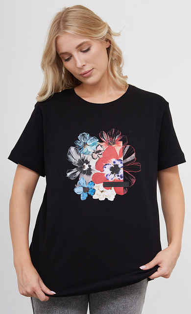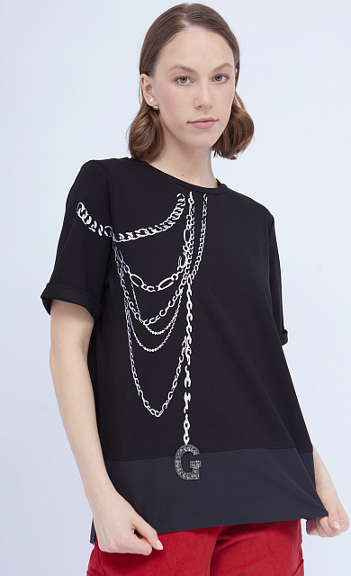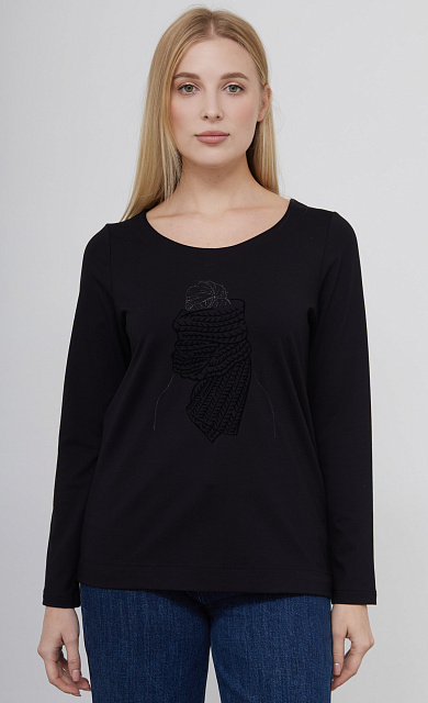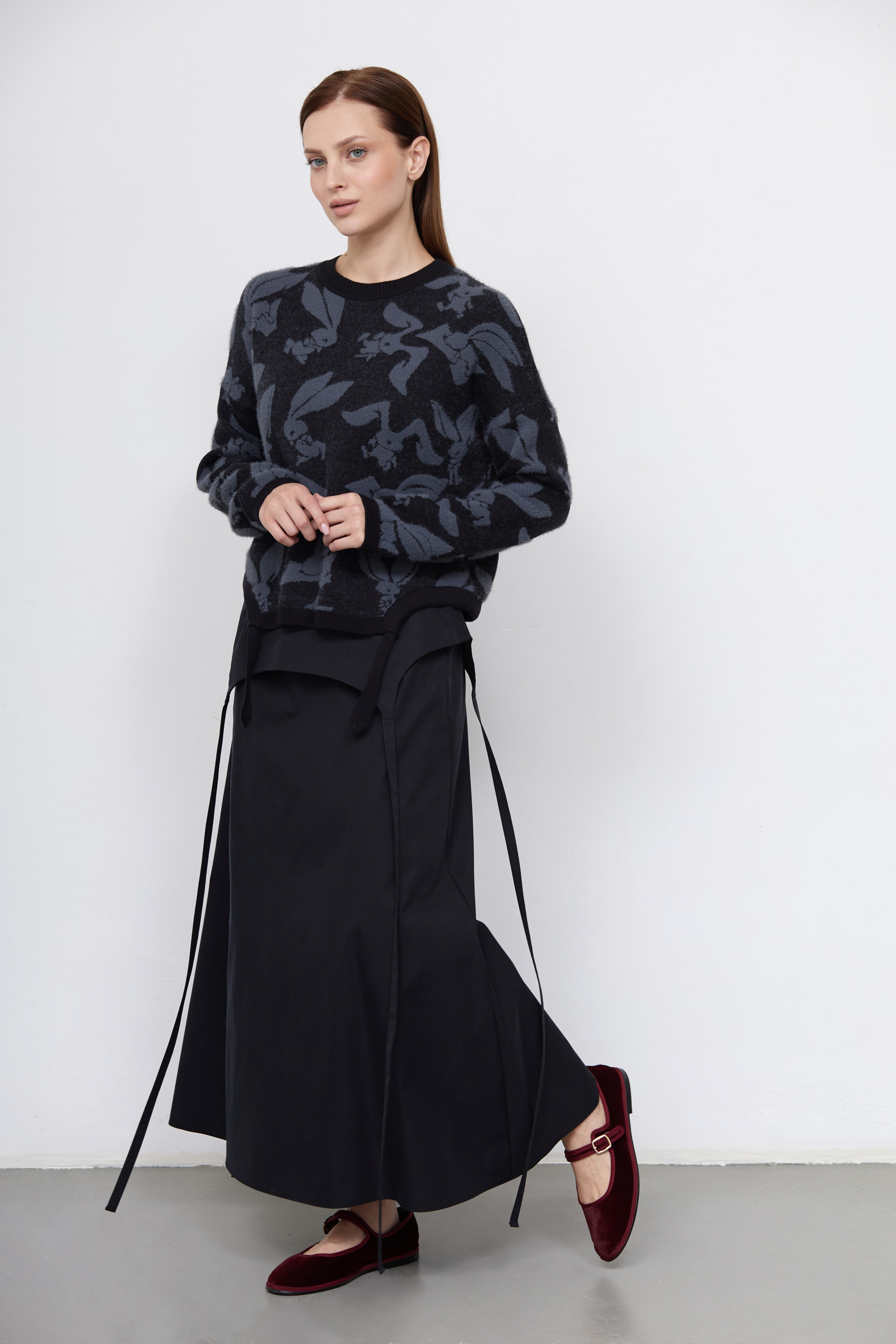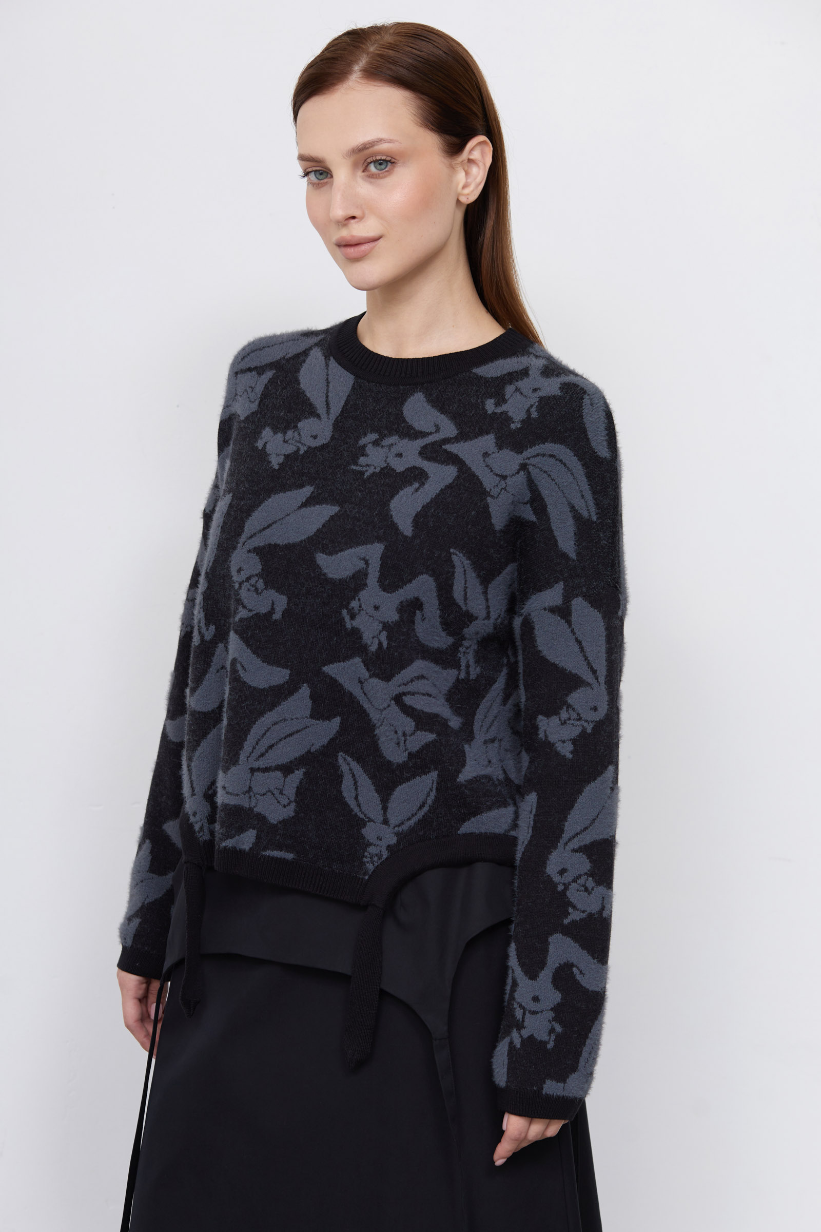 Укороченный джемпер из мягкого пушистого трикотажа с фантазийным принтом и фигурной линией низа с кулиской.