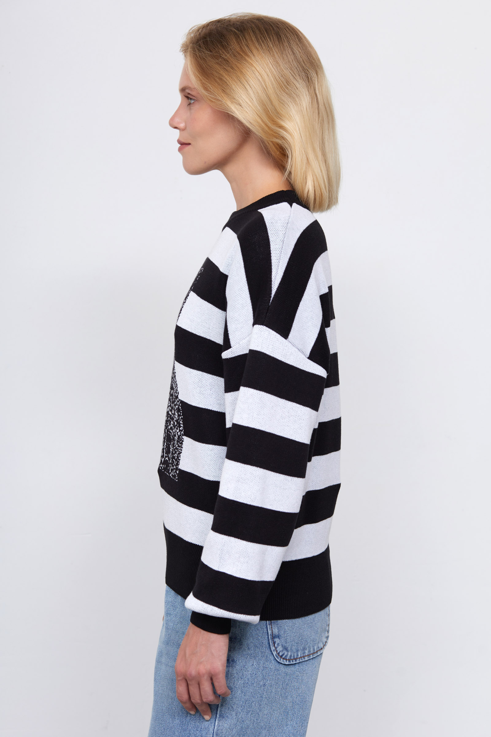 Джемпер из мягкого трикотажа жаккардовой вязки в полоску с авторским рисунком.