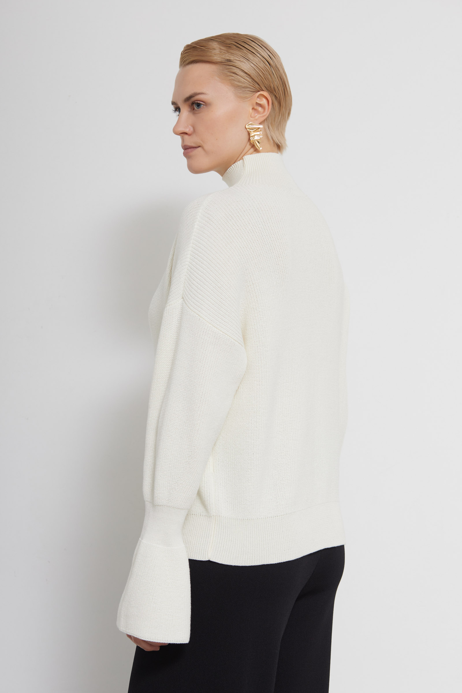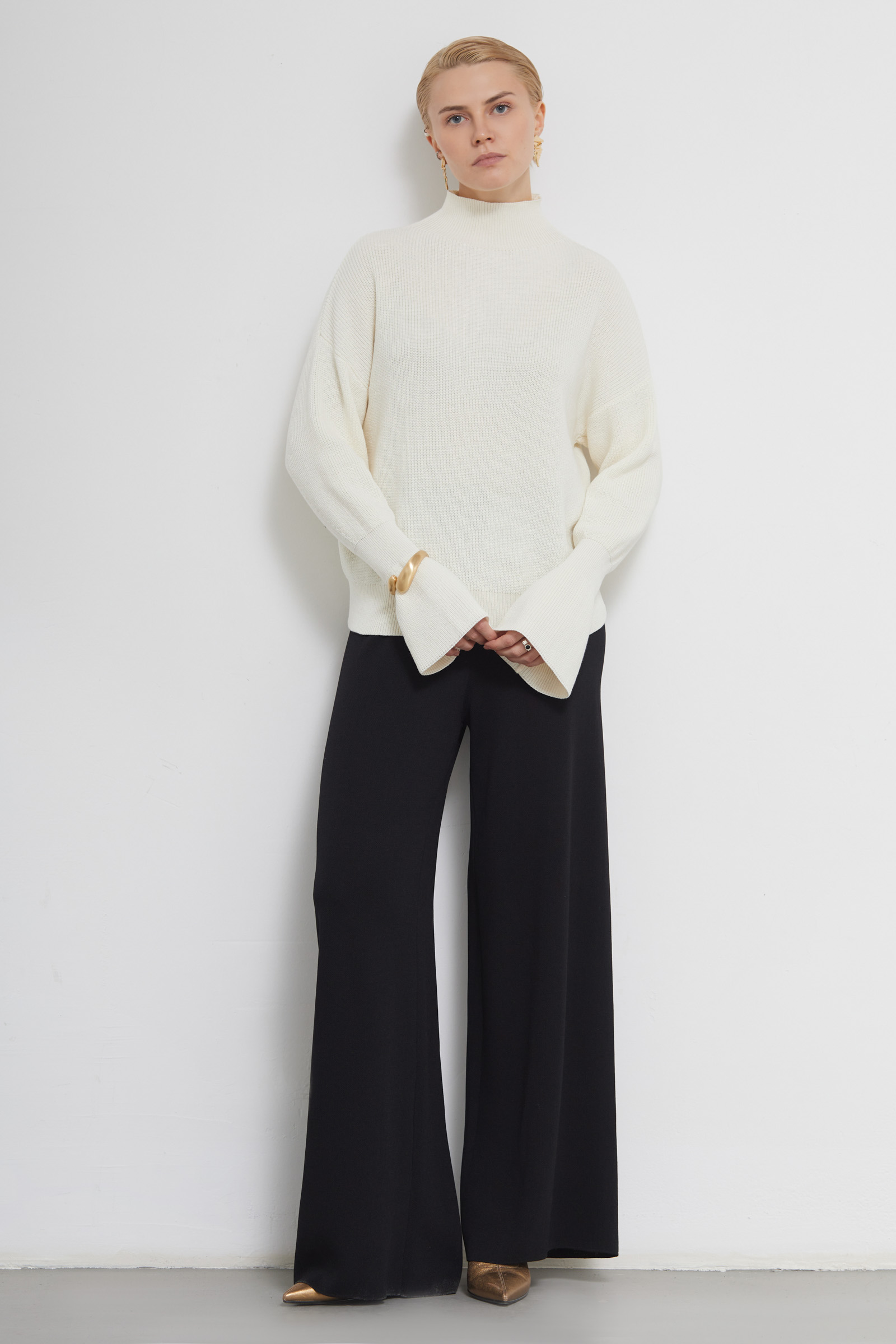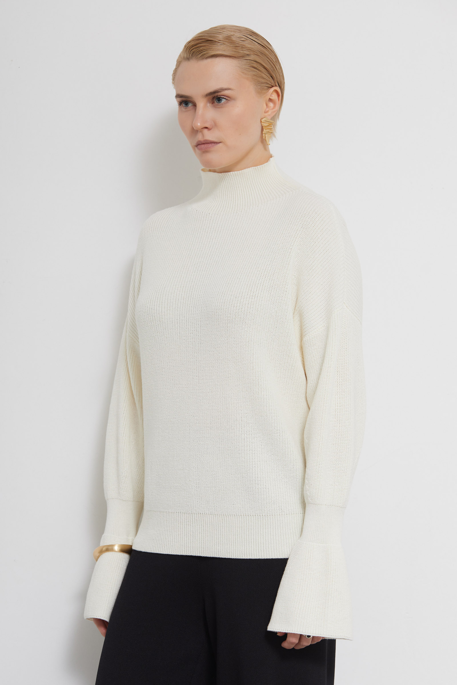 Джемпер oversize из мягкого вязаного трикотажа с расклешенными манжетами.