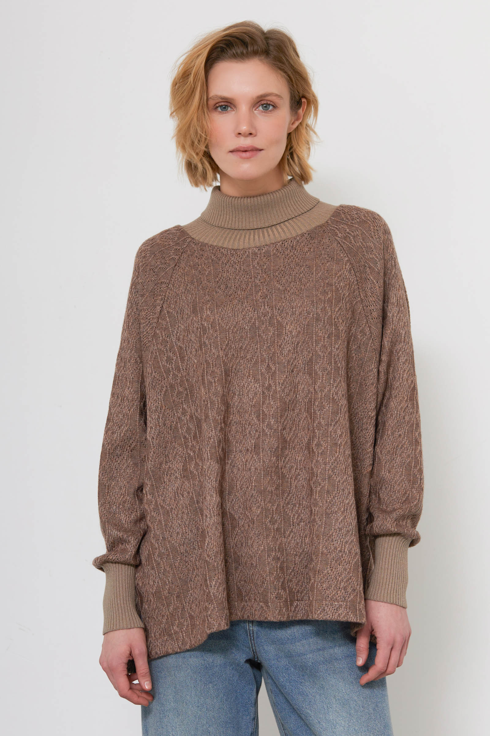 Джемпер oversize ажурной вязки с узорами и высоким воротником.