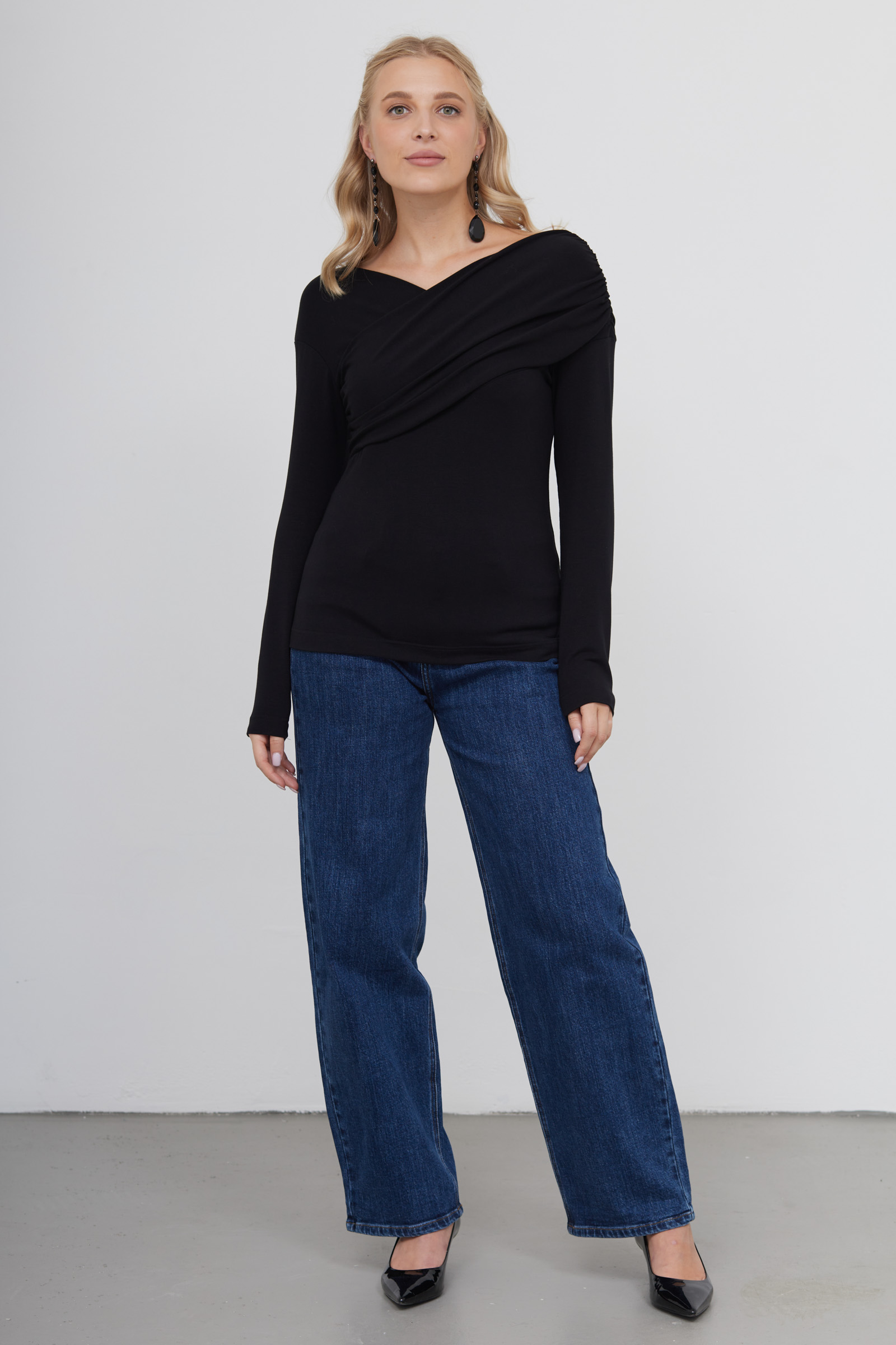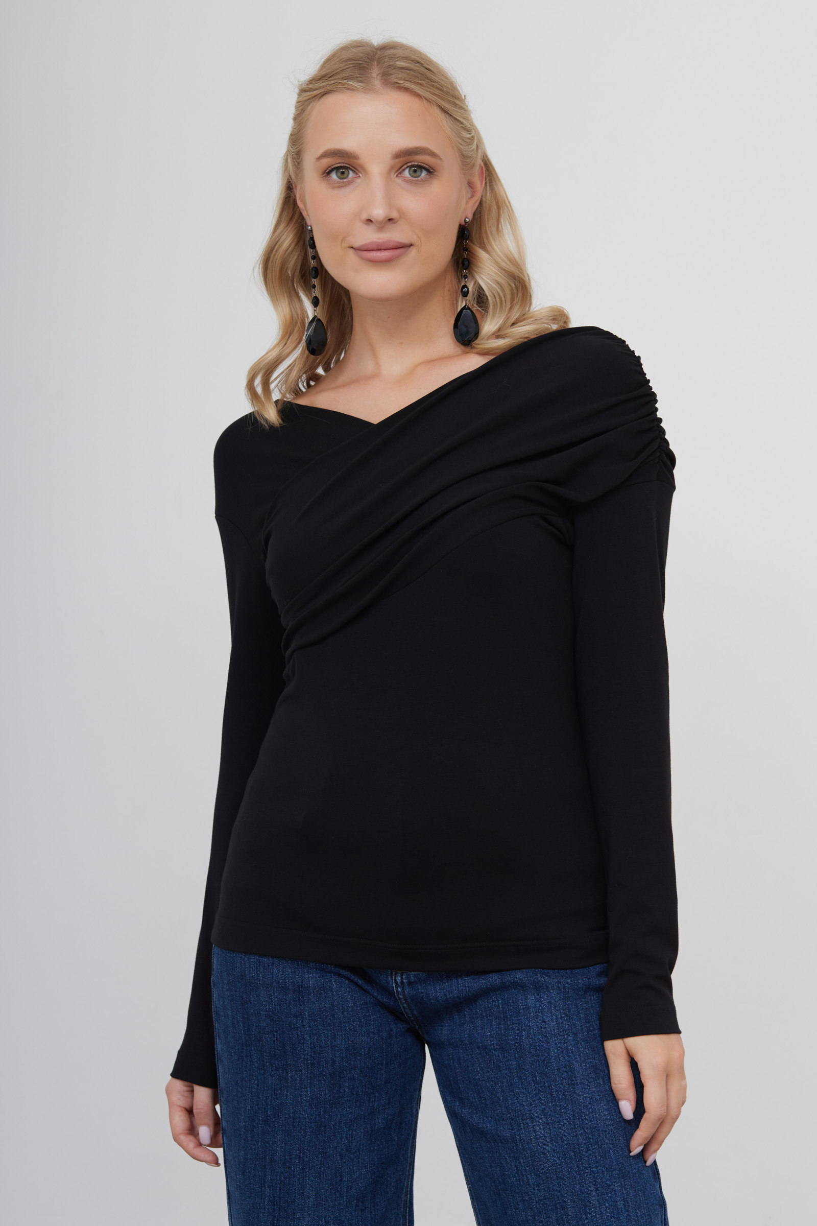 Облегающий лонгслив из мягкого хлопкового трикотажа с полуоткрытыми плечами и драпировкой сверху.