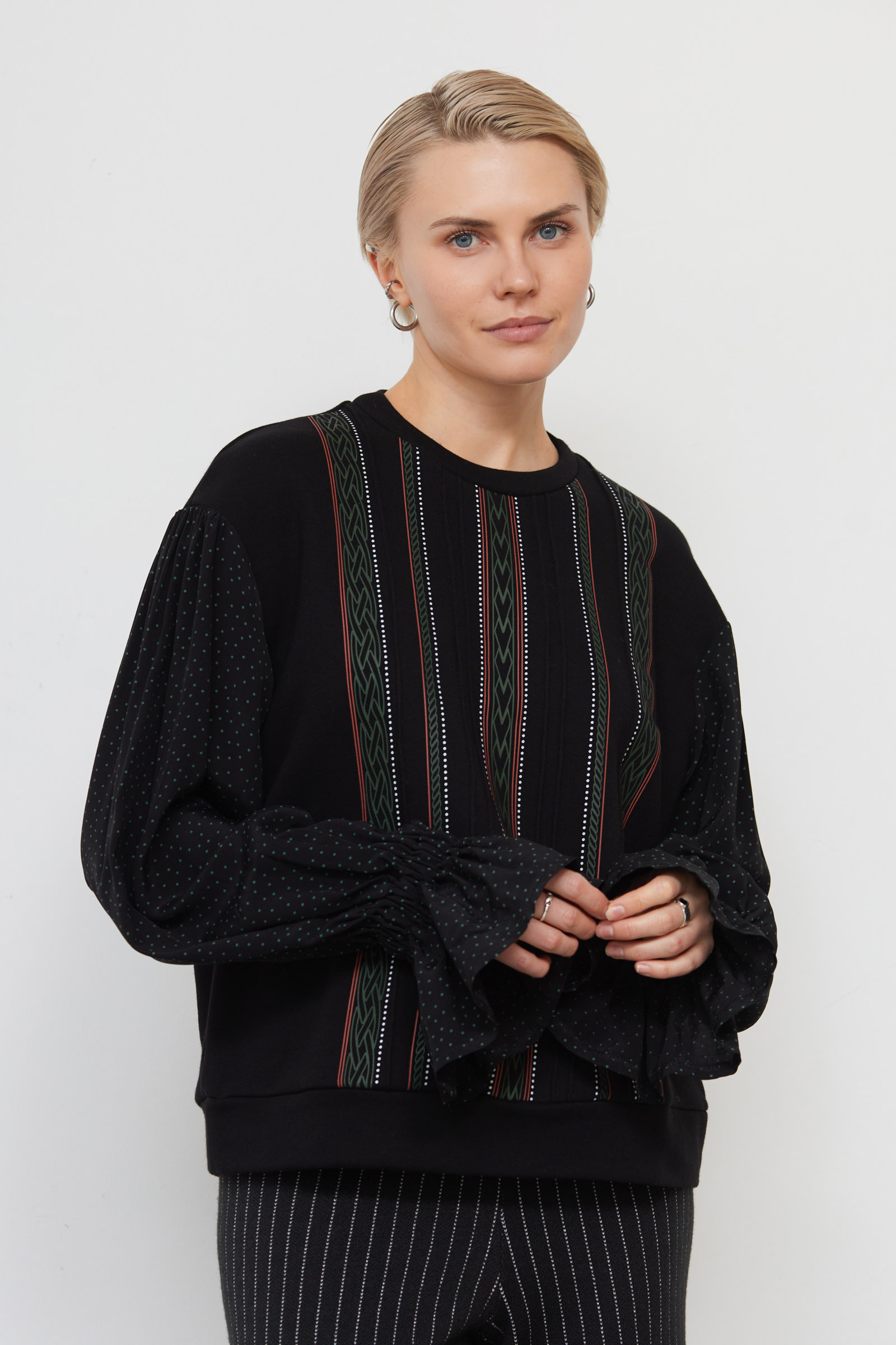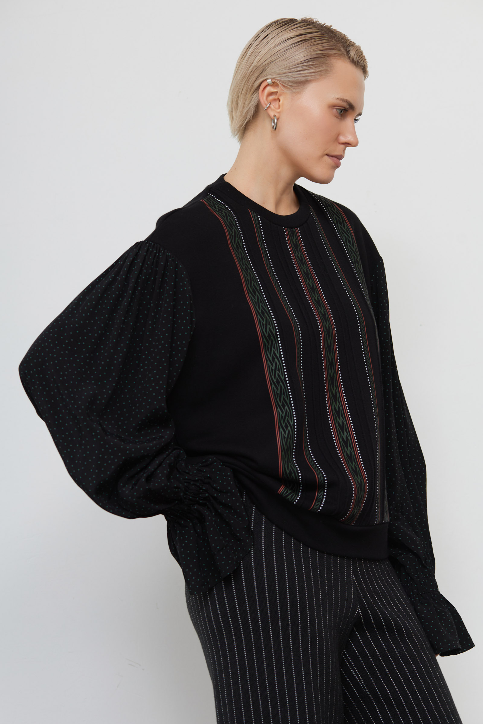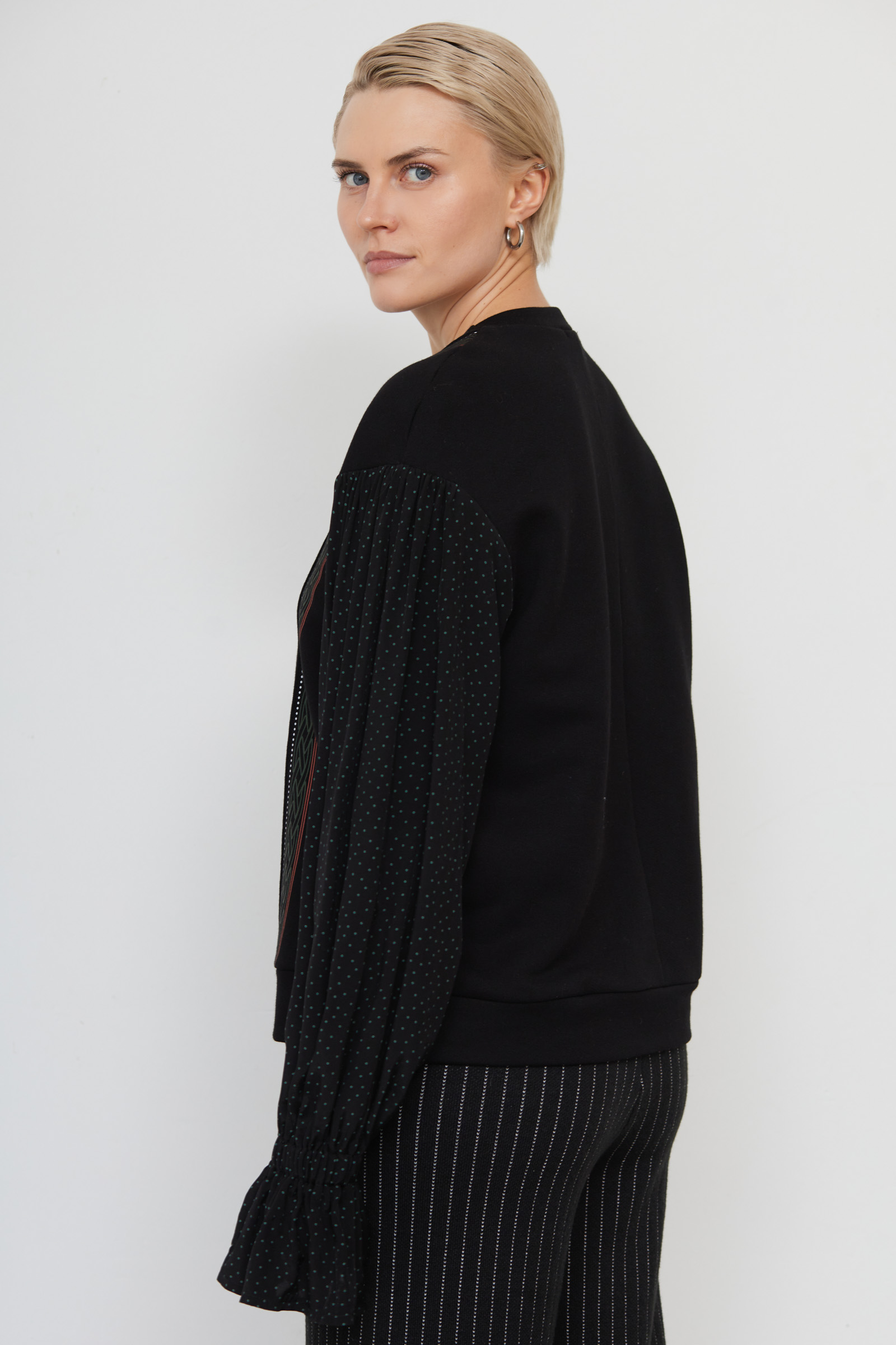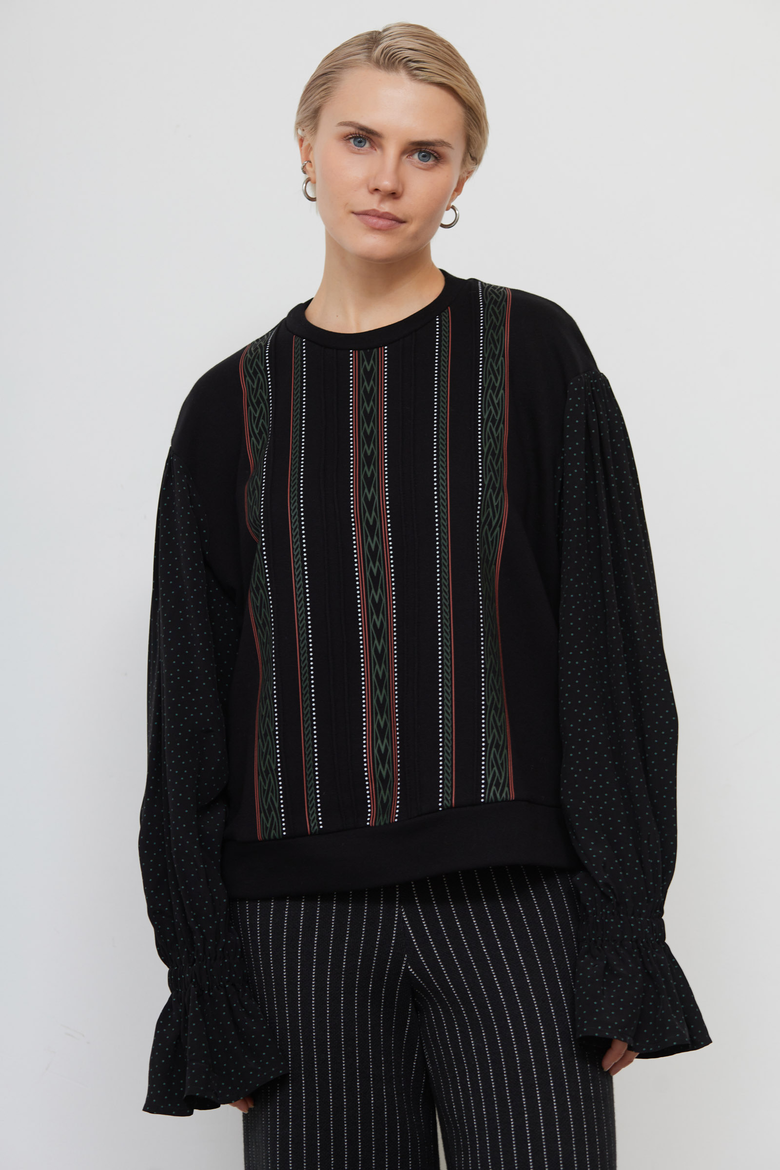 Комбинированный свитшот с фактурным орнаментом и рукавами из струящейся вискозы в горошек.