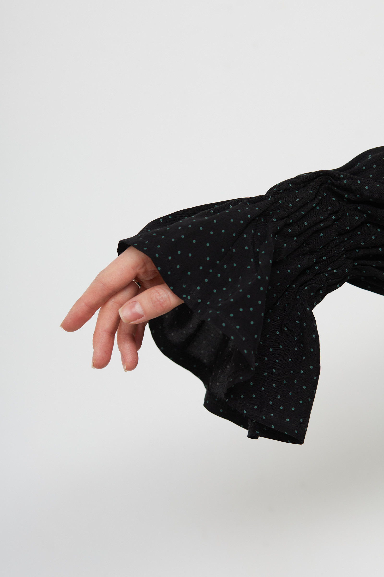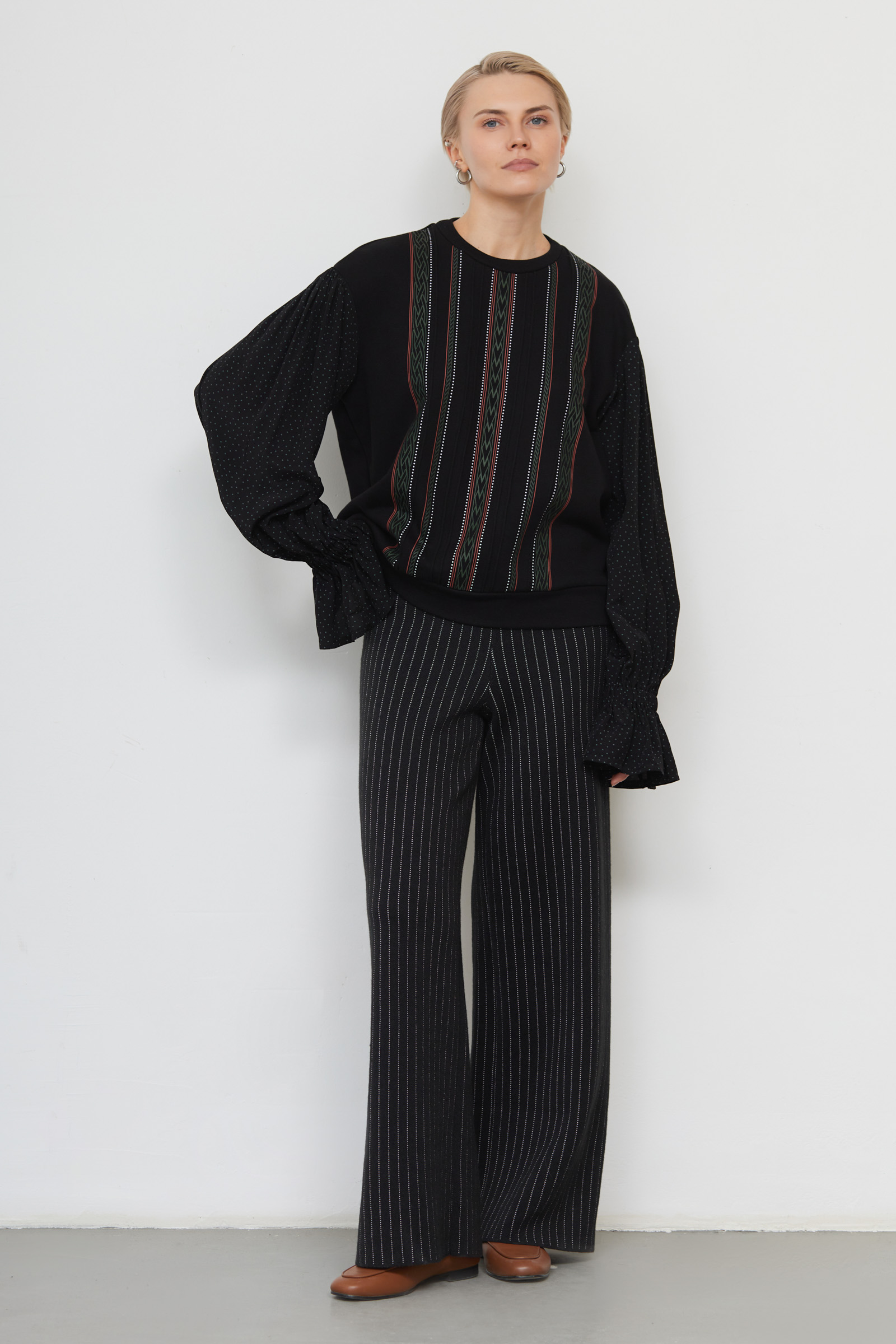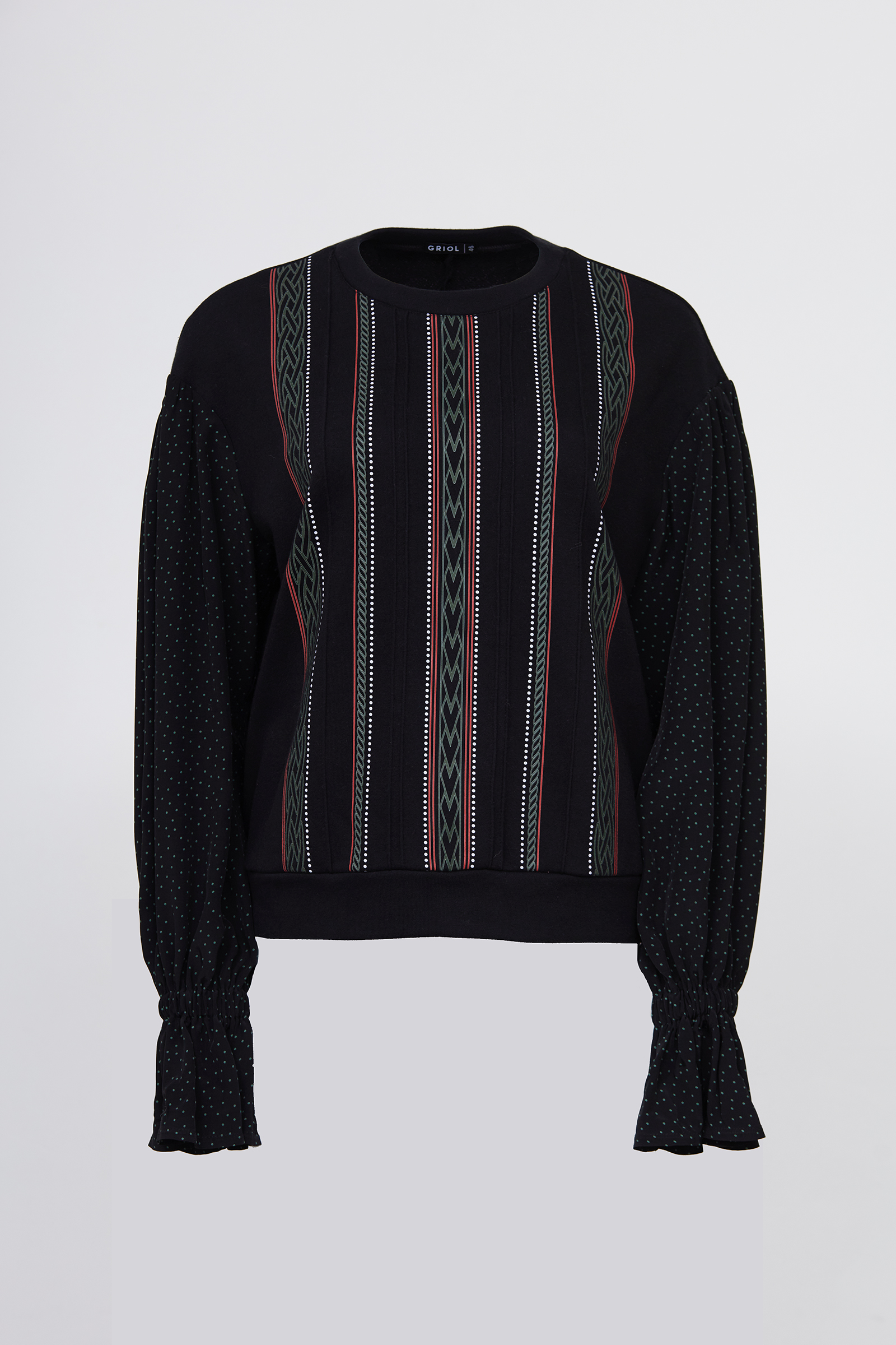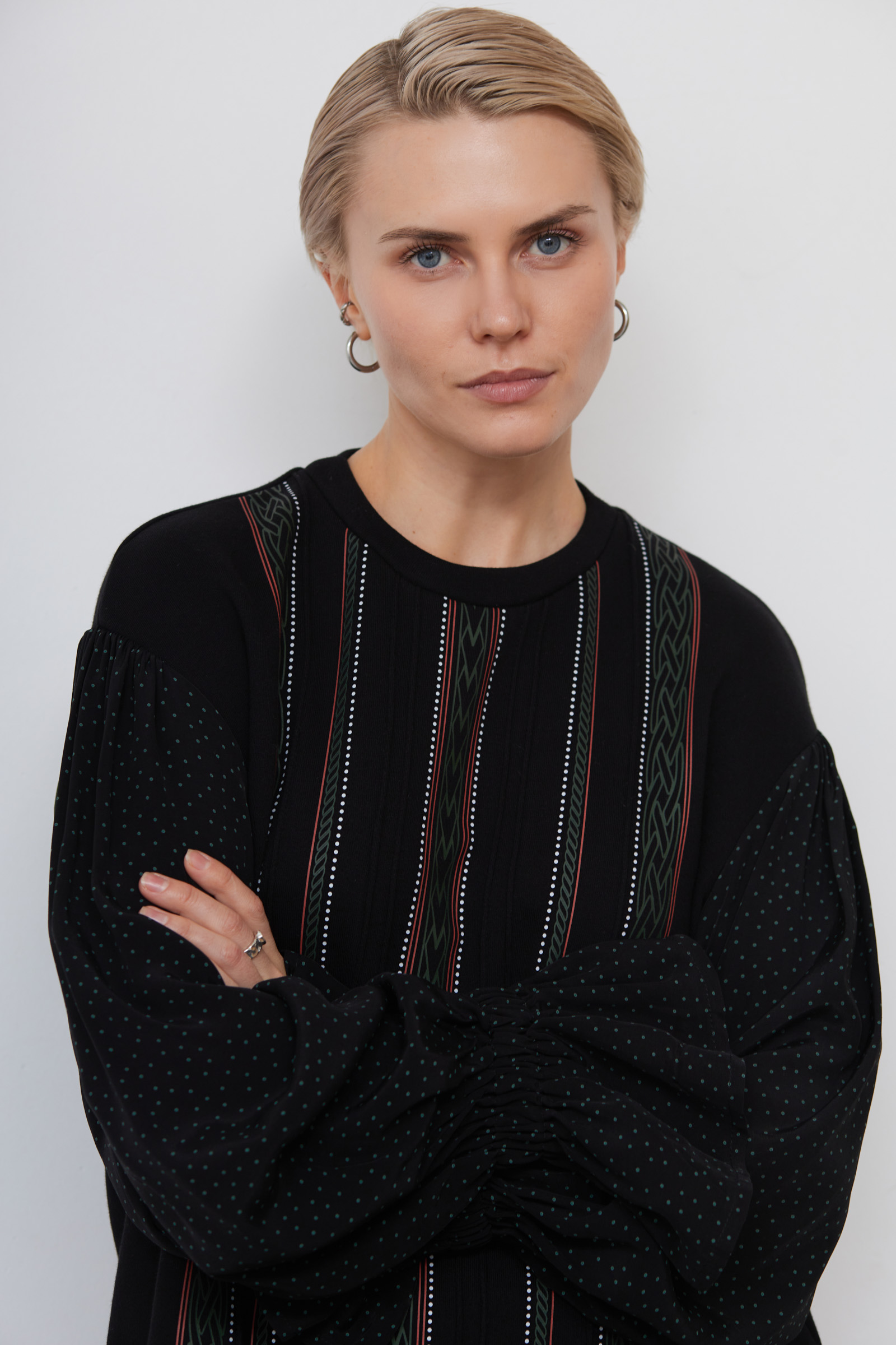 Комбинированный свитшот с фактурным орнаментом и рукавами из струящейся вискозы в горошек.