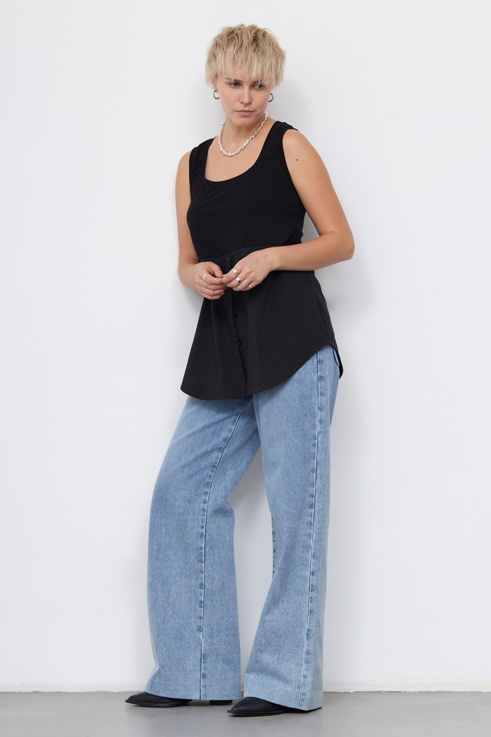 Комбинированный топ с верхней частью из хлопкового трикотажа и низом из гладкого хлопкового текстиля на пуговицах.