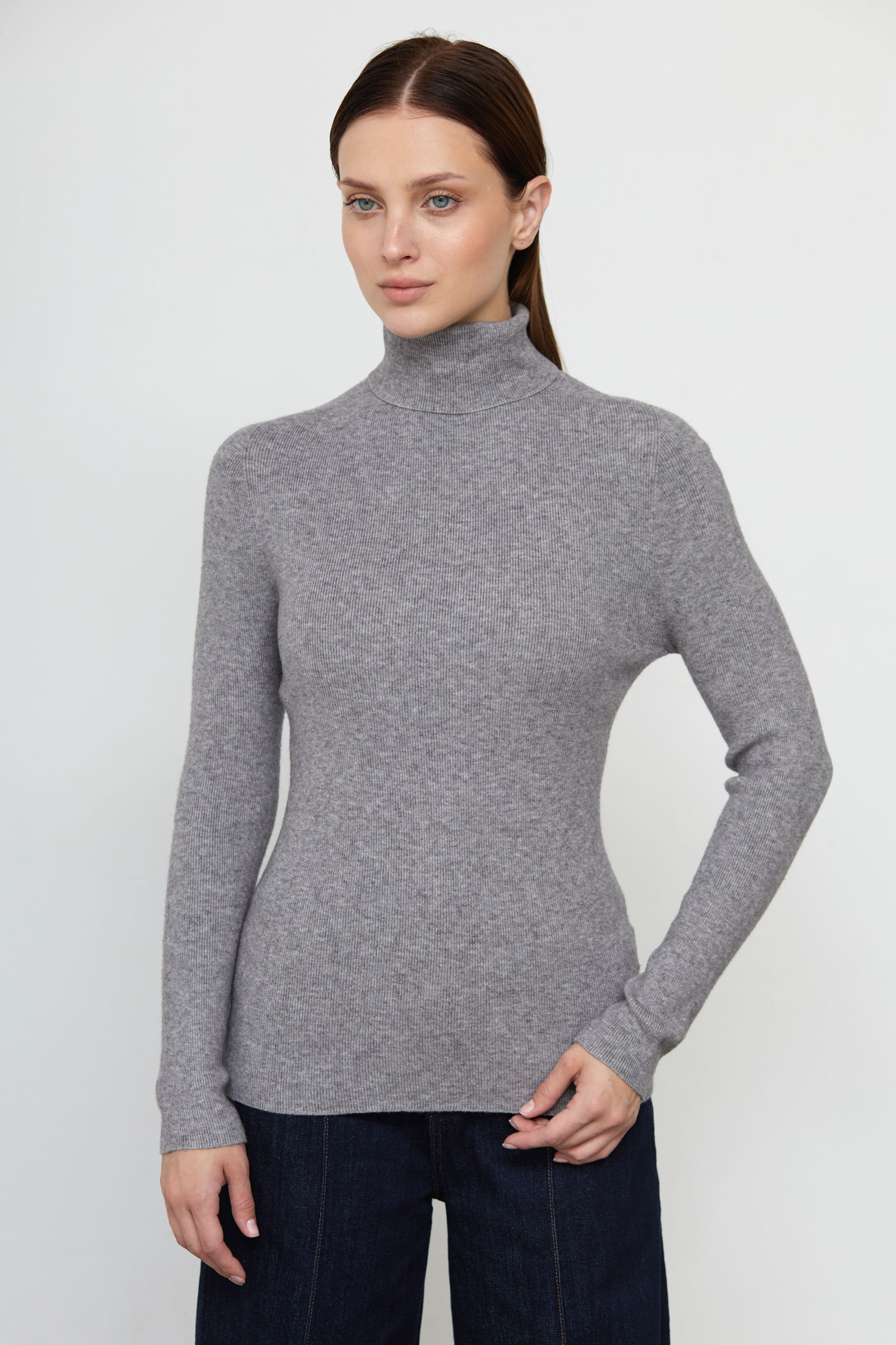 Базовая водолазка из мягкого вязаного трикотажа в рубчик.
