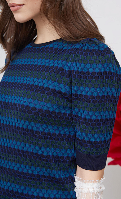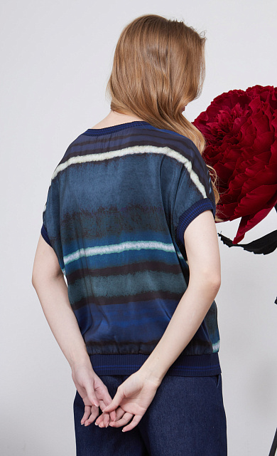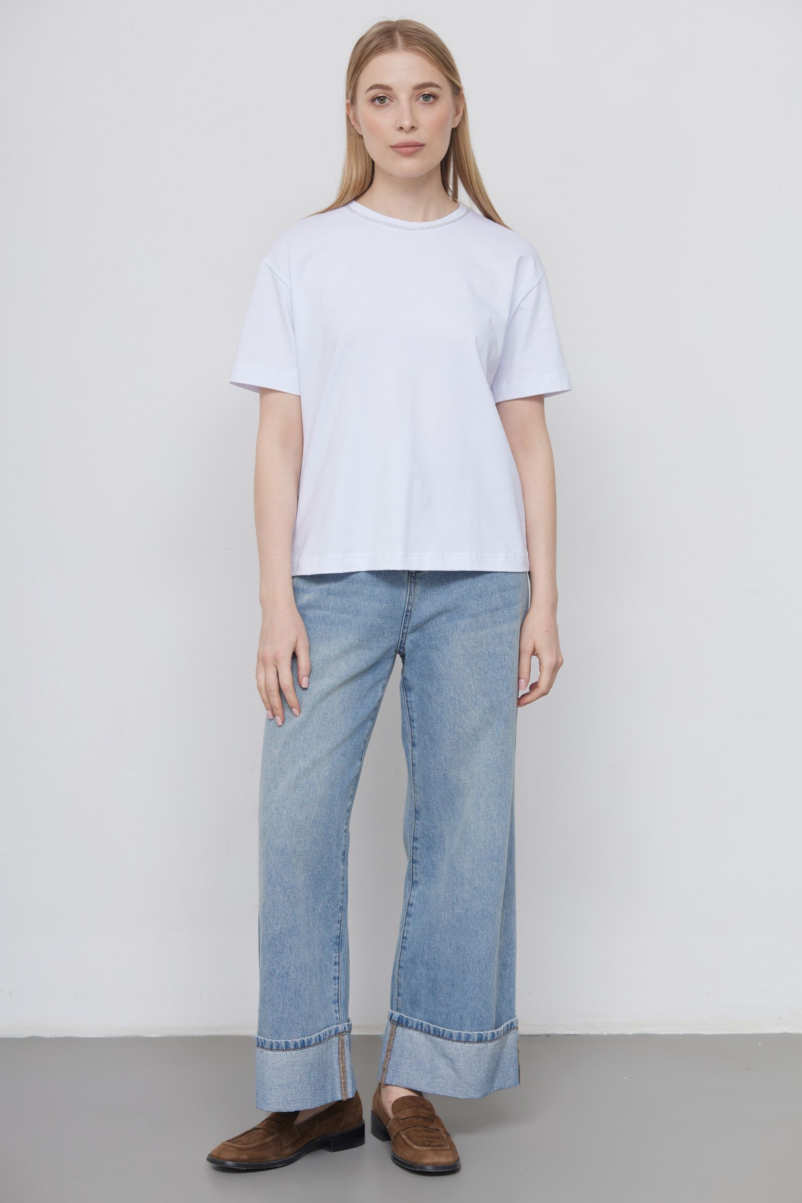 Футболка из мягкого хлопкового трикотажа с декоративной тесьмой на горловине.