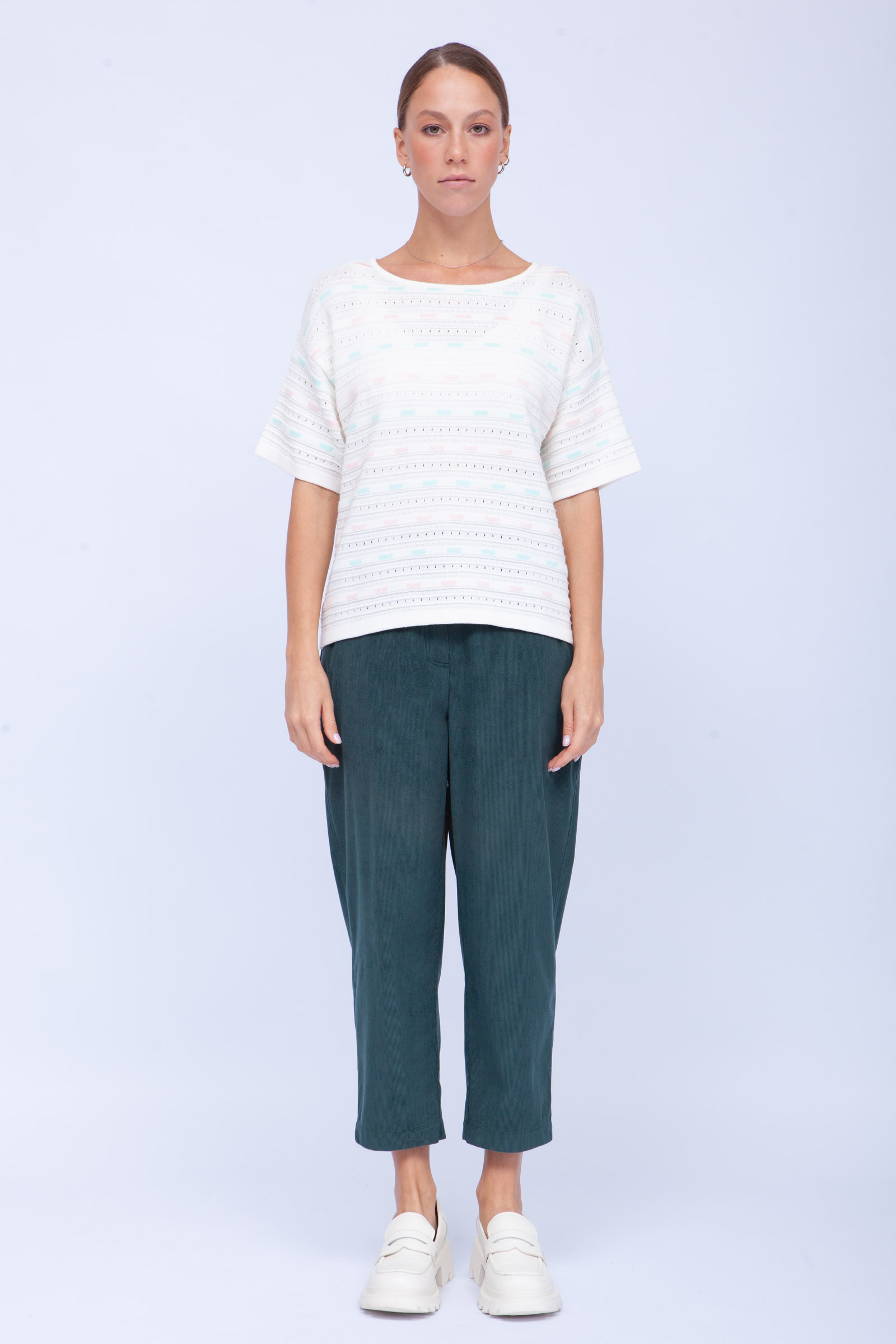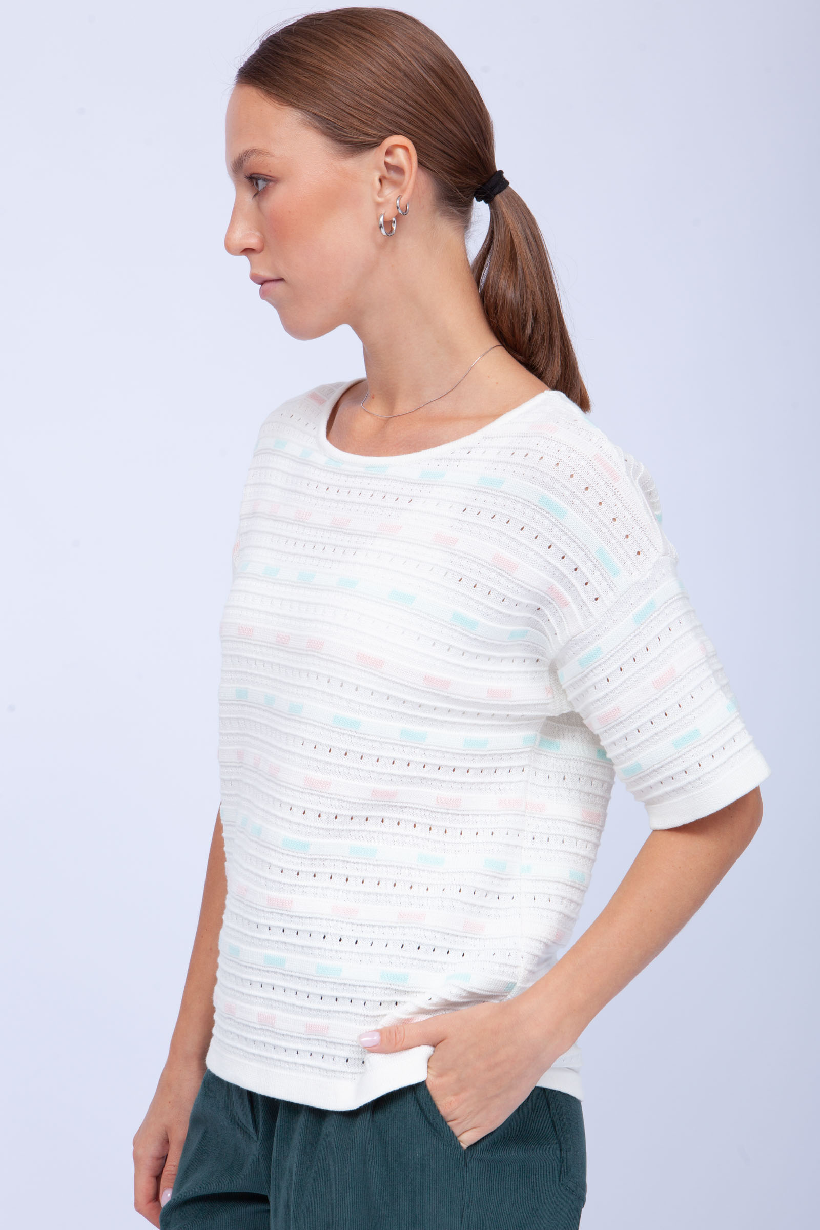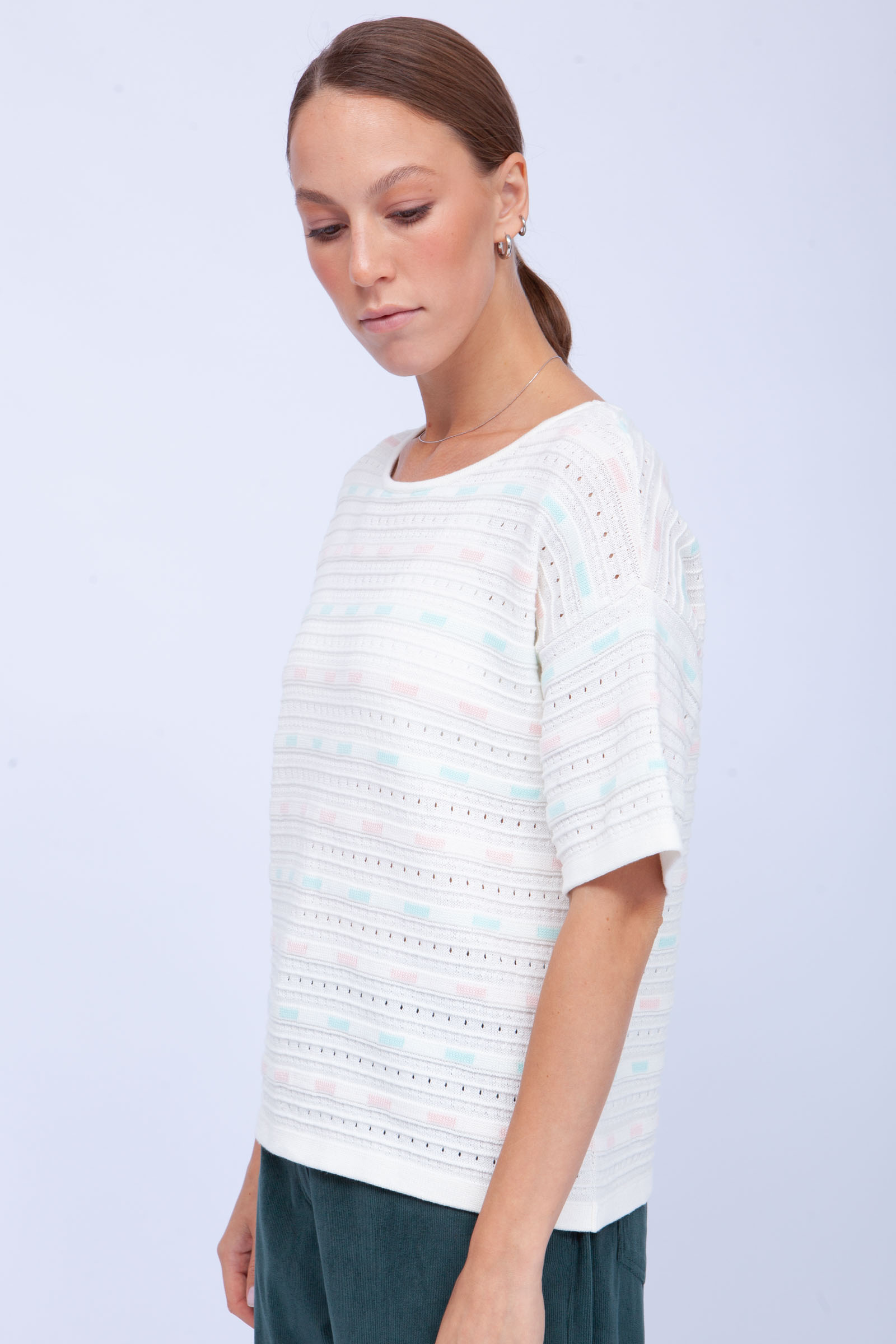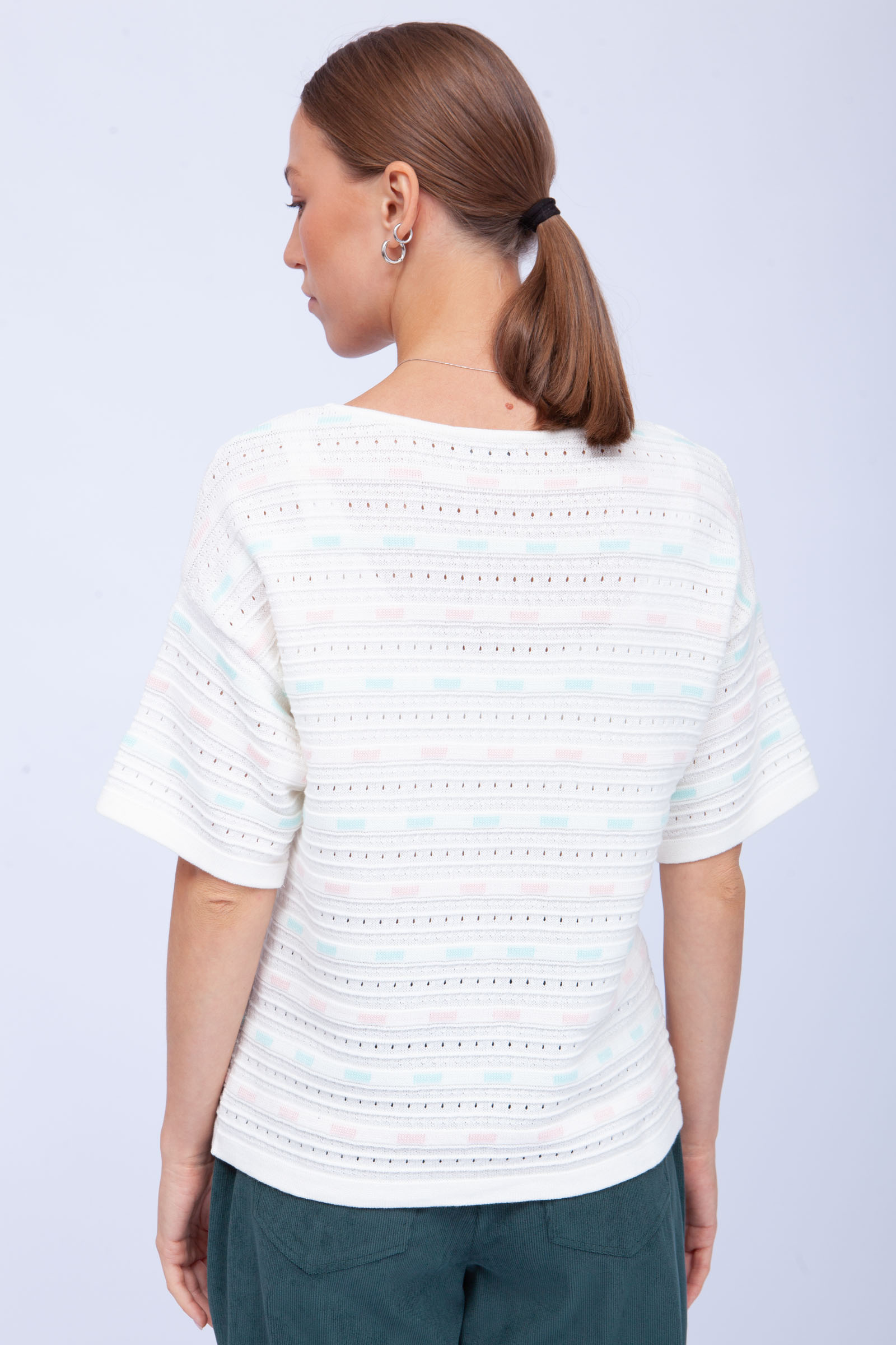 Джемпер объемной ажурной вязки с короткими рукавами.