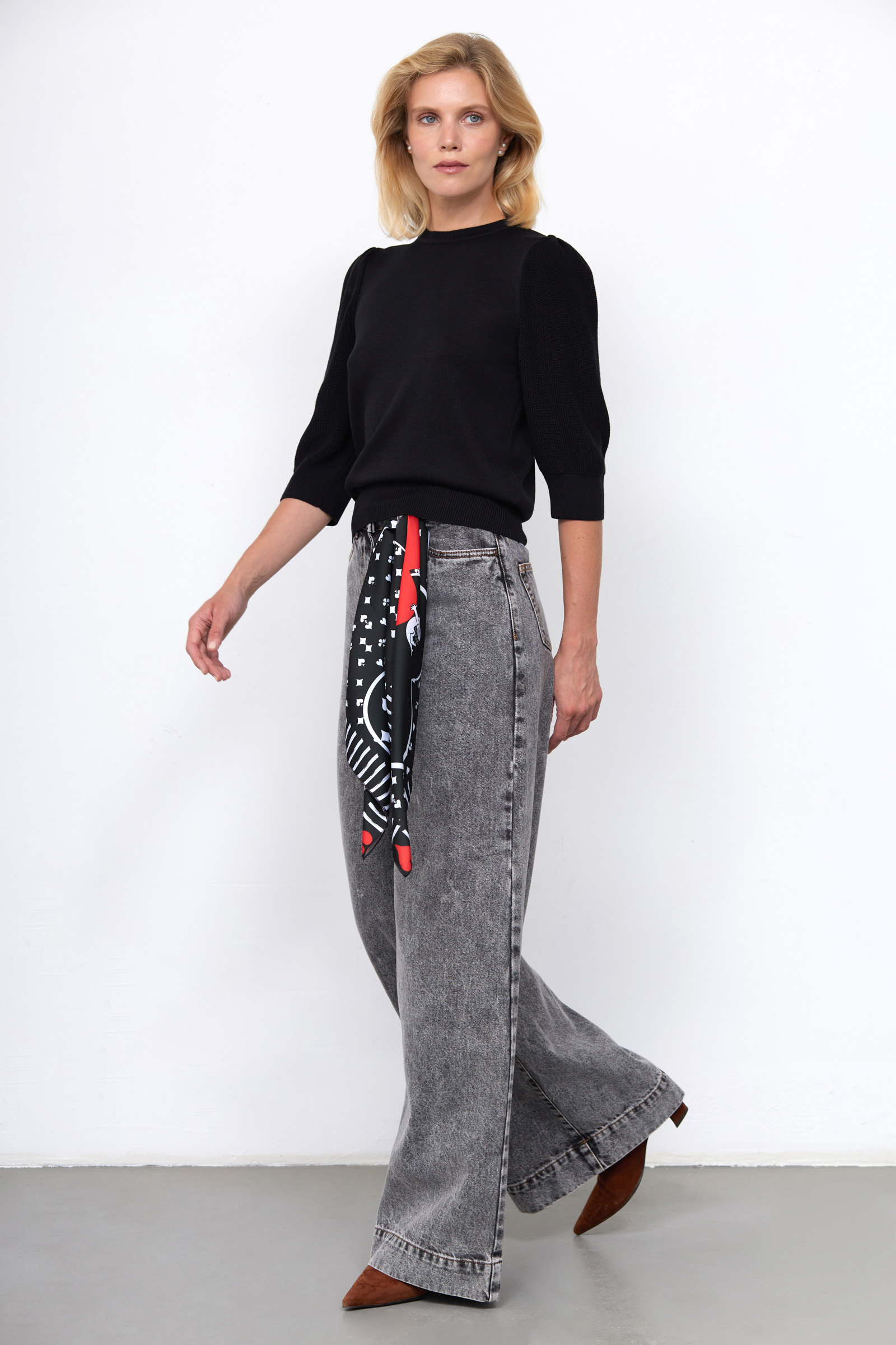 Широкие джинсы из мягкого денима с вареным эффектом и контрастными отстрочками.