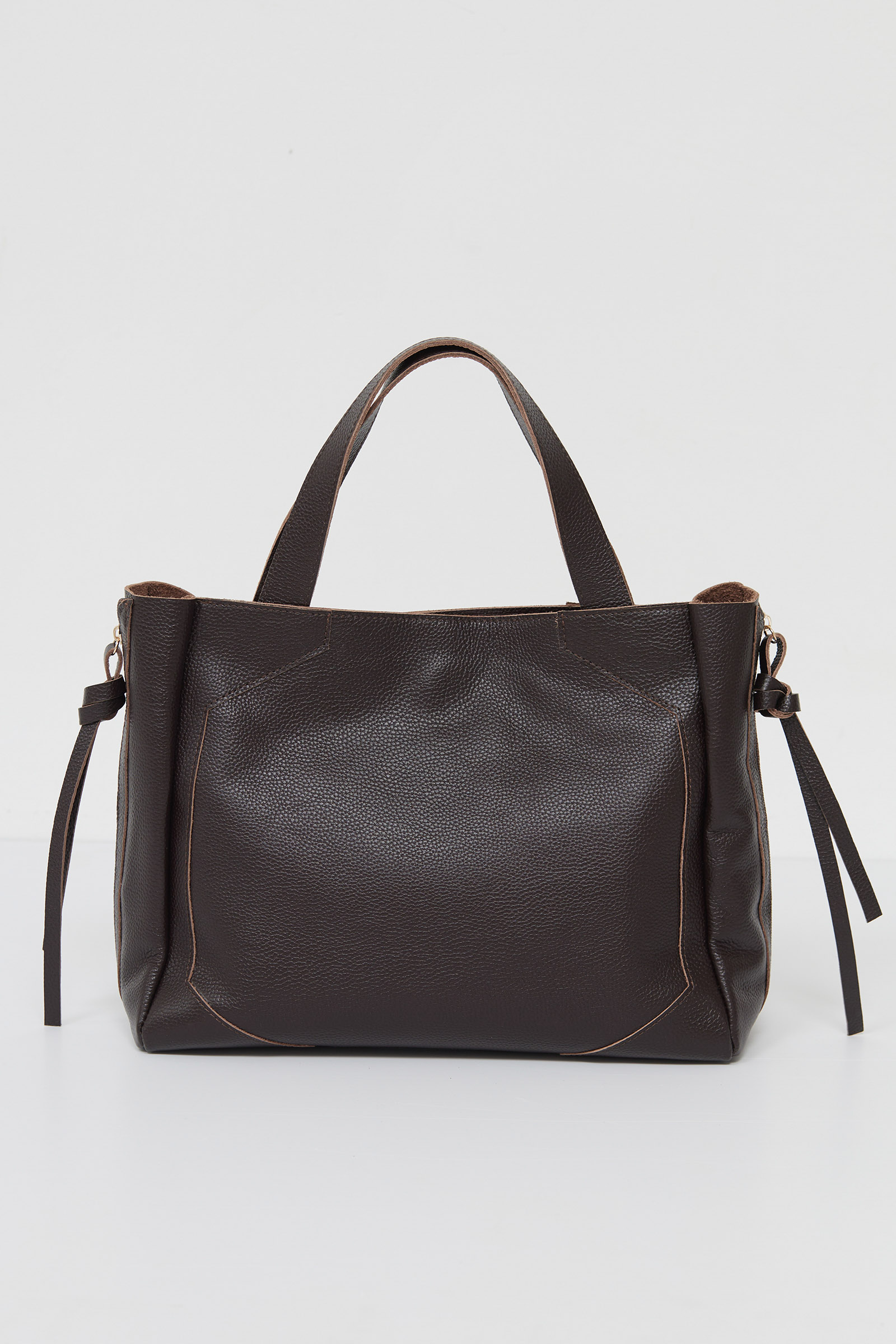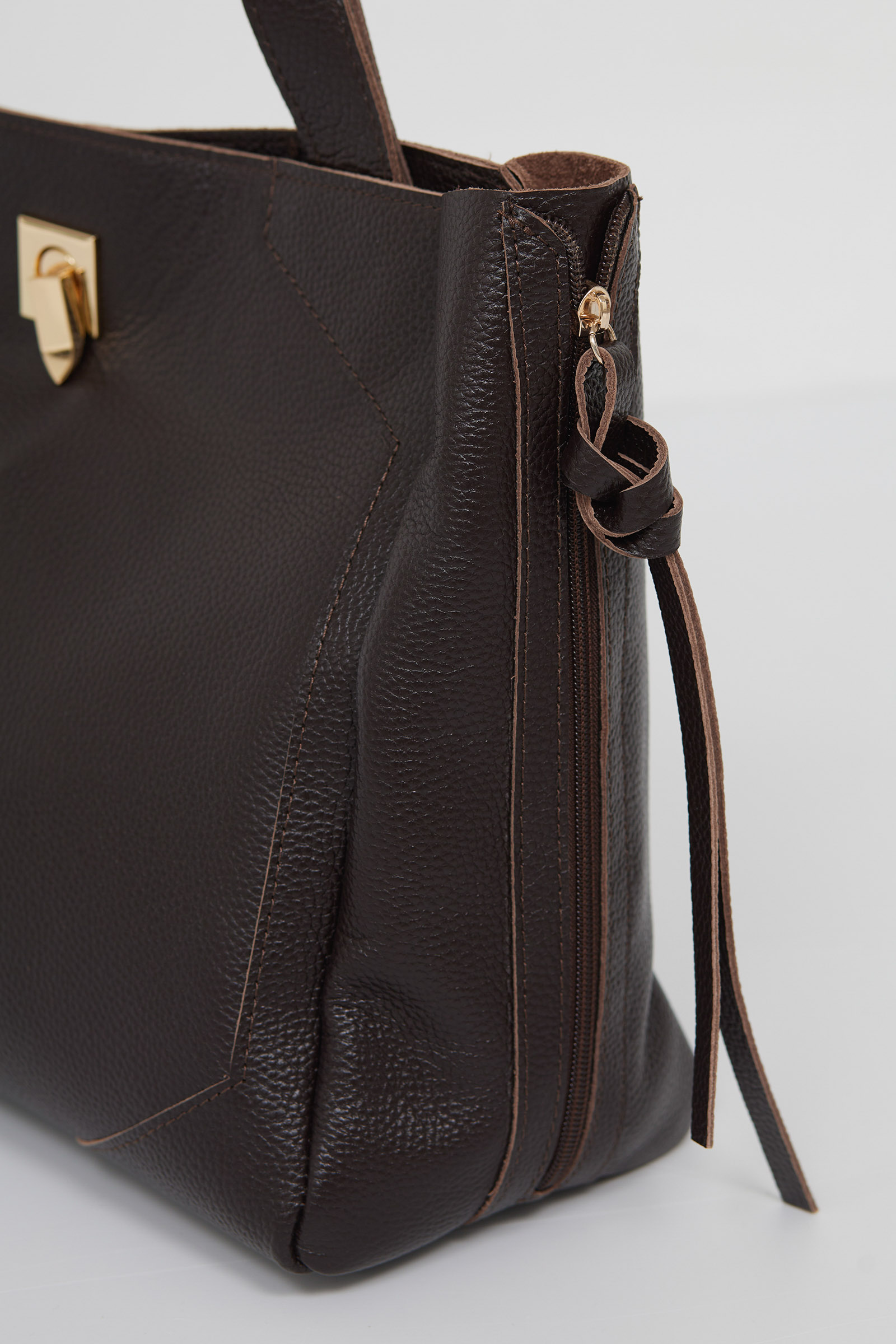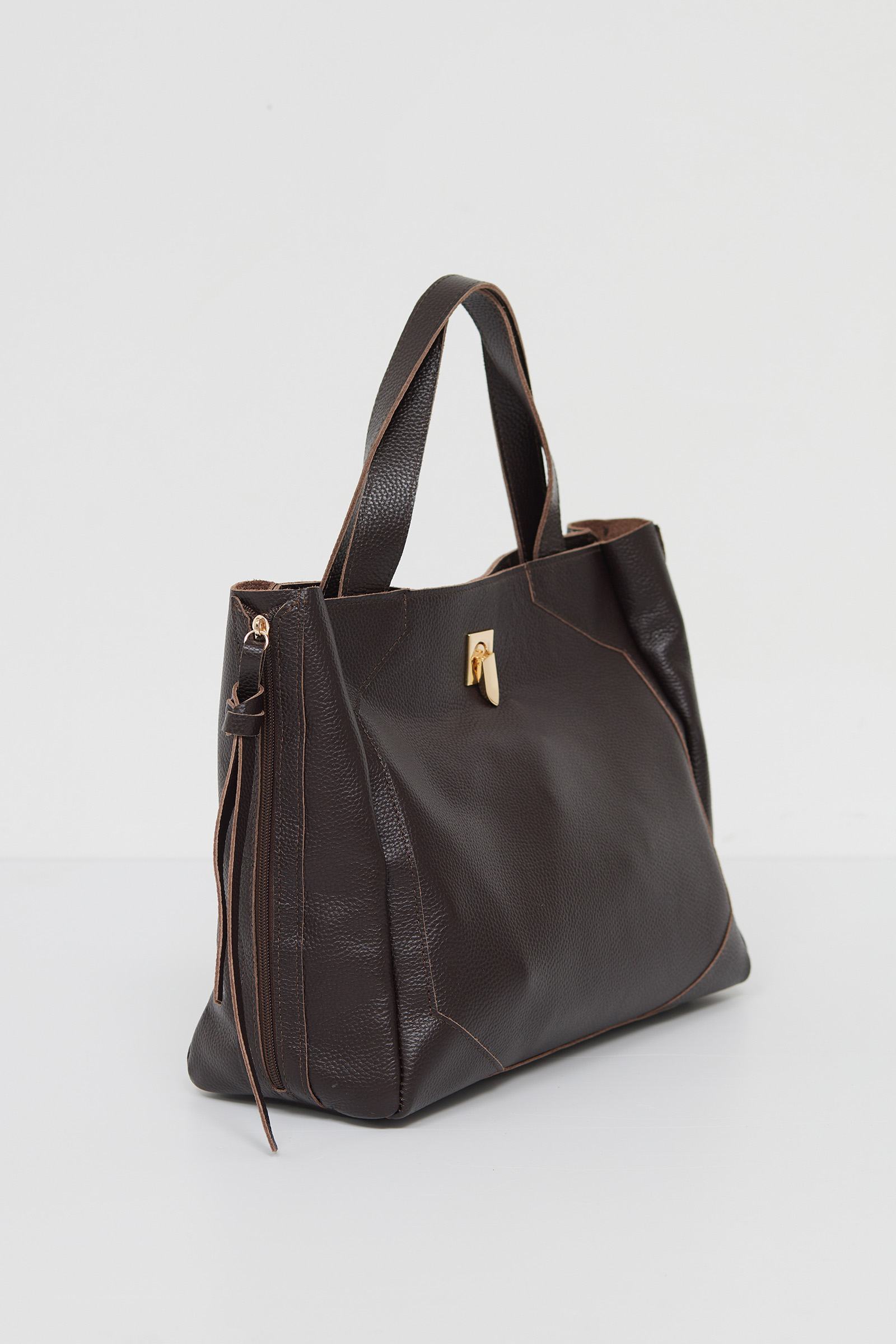 Вместительная сумка из натуральной кожи в стиле биркин с декоративными молниями. Одно большое отделение с внутренним карманом на молнии.