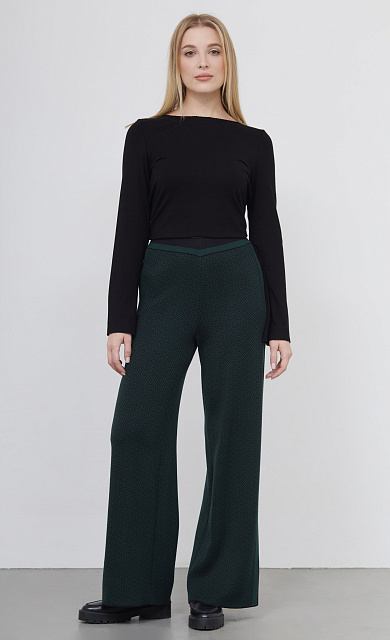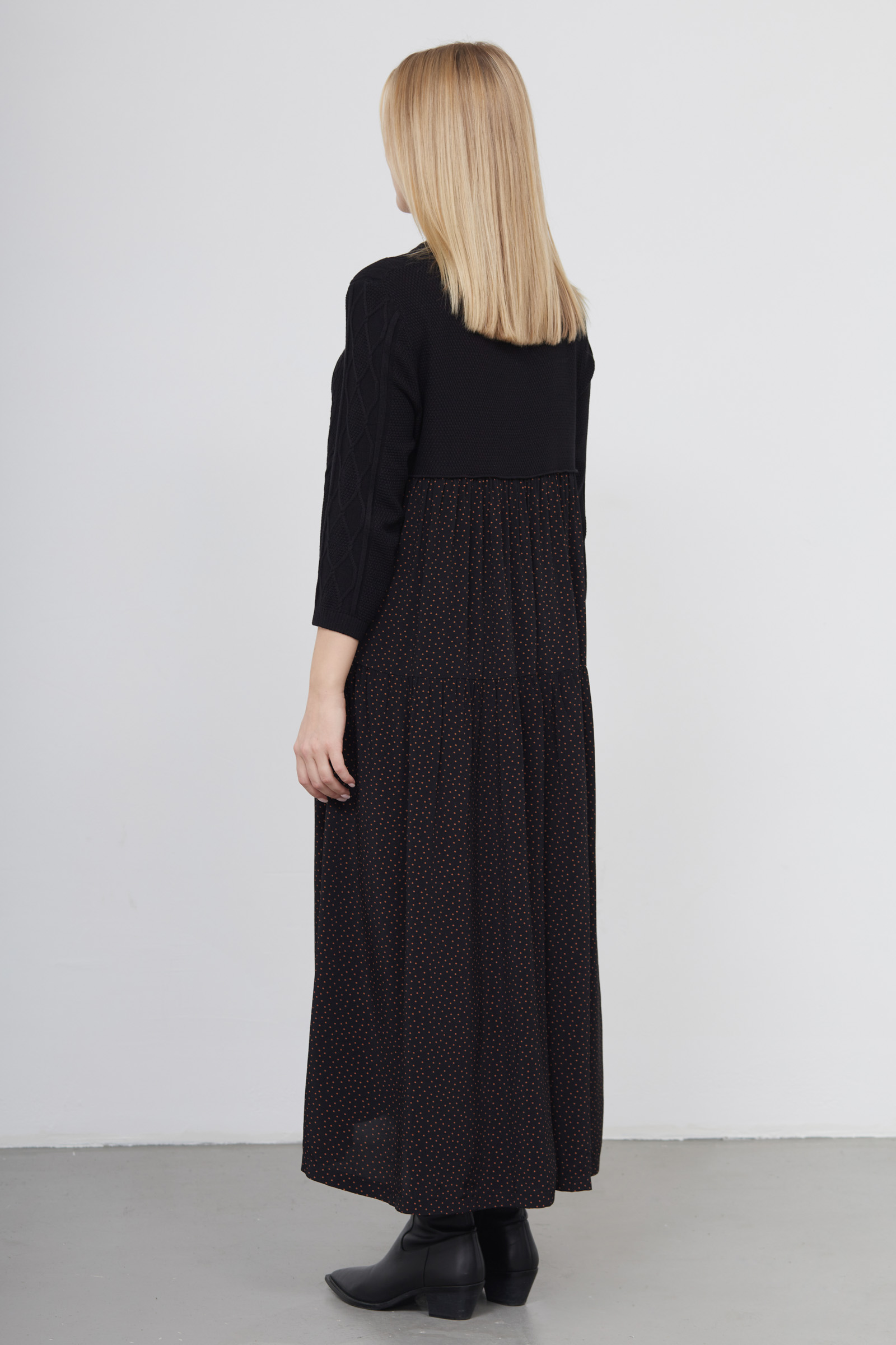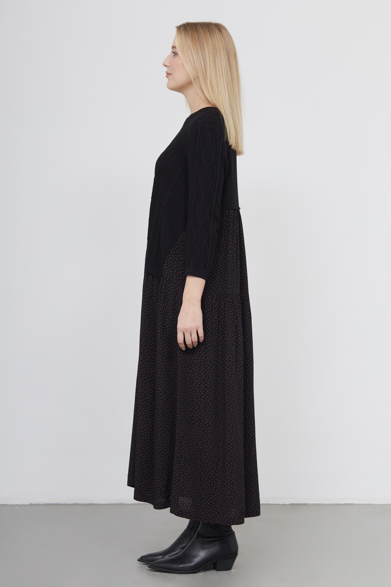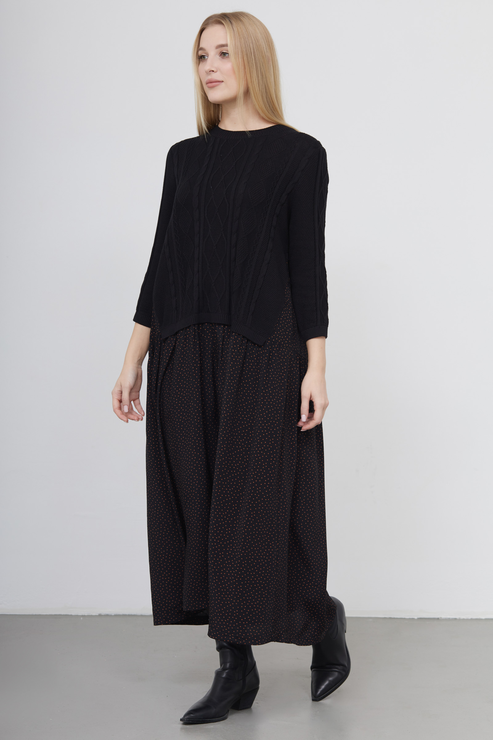 Комбинированное платье с имитацией джемпера и юбкой из вискозы в горошек.