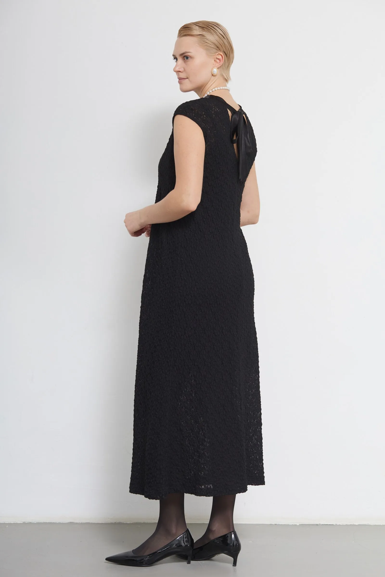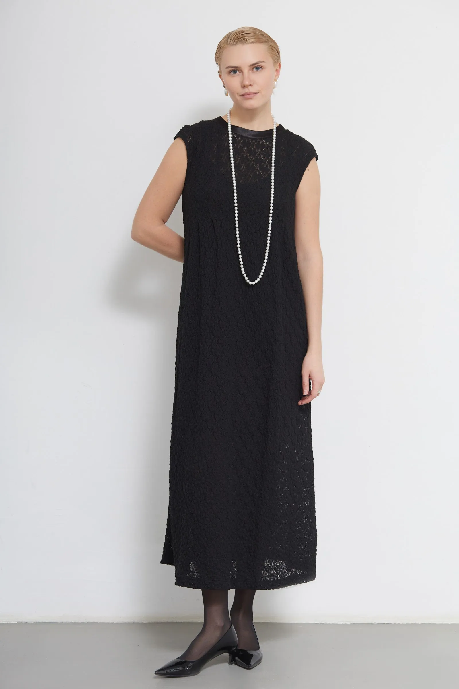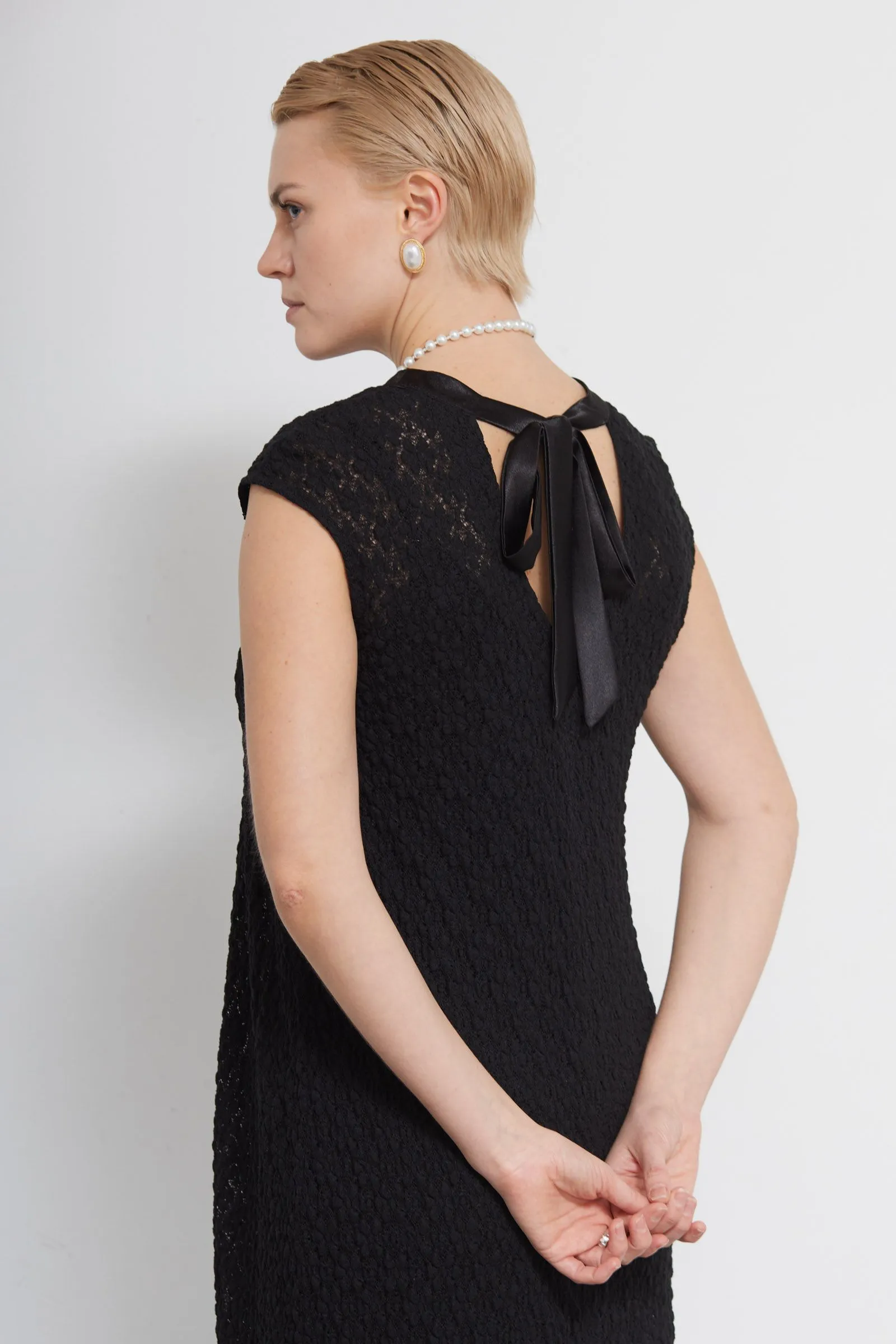 Платье из гипюра без рукавов, с нижней сорочкой из вискозного трикотажа на бретелях и атласными завязками на спинке.