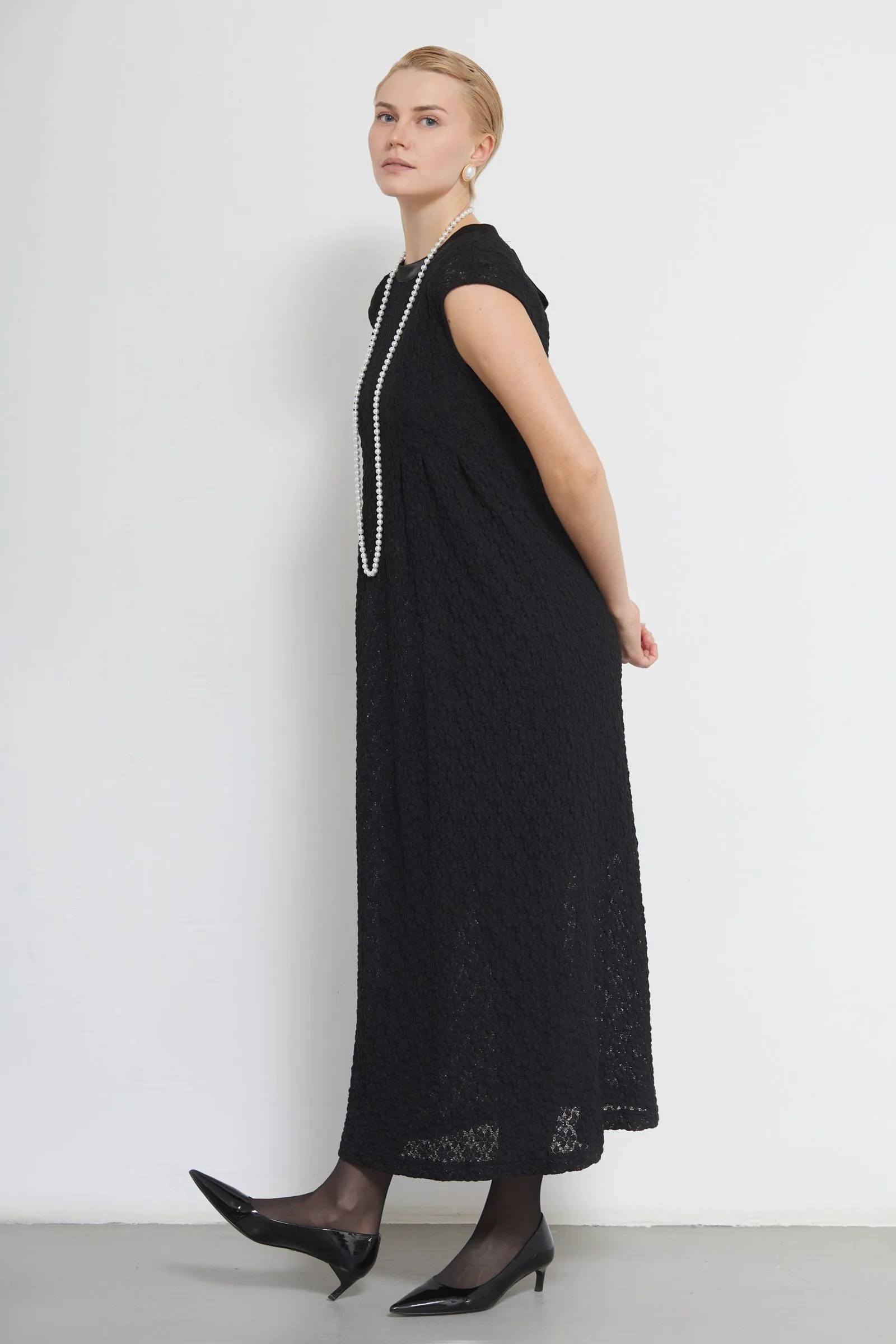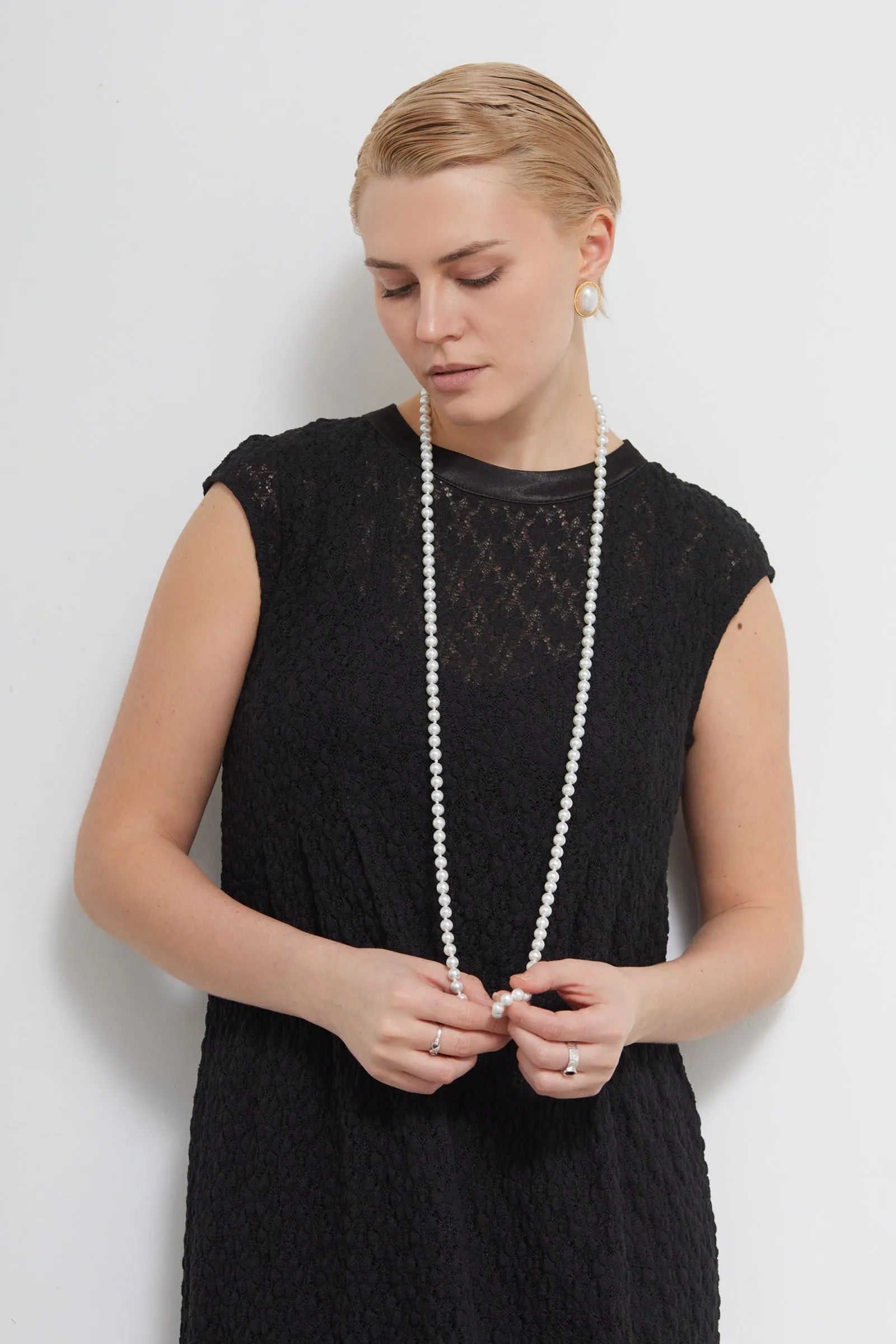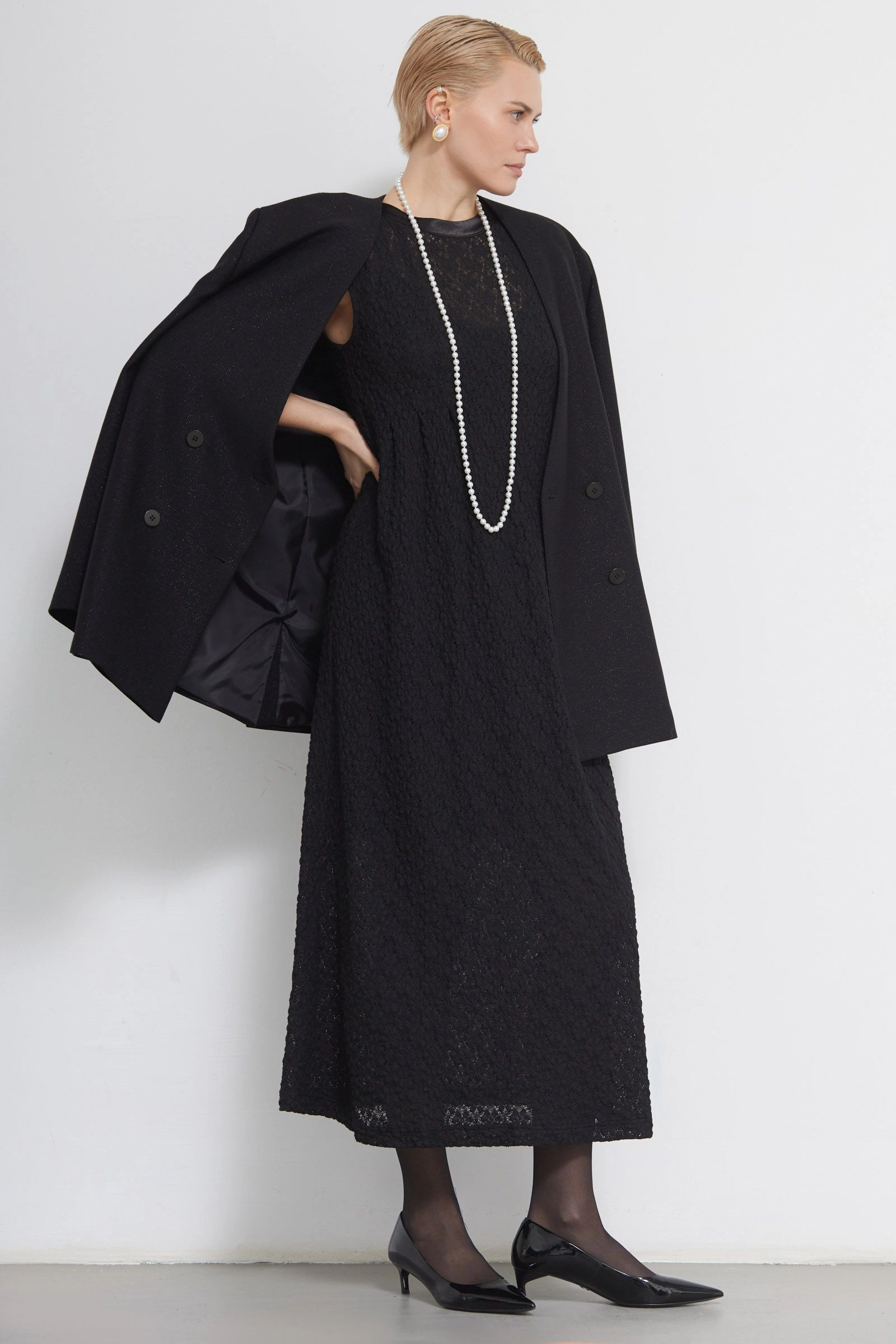 Платье из гипюра без рукавов, с нижней сорочкой из вискозного трикотажа на бретелях и атласными завязками на спинке.