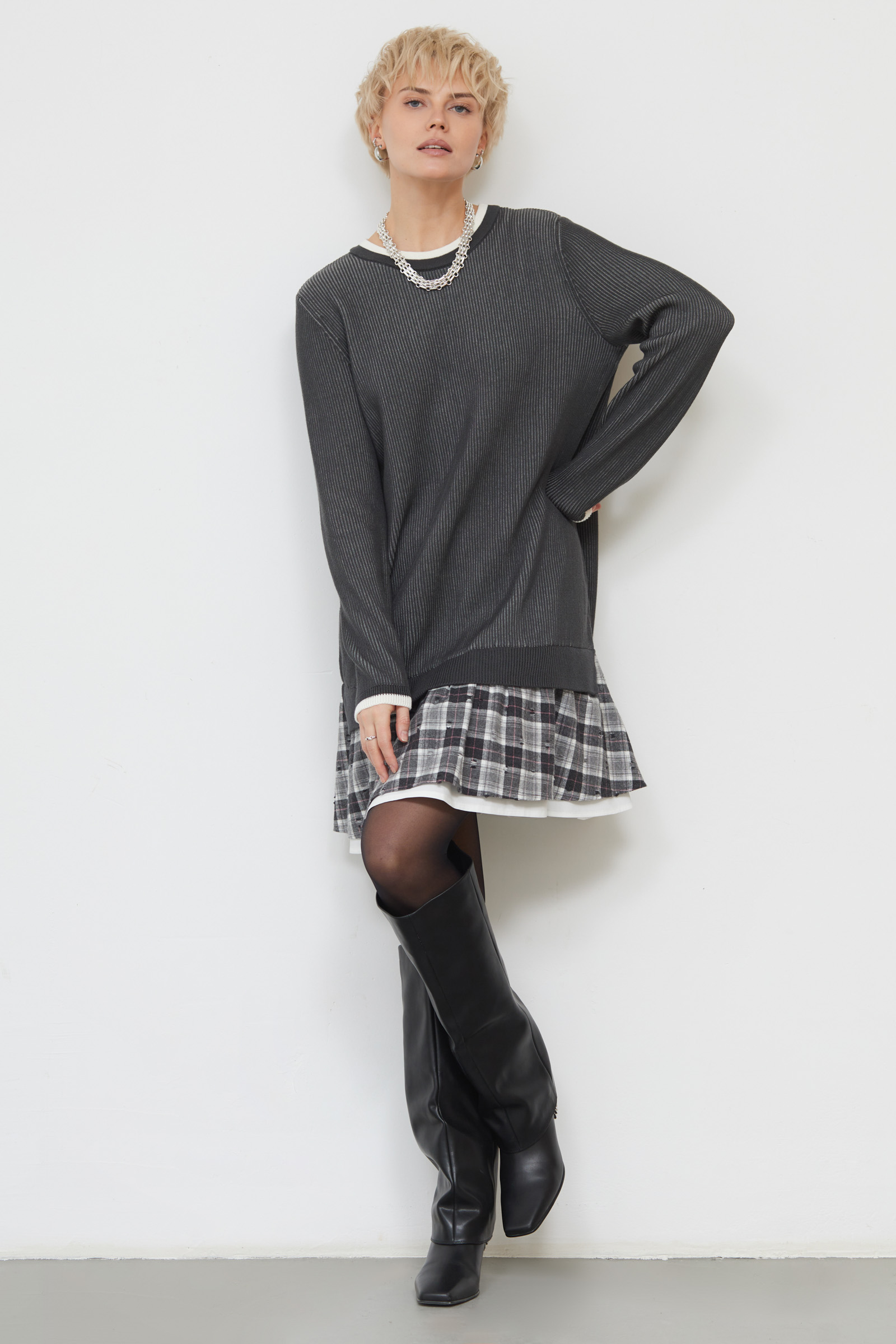 Комбинированное платье oversize из вязаного трикотажа в рубчик с фланелевым воланом в клетку.