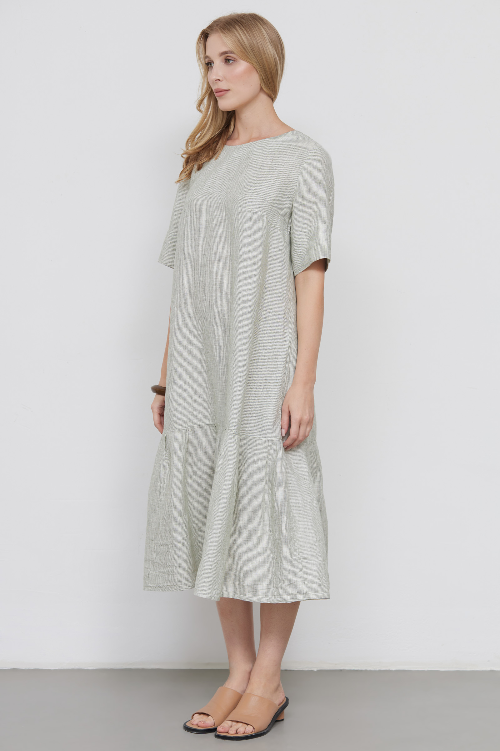 Платье oversize из стираного льна в полоску с воланом.
