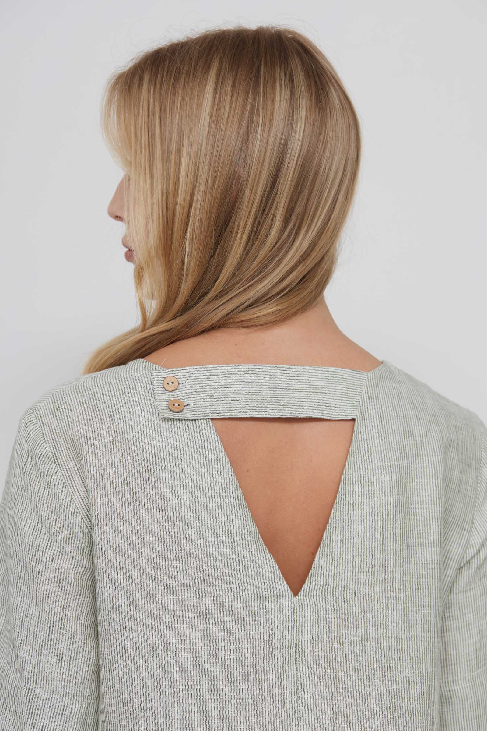 - Круглый вырез горловины спереди, V-образный на спинке с перемычкой на пуговицах
