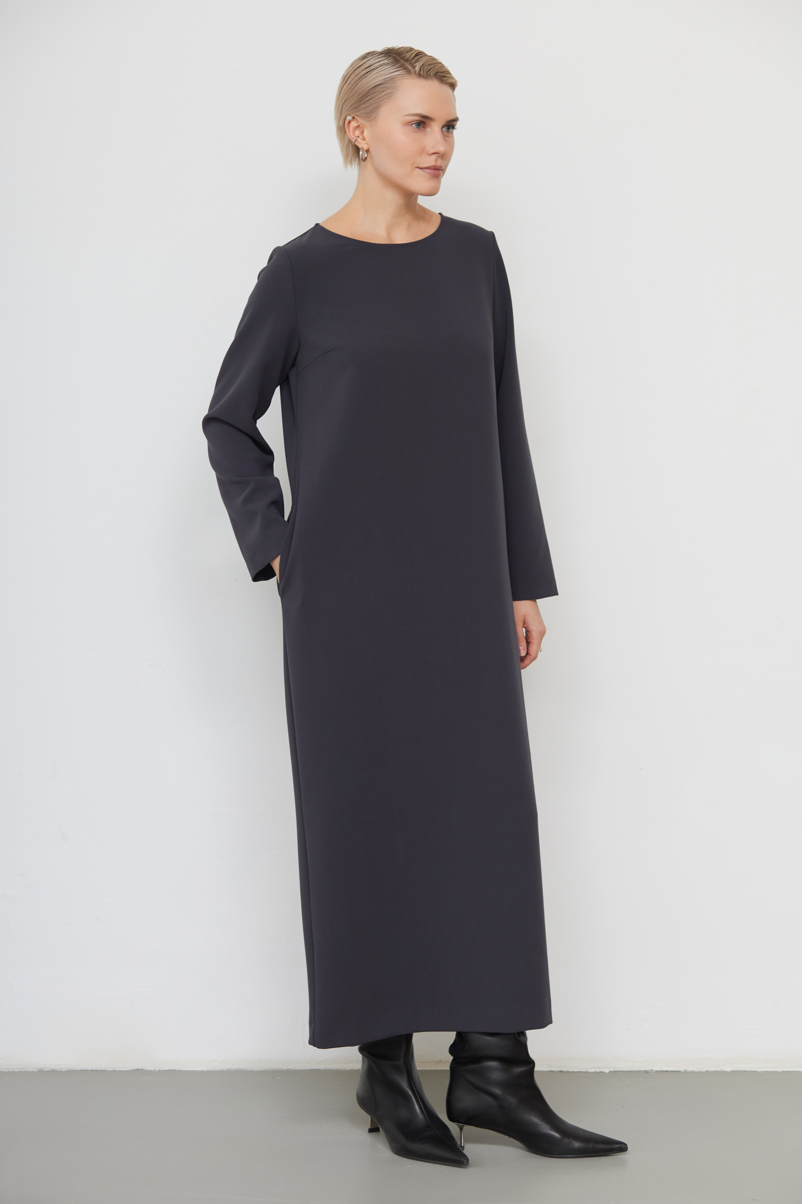 Платье oversize из плотной поливискозы с длинными рукавами.