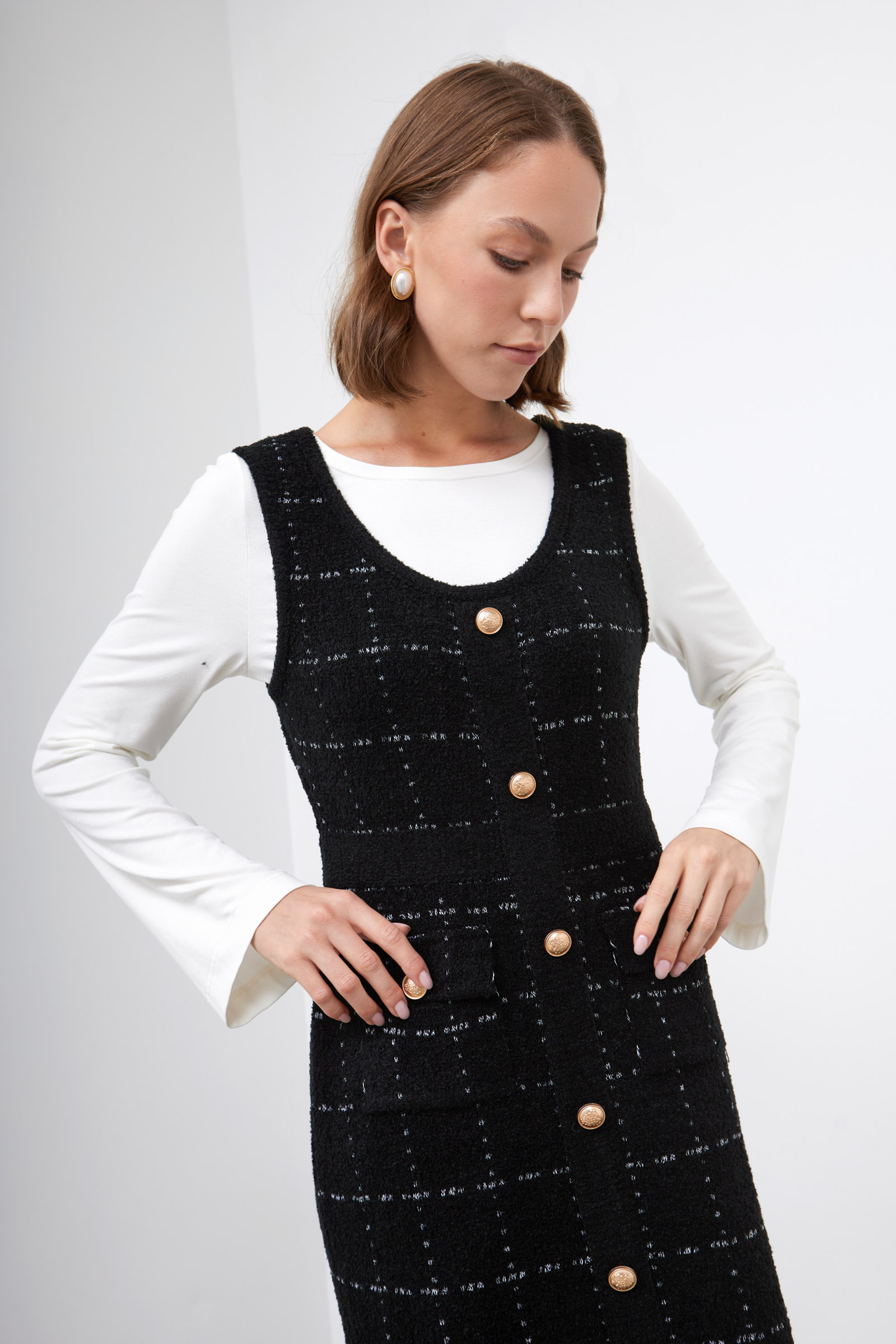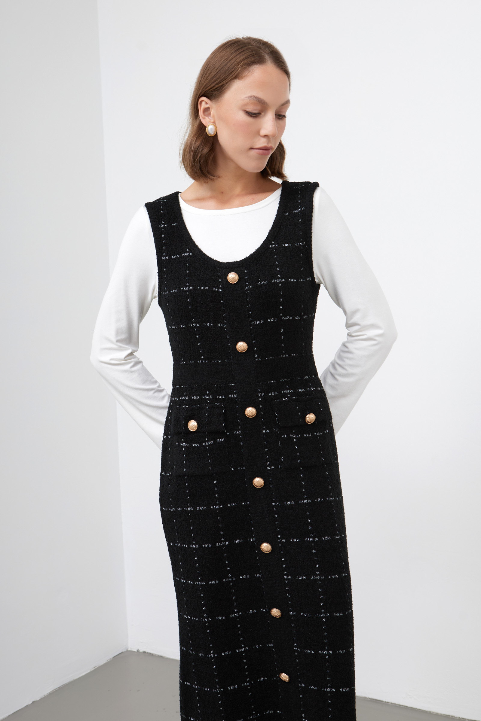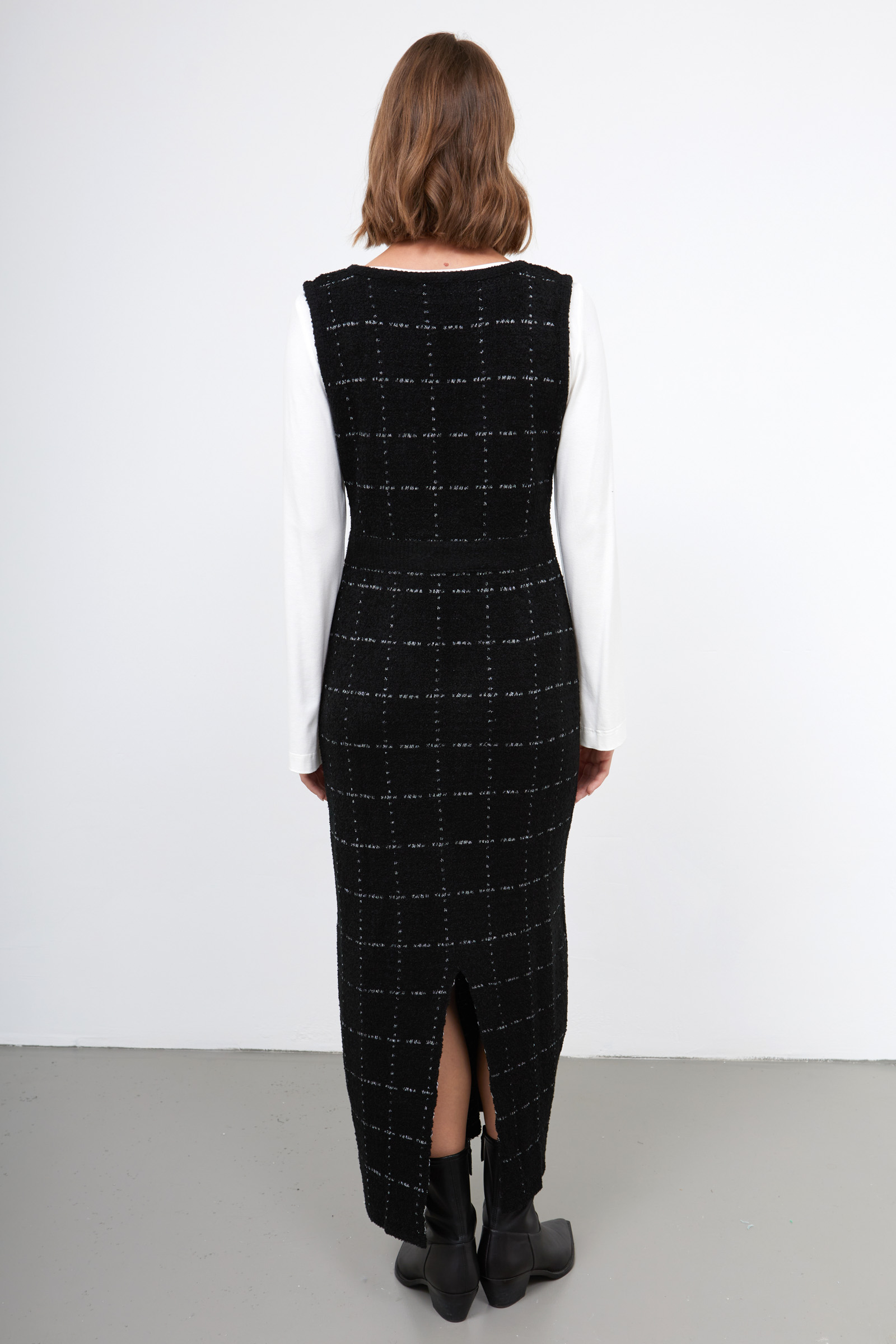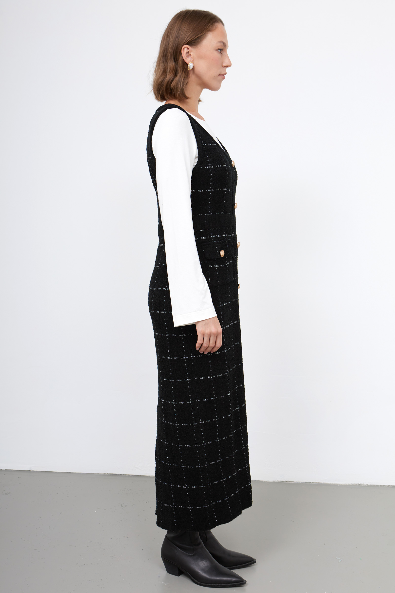 Длинный сарафан из буклированного трикотажа в клетку с декоративными пуговицами.