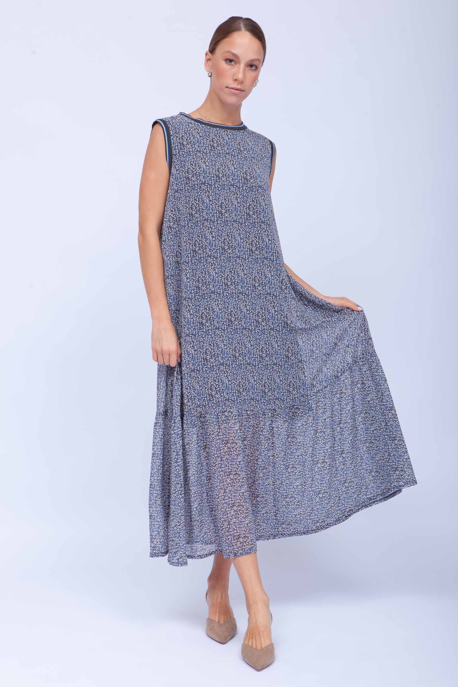 Сарафан oversize из шифона с цветочным принтом и трикотажной отделкой.