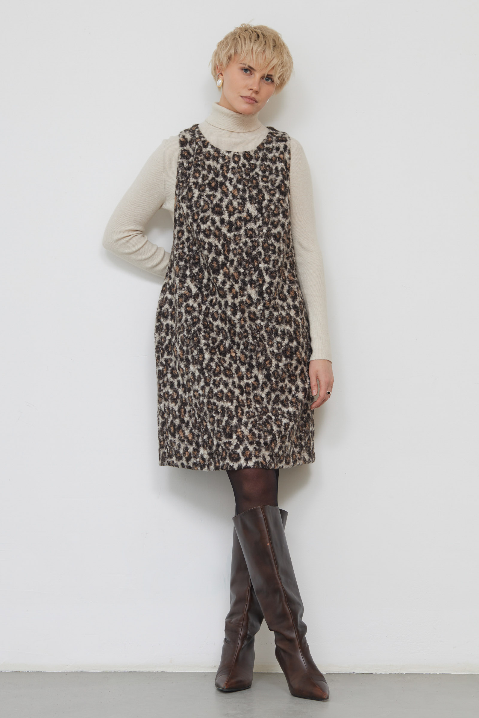 Сарафан из буклированной ткани с анималистичным принтом.
