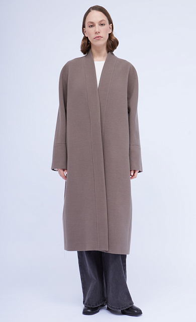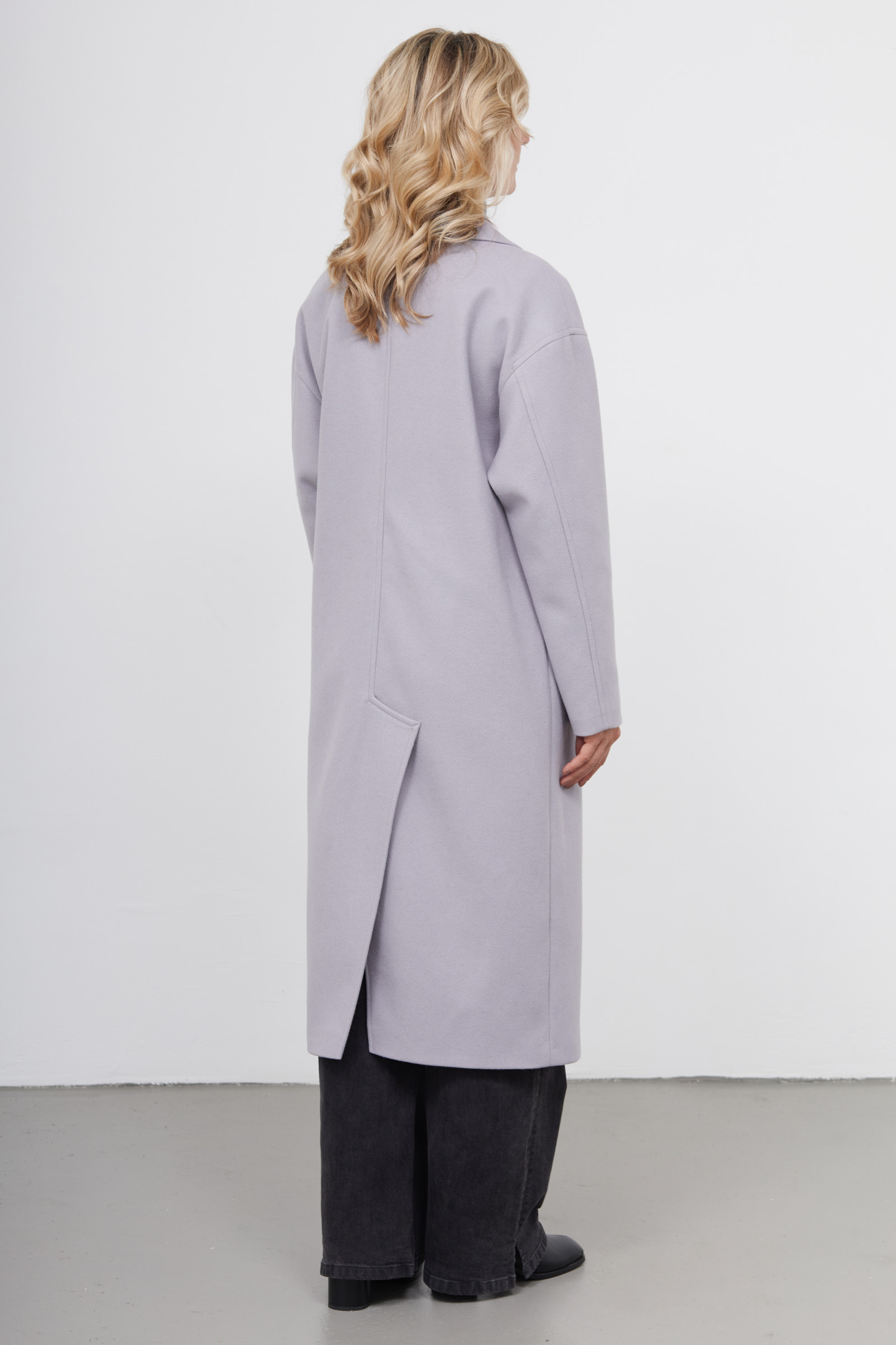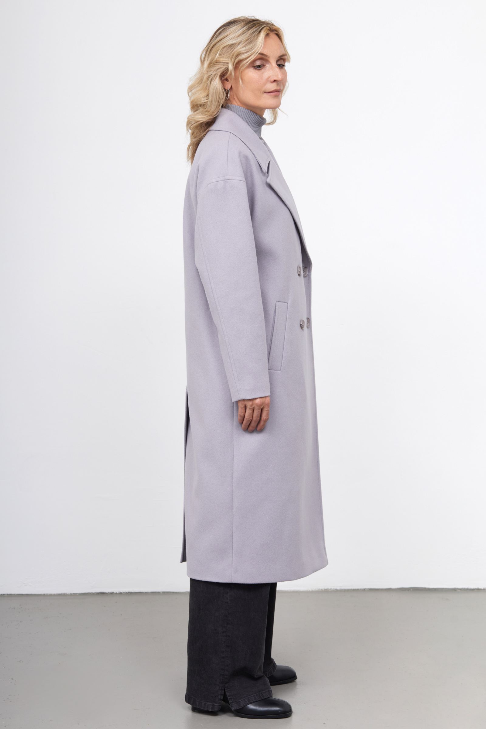 Двубортное пальто oversize с английским воротником и скошенной шлицей.