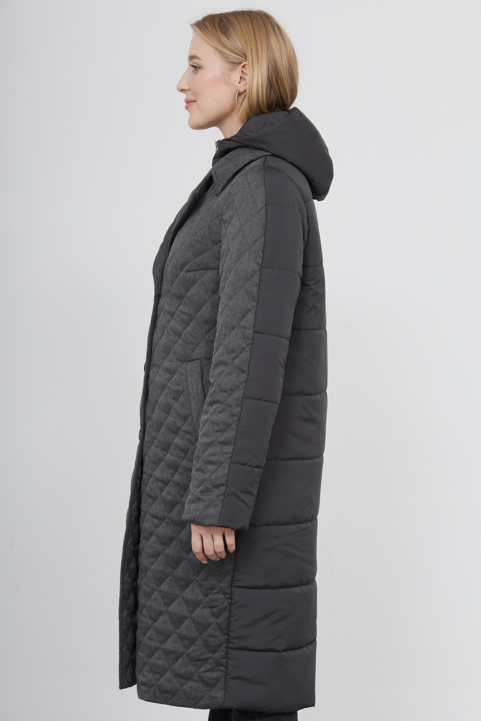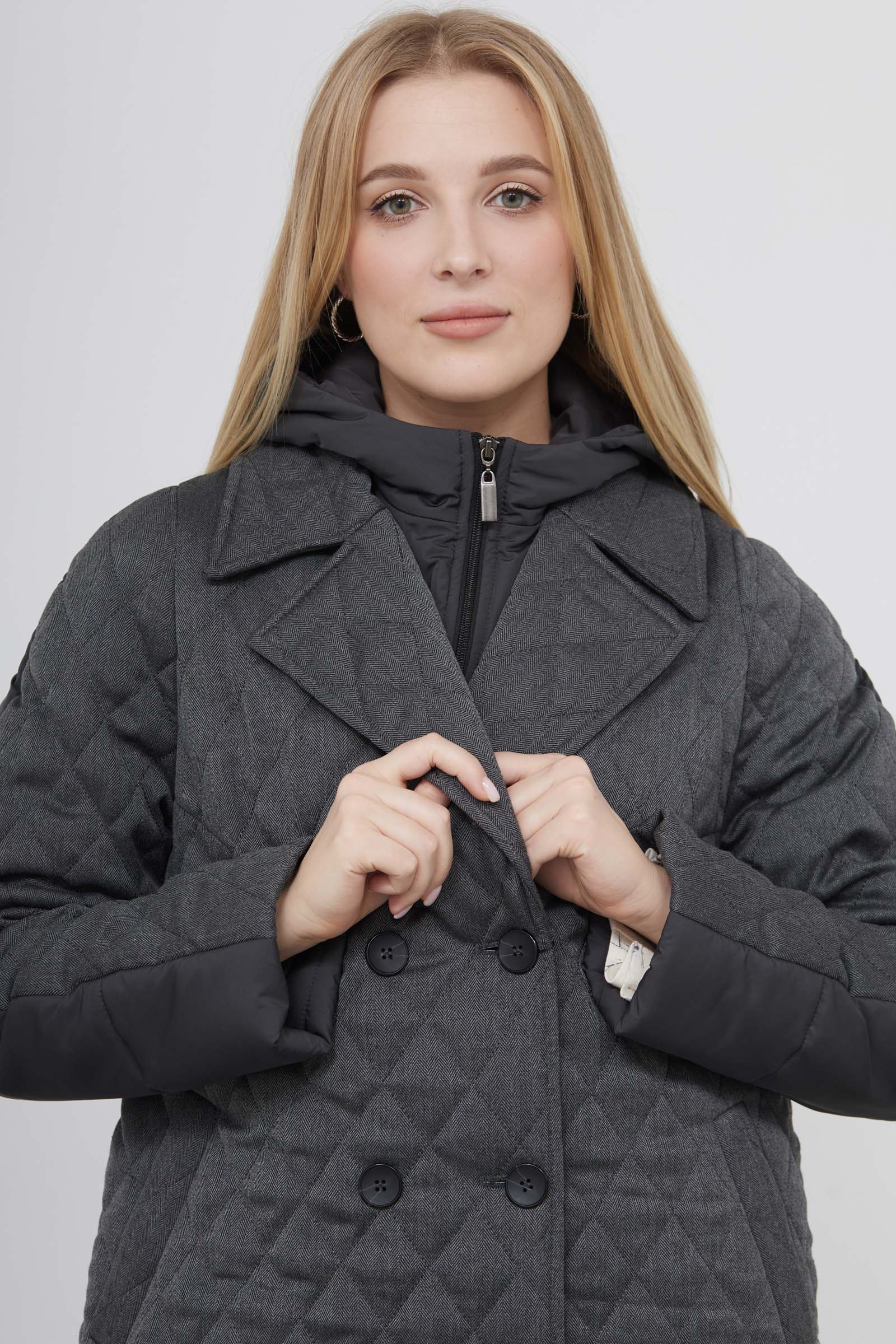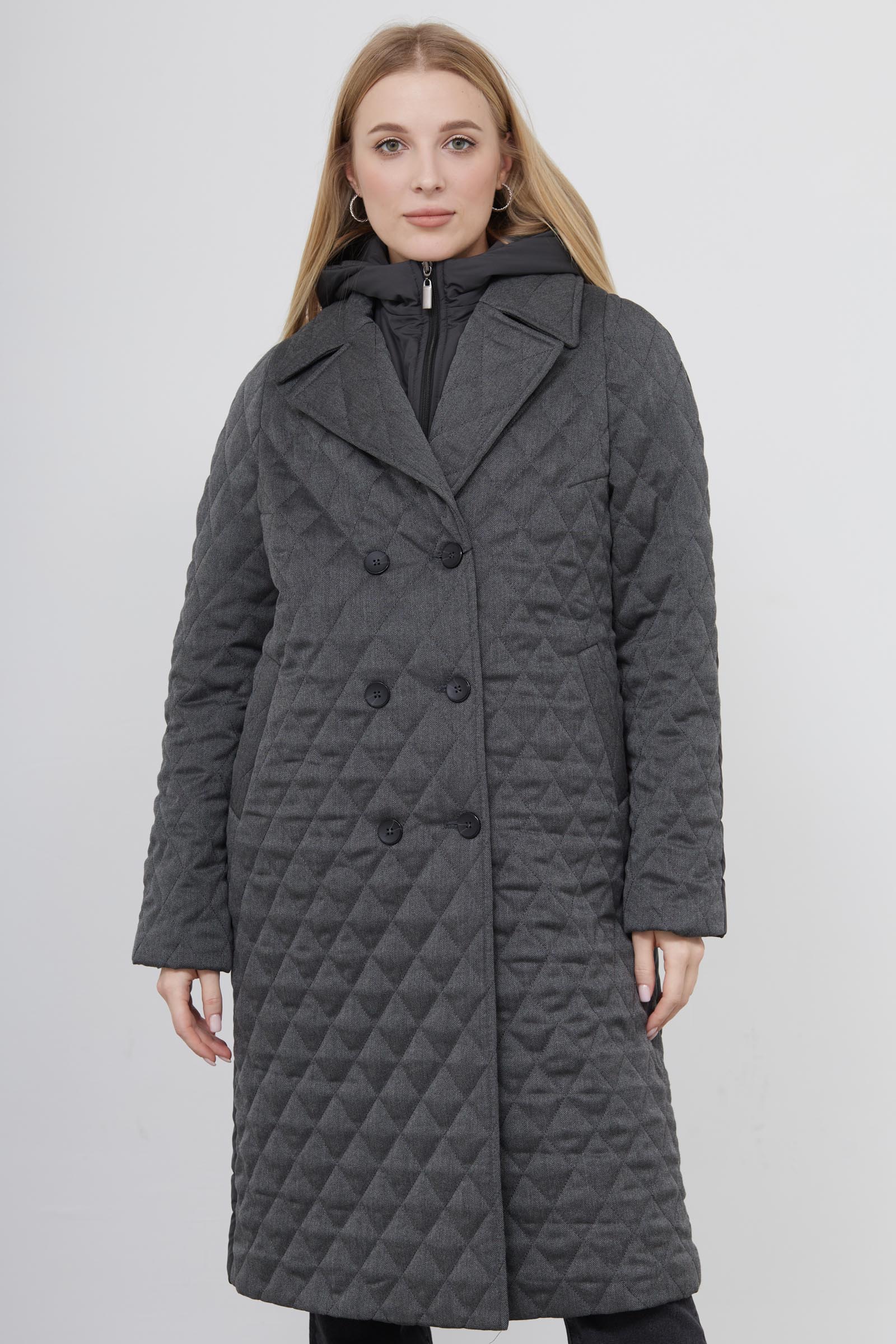 Комбинированное стеганое пальто с внутренним жилетом и капюшоном.