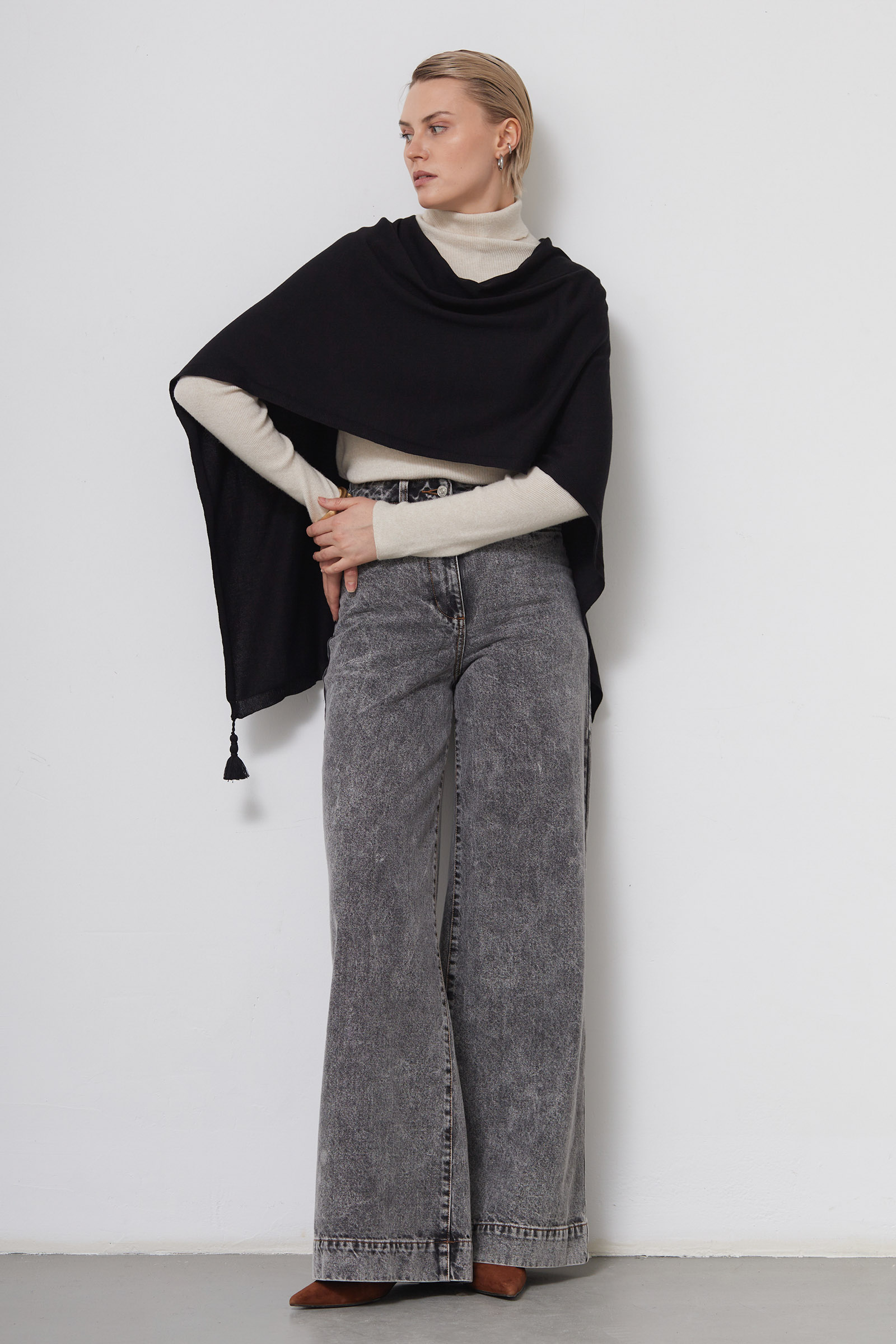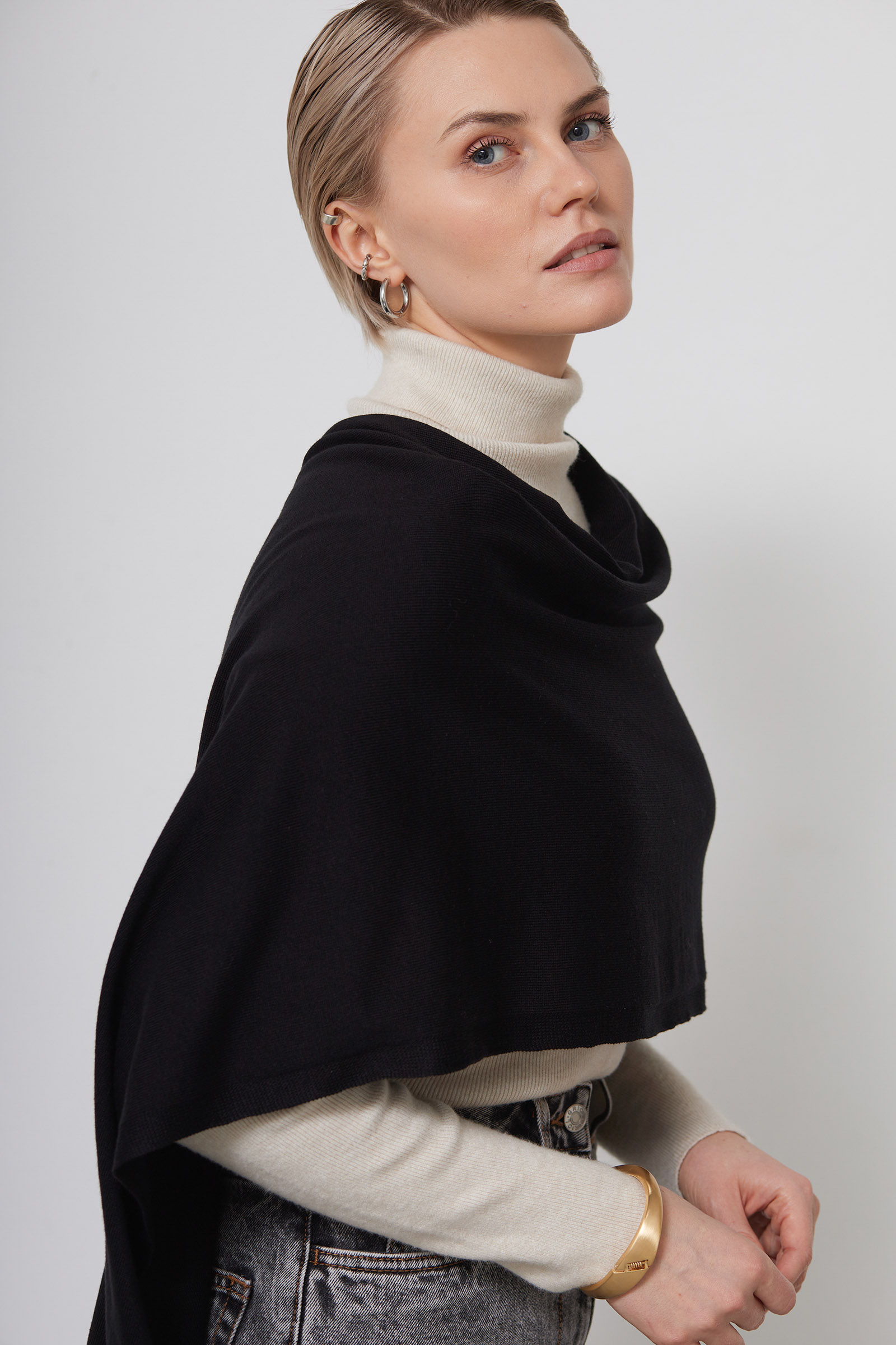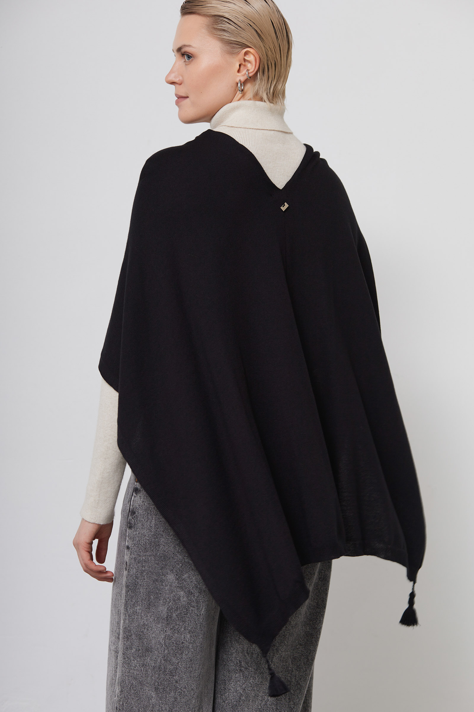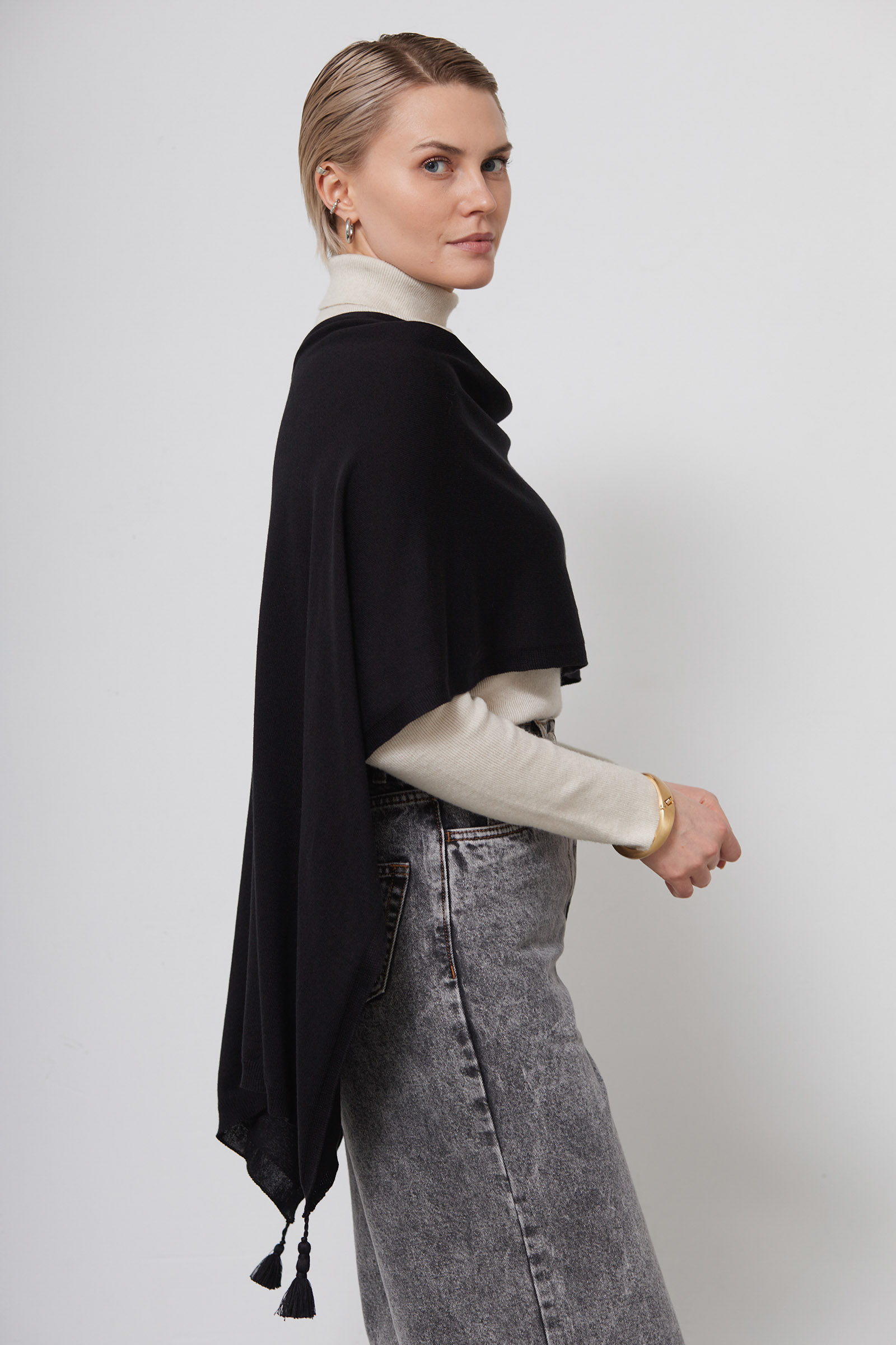 Шарф-накидка из тонкого вязаного трикотажа с декоративными кисточками на концах.
