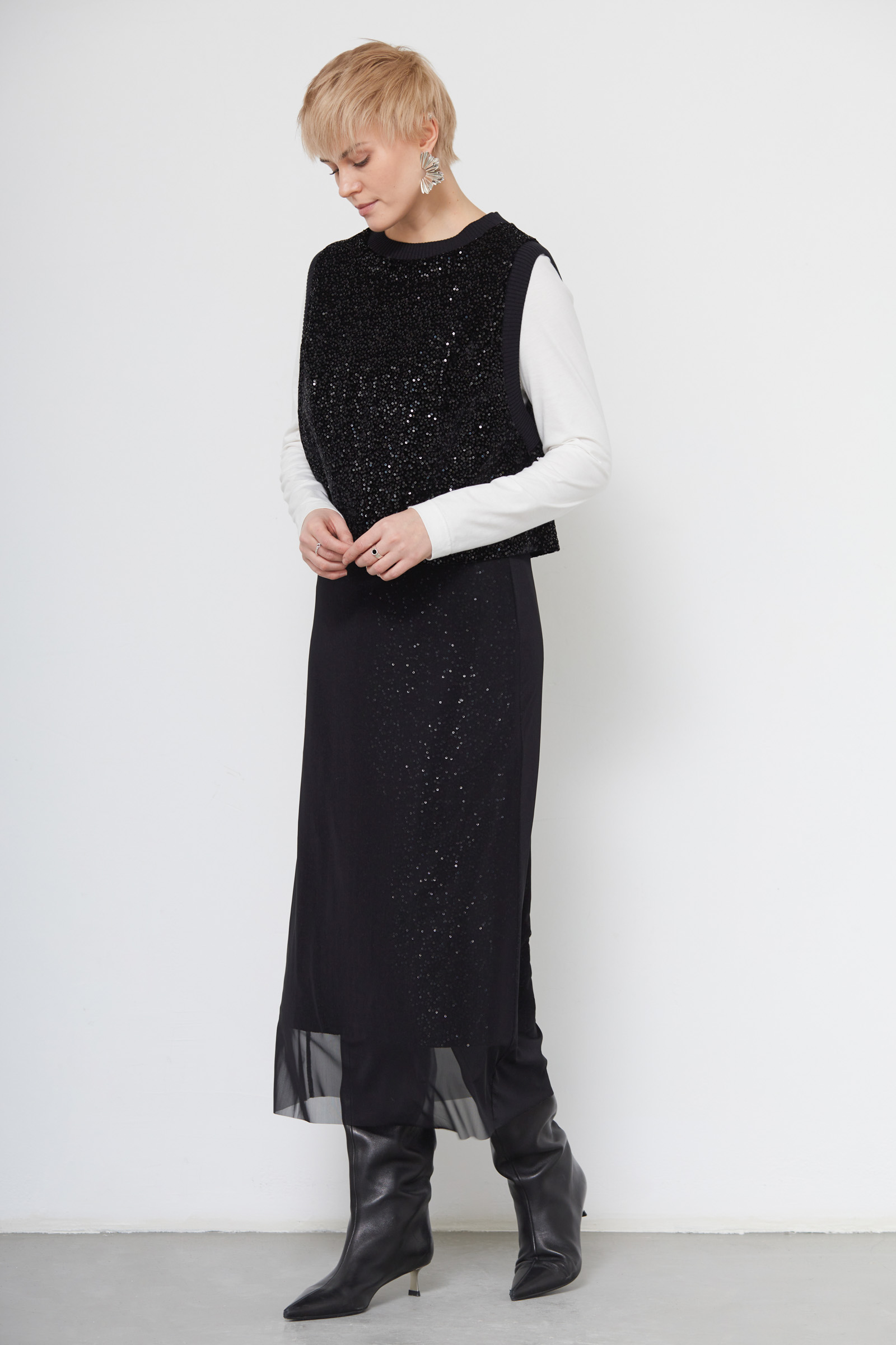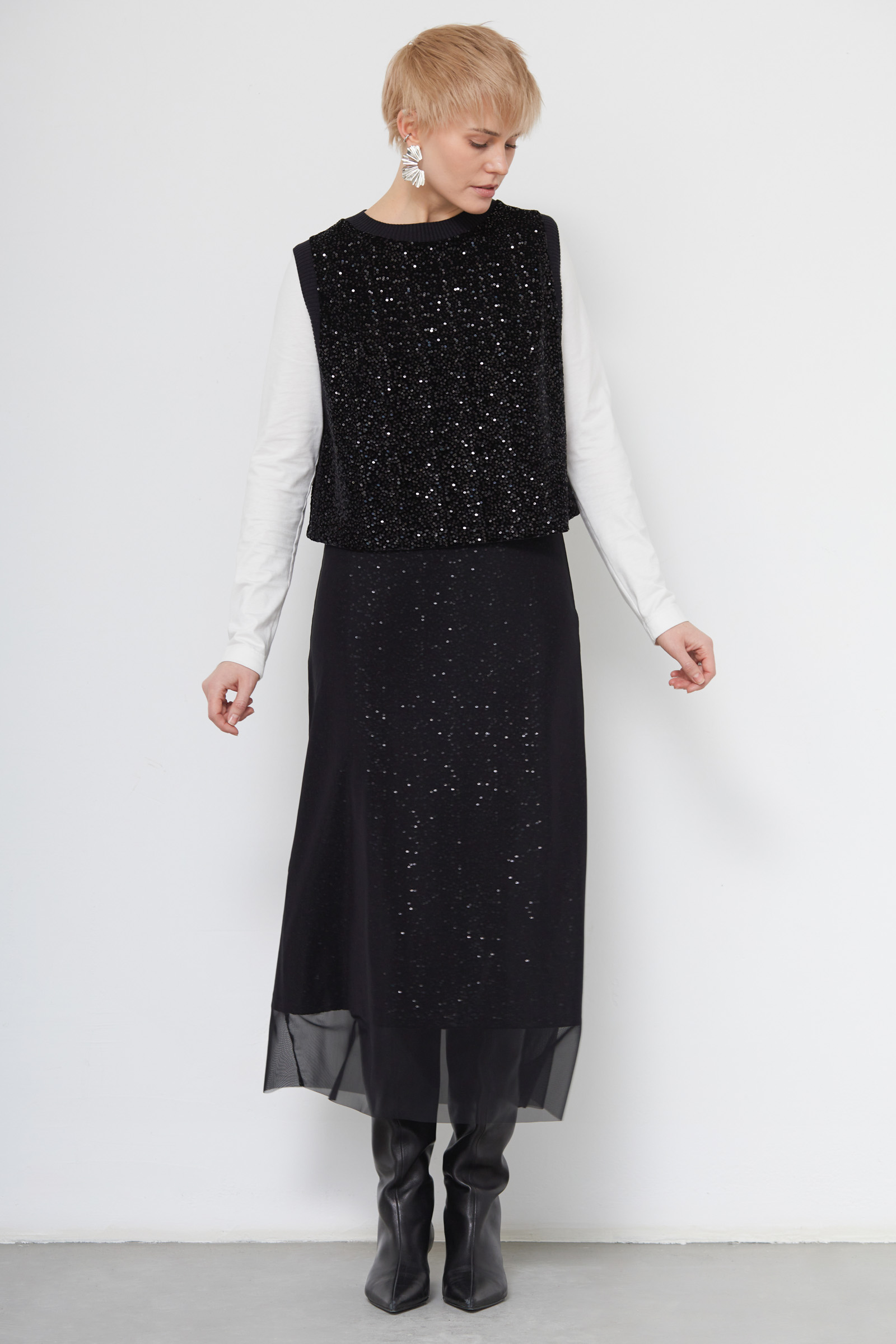 Двуслойная юбка миди из бархата с пайетками и сеткой сверху.