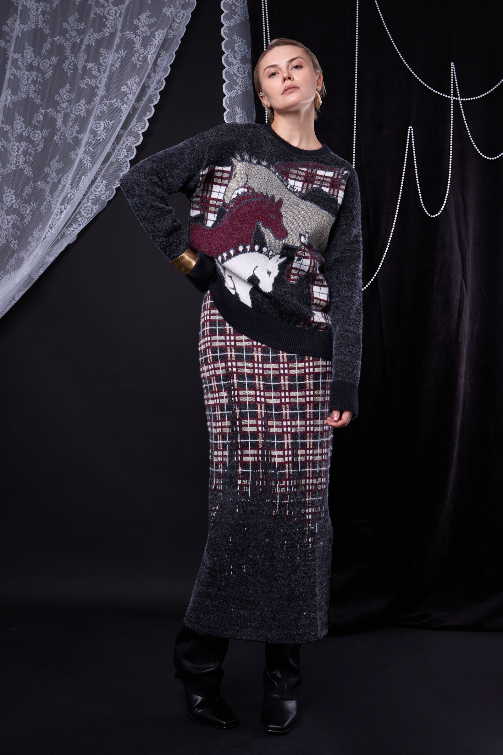 Длинная юбка из мягкого пушистого трикотажа жаккардовой вязки с люрексом и разрезом.