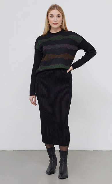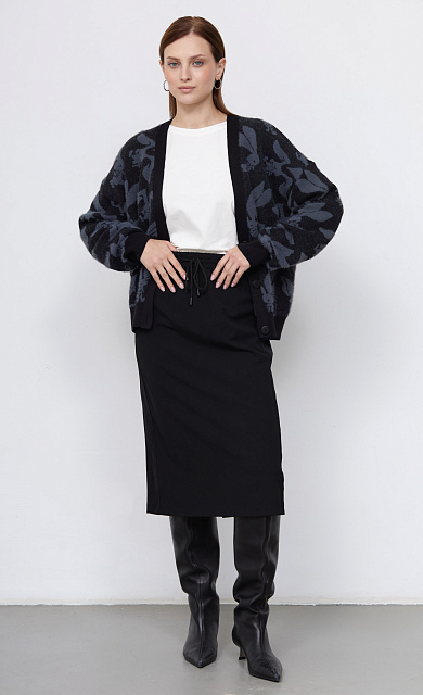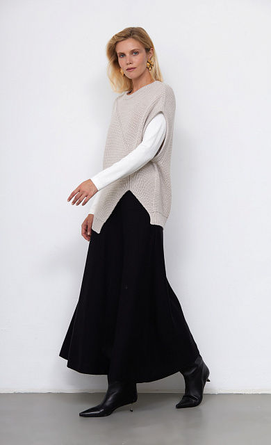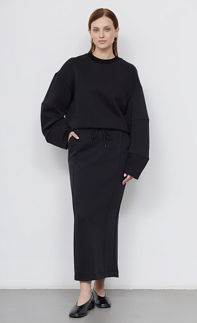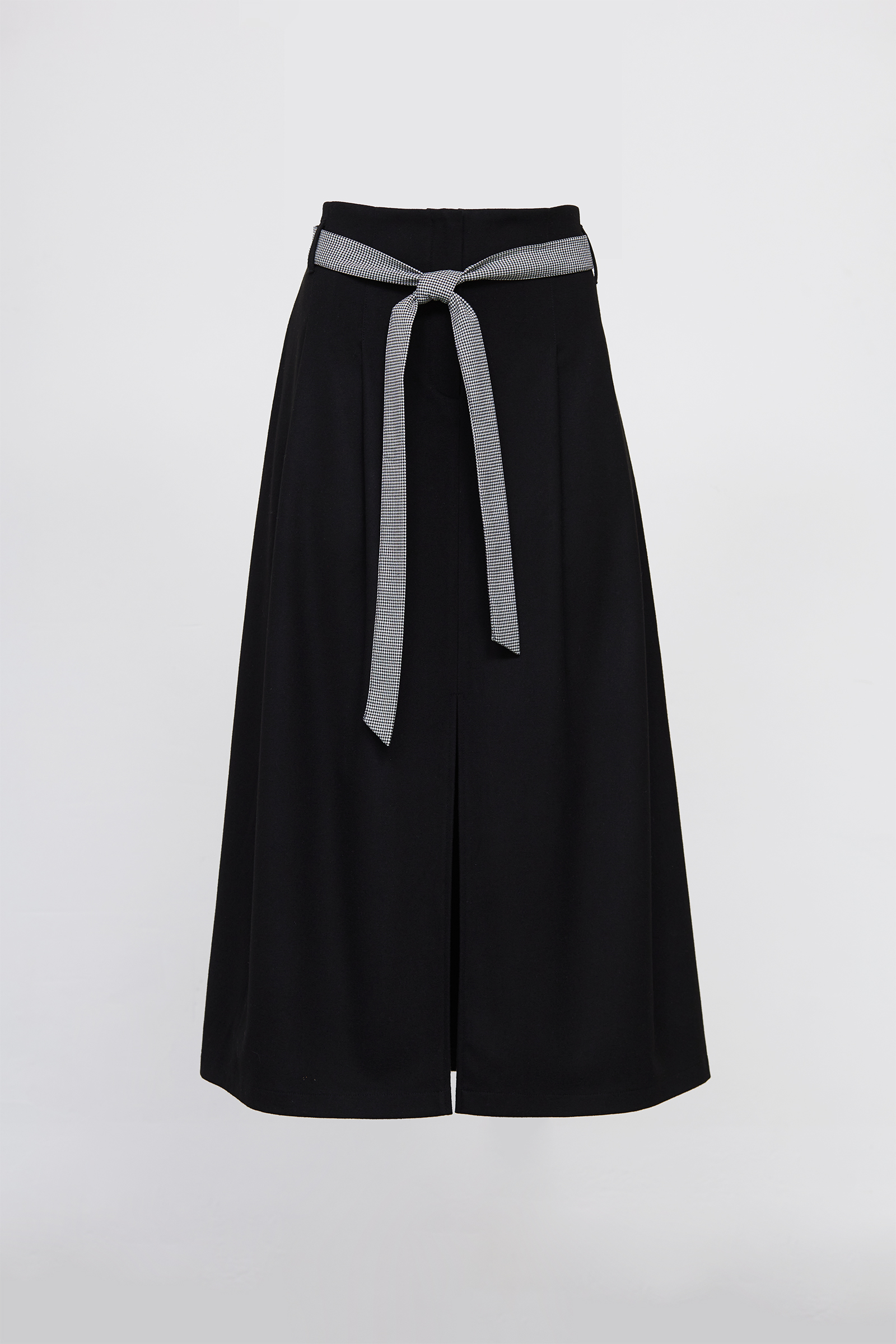Юбка из костюмной ткани с разрезом и контрастным поясом.