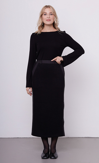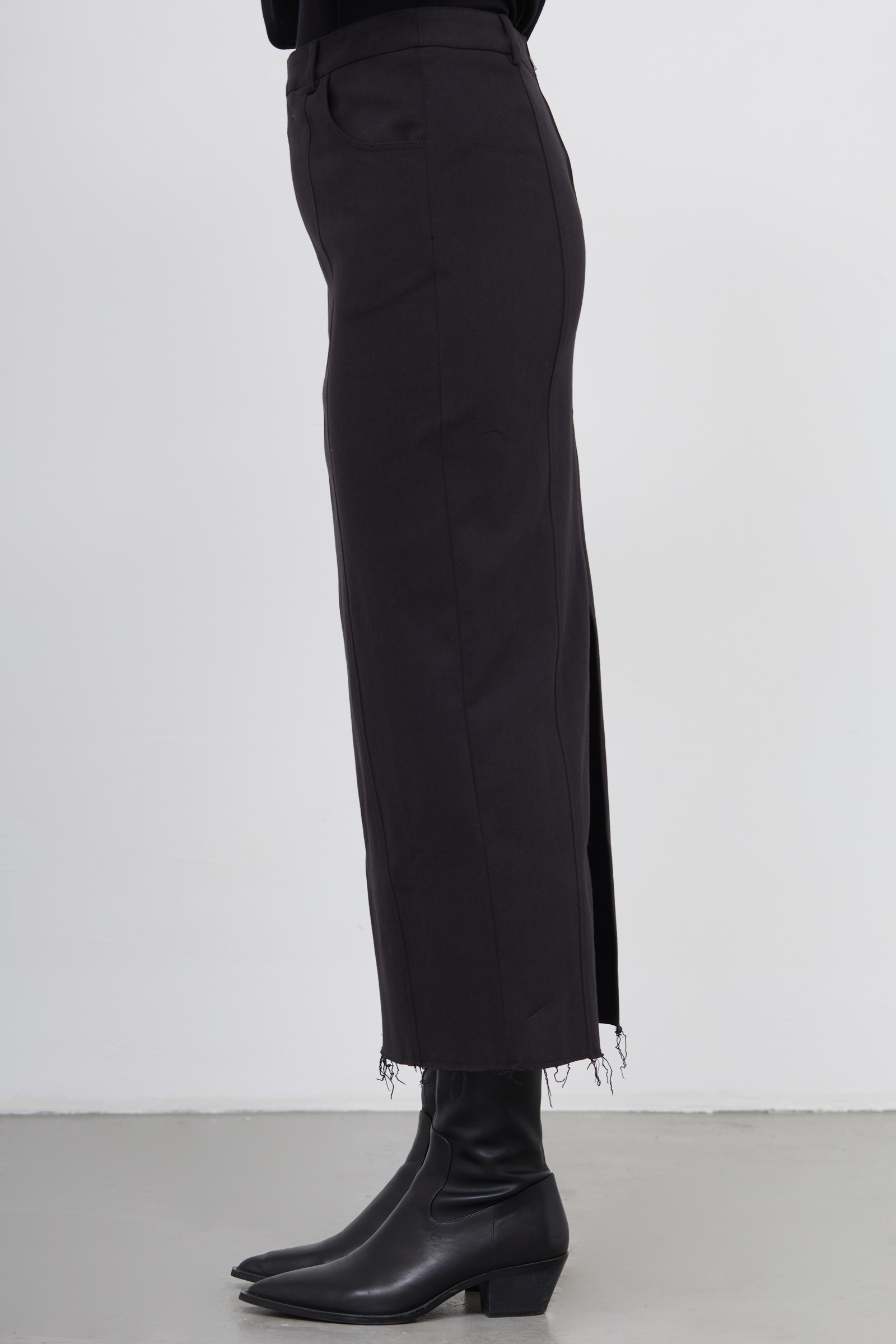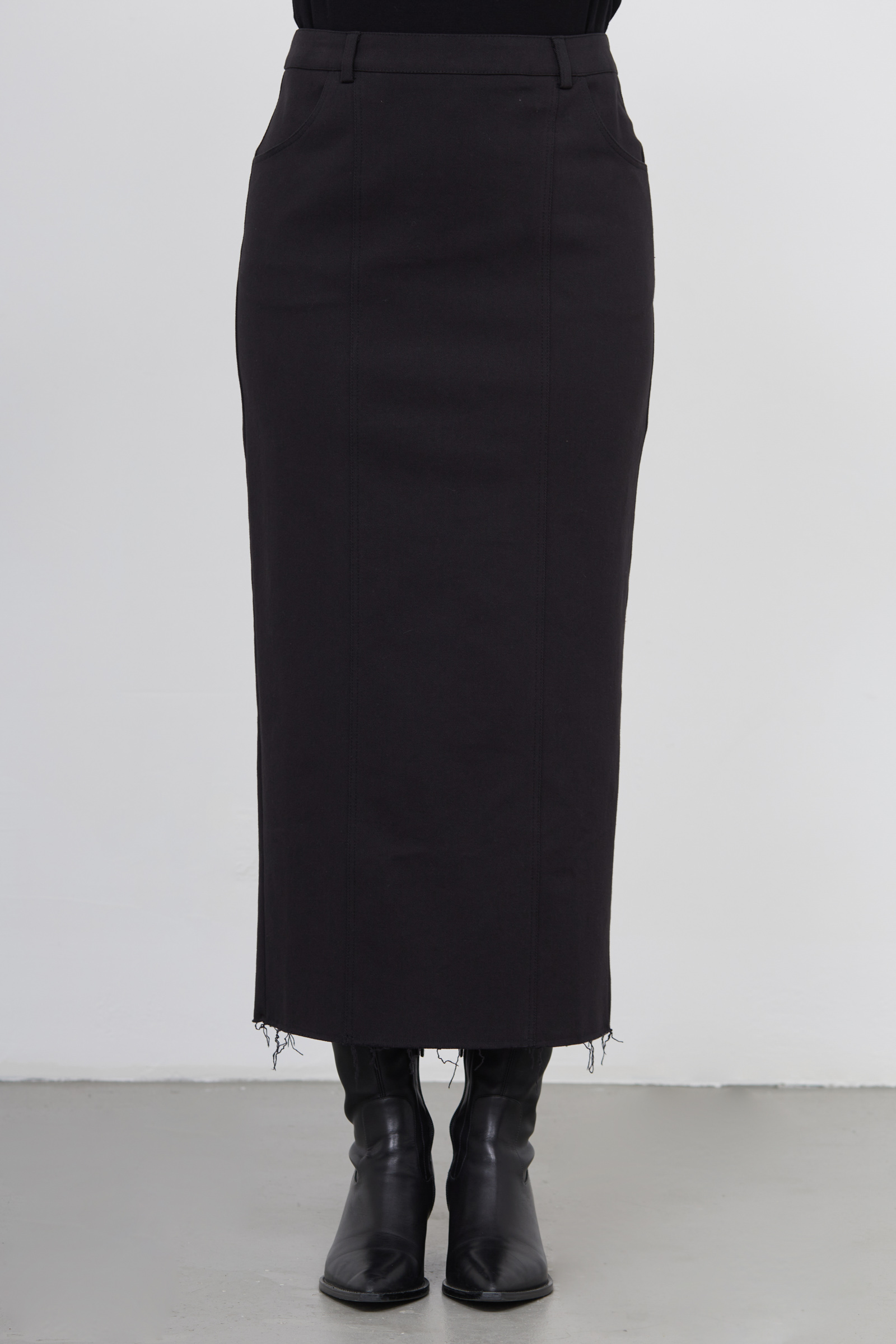 Юбка миди из эластичного денима с необработанным краем разрезом.