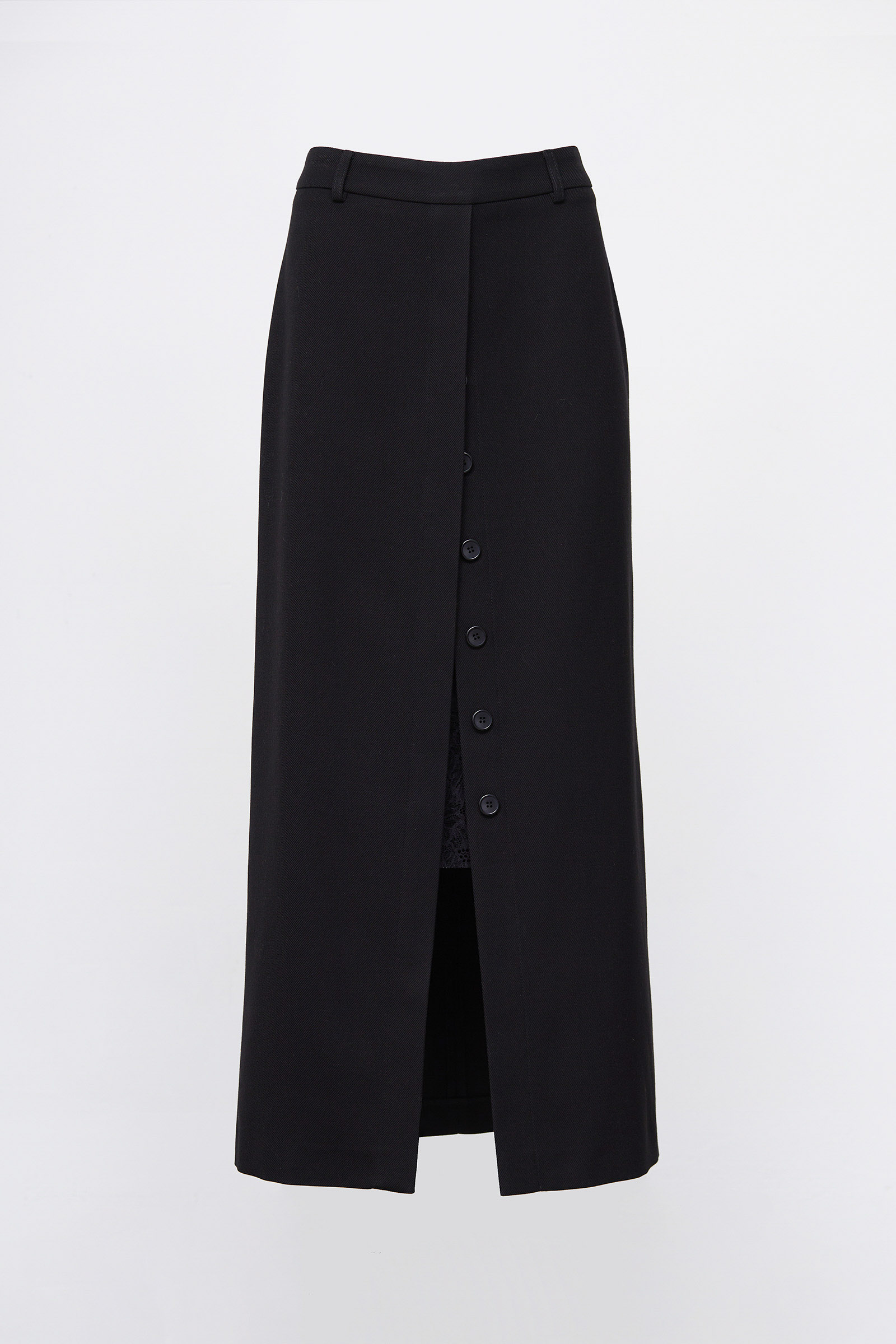 Длинная юбка из мягкой костюмной ткани с декоративными пуговицами и кружевной вставкой.